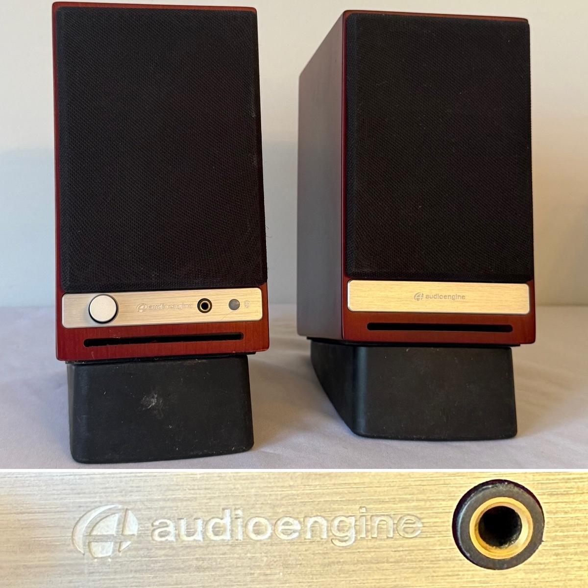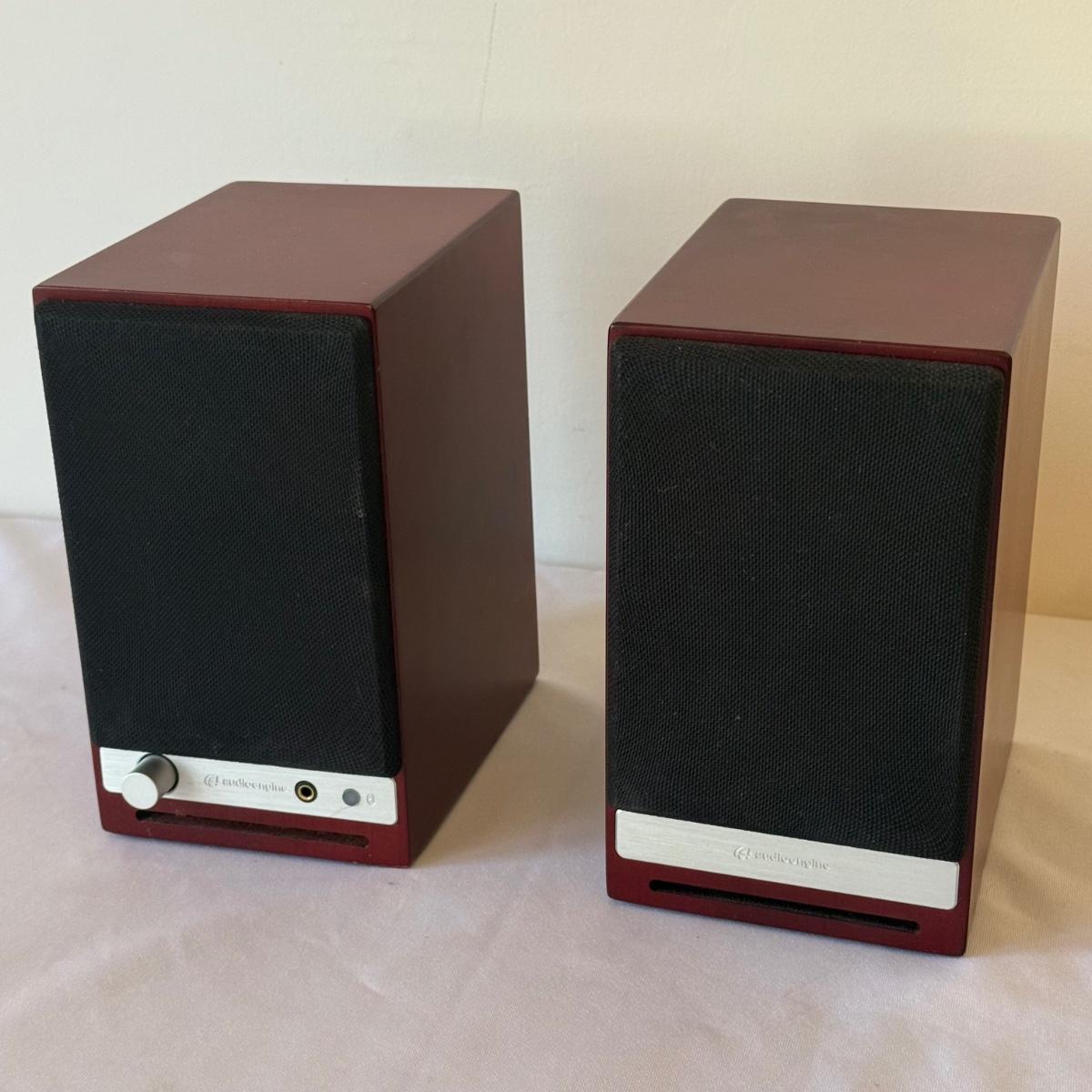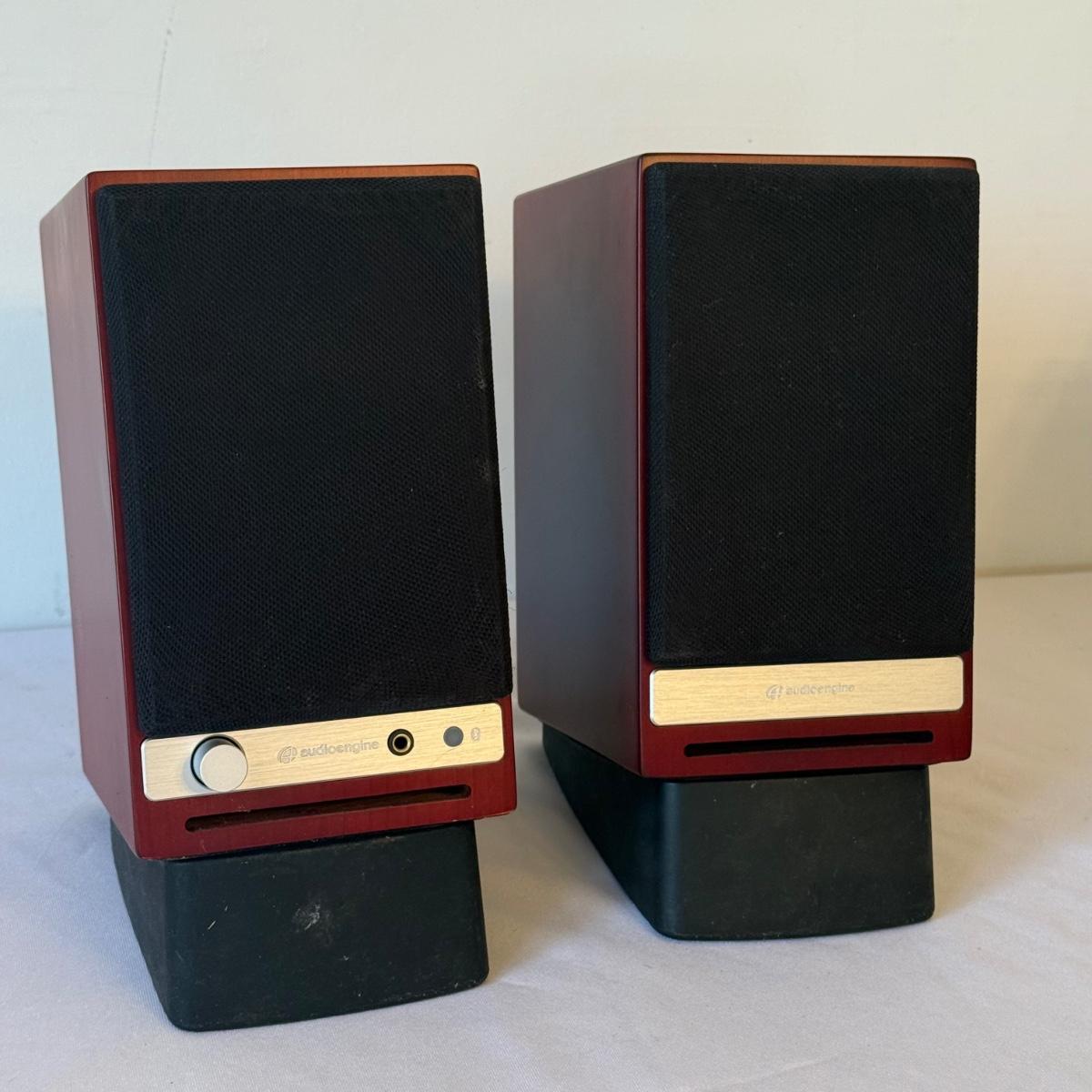 One pair of Audioengine HD3 speakers with Bluetooth capability. Also has USB input with cable and RCA jacks as well. Speakers are electrically powered and cable together from base. Has antenna, bass switch and front volume on/off knob. Set of two angled stands plus one extra stand. Speakers measure 4" x 5.5" x 7"H, stands are 4" x 6" x 2"H. Speakers powered on when plugged in and paired to a bluetooth device. See photos for details. Shipping available.