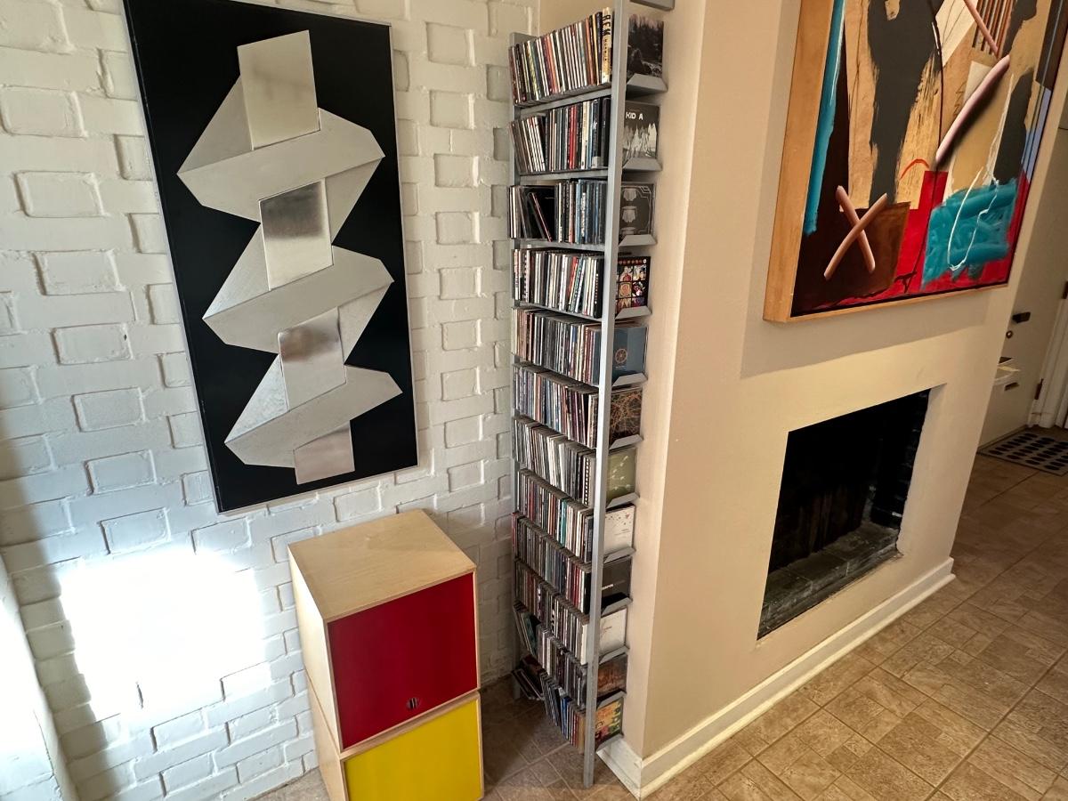 Two tall stands full of CDs.