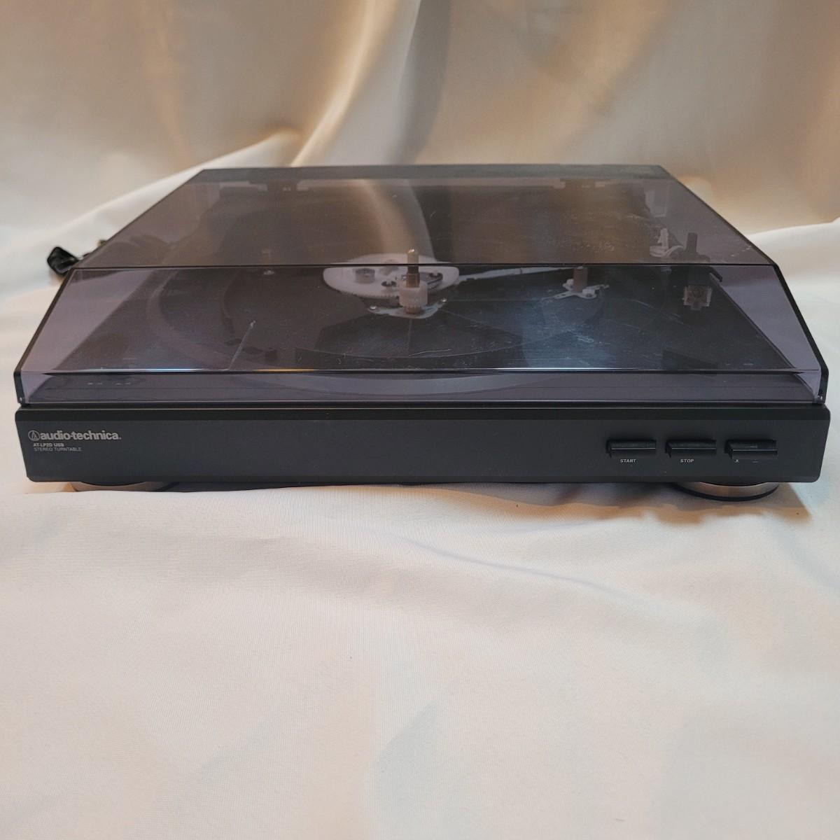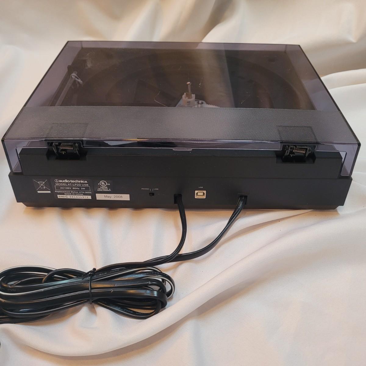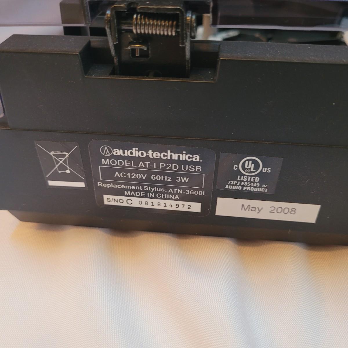 Audio-Technica brand AT-LP2D USB turntable. Equipped with a USB output that allows direct connection to your computer for vinyl to digital conversion. The turntable also features a built-in switchable phono/line preamp that allows connection to a stereo system equipped with either a phono or line-level input. Most parts are new in the package. Powers on when plugged in. Measures 14" x 14" x 4"H.