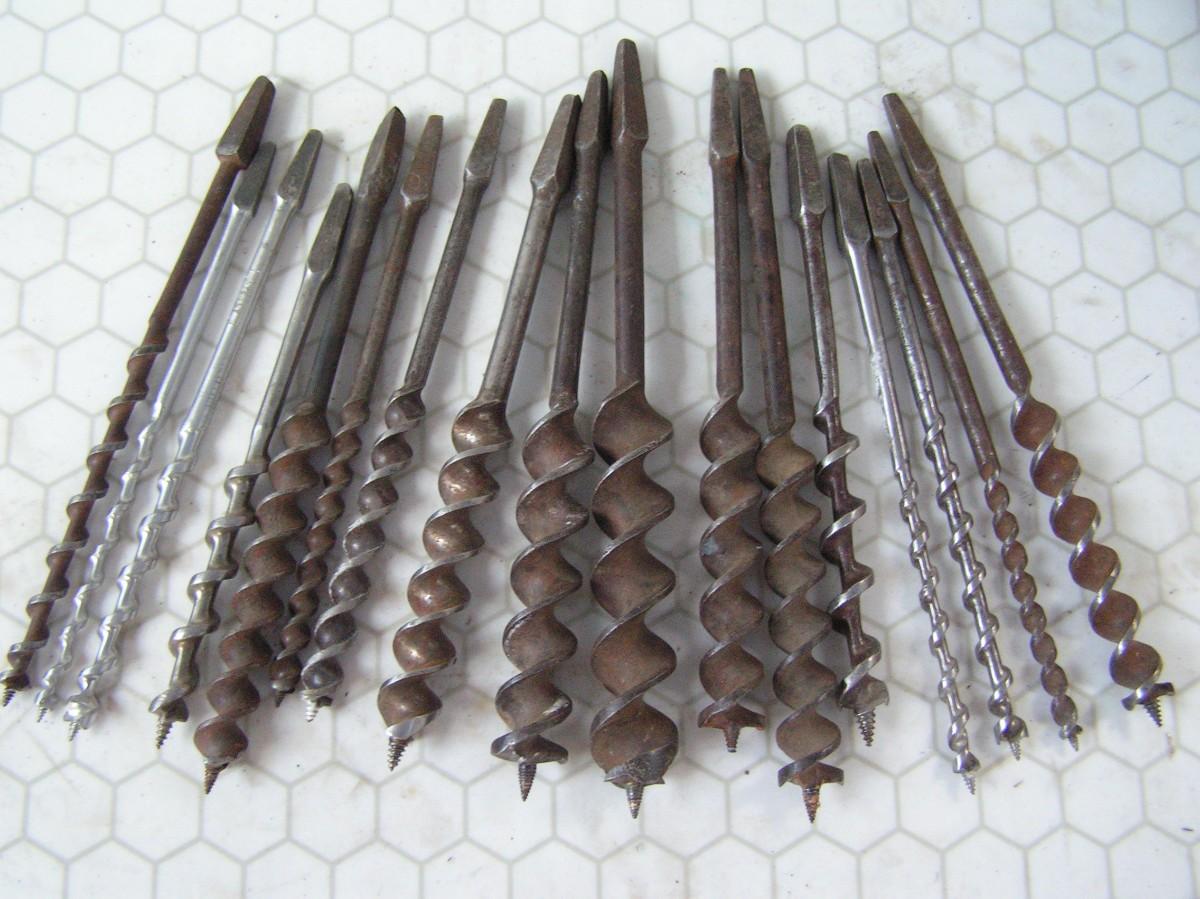 Auger drill bit collection for hand brace drill, 17 bits in a wooden box
