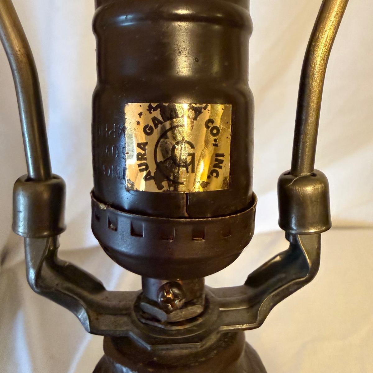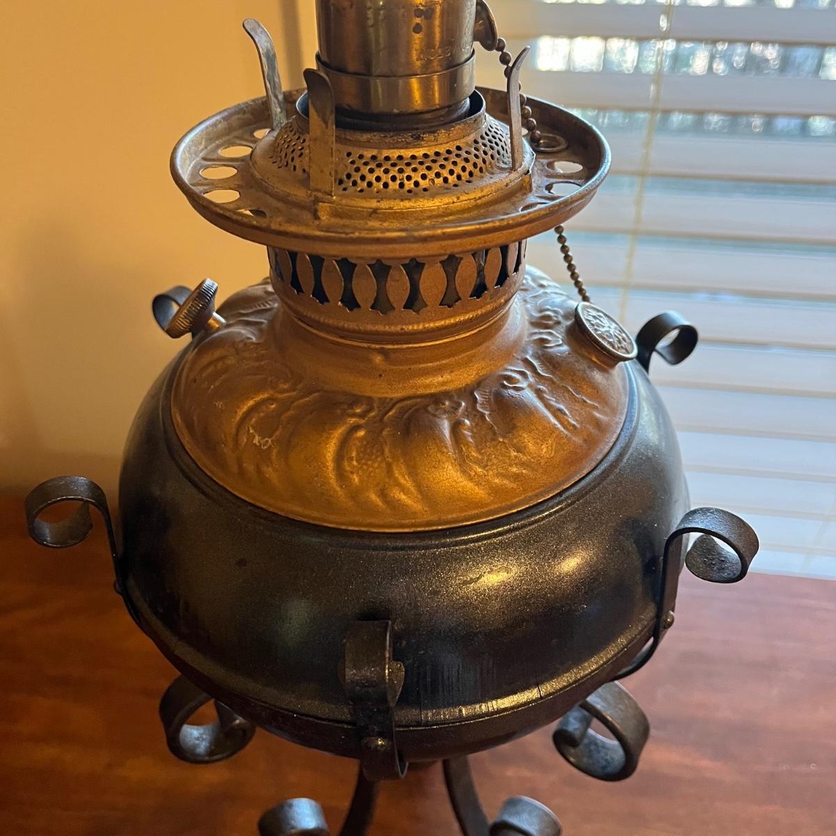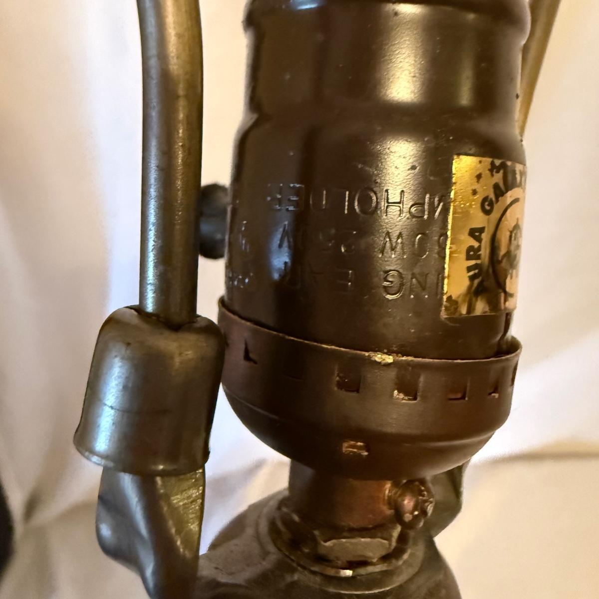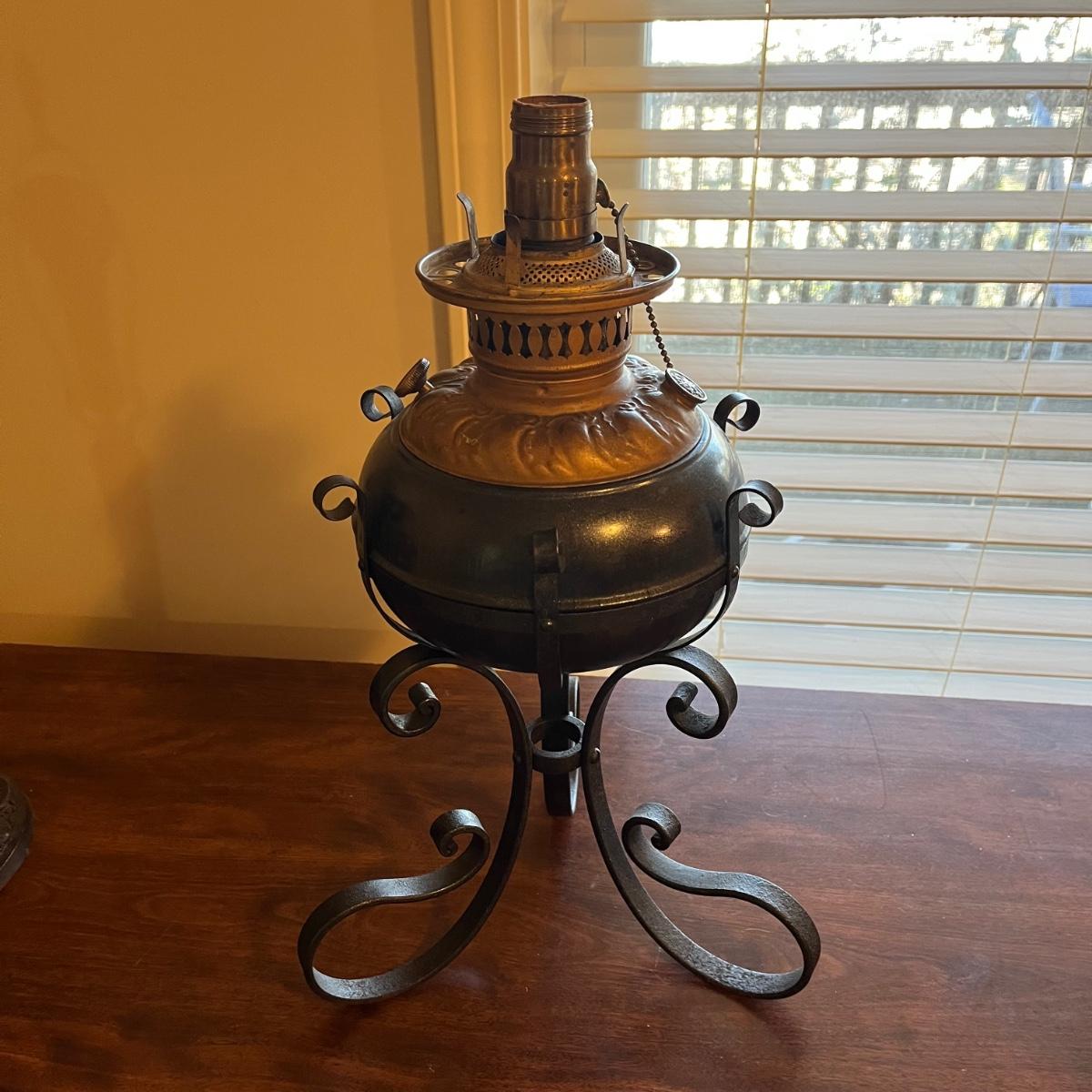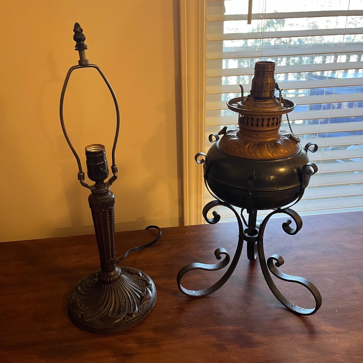 Two lamp bases include an Aura Galaxy Tiffany Lamp base measuring 7”D x 20”H including the finial, and a converted oil lamp measuring 10.5”D at the base x 17.5”H without the bulb. The Aura lamp, made of metal with a deep bronze finish, has two switches that work the lamp and the oil lamp has a pull chain switch.