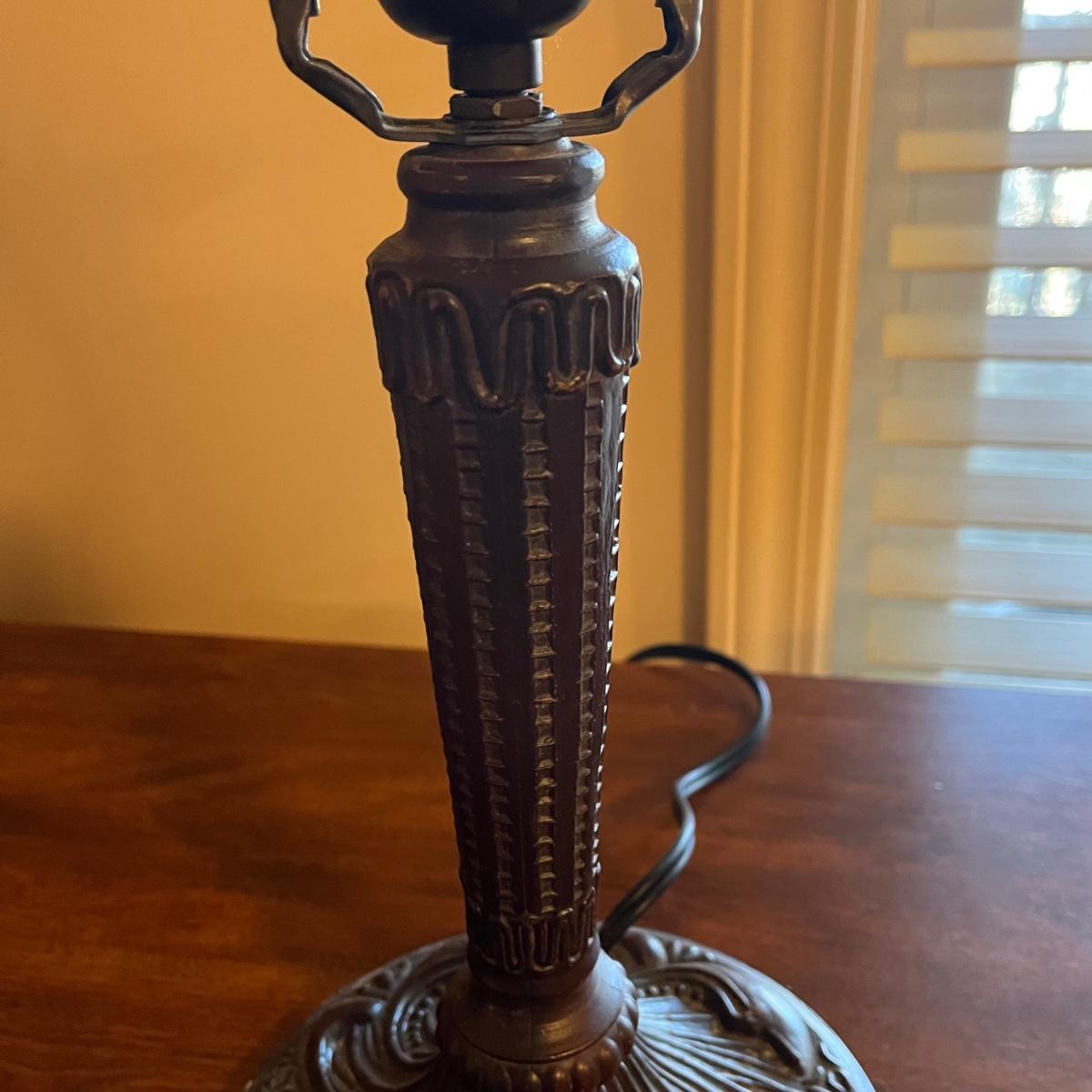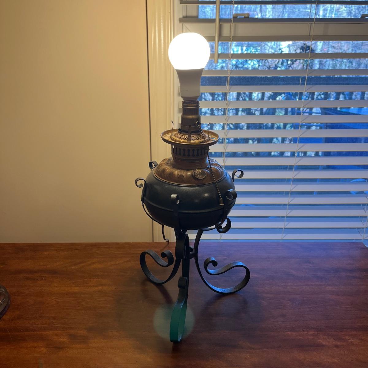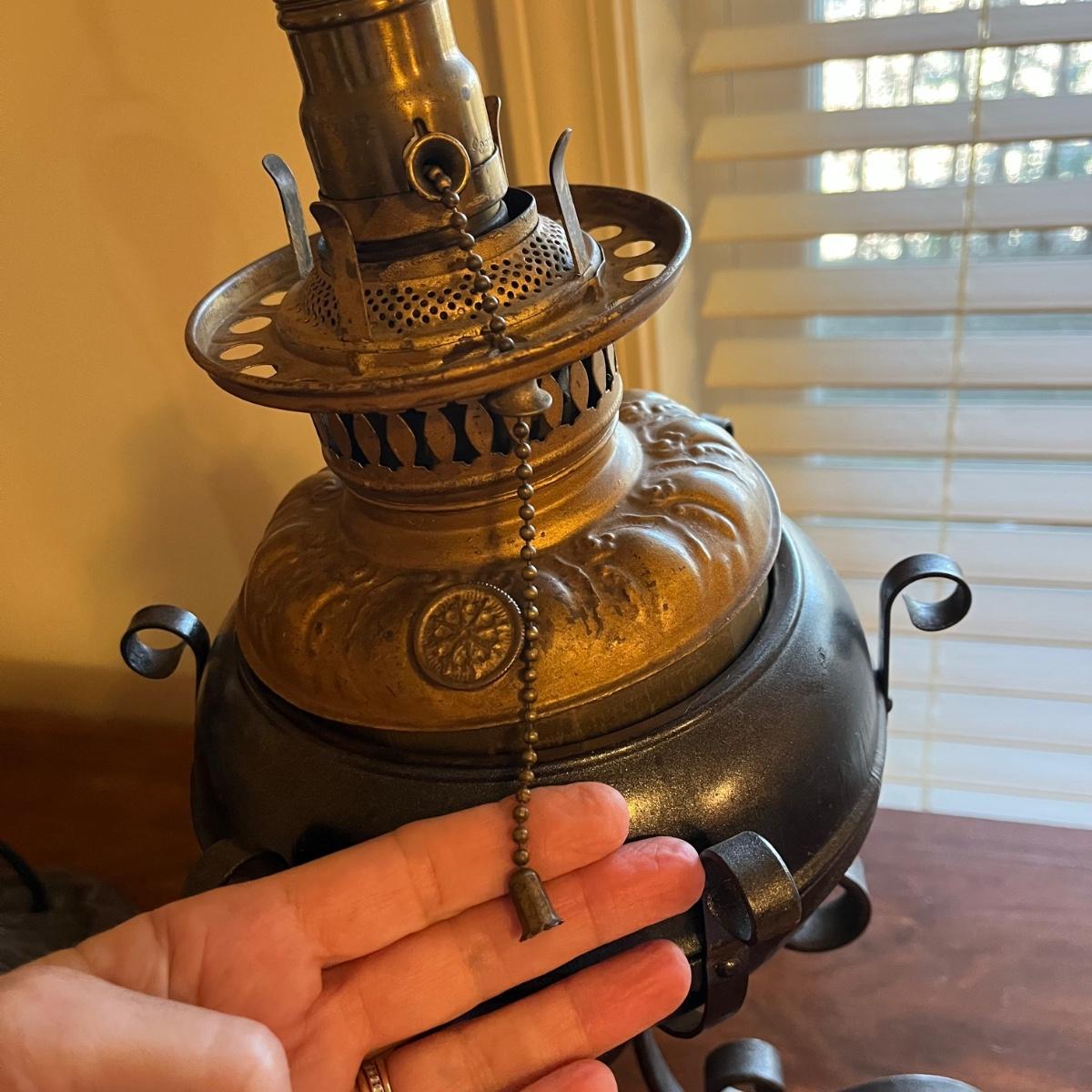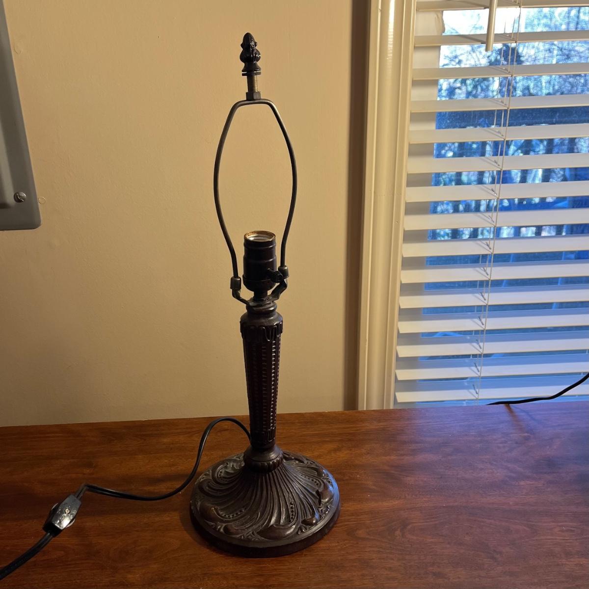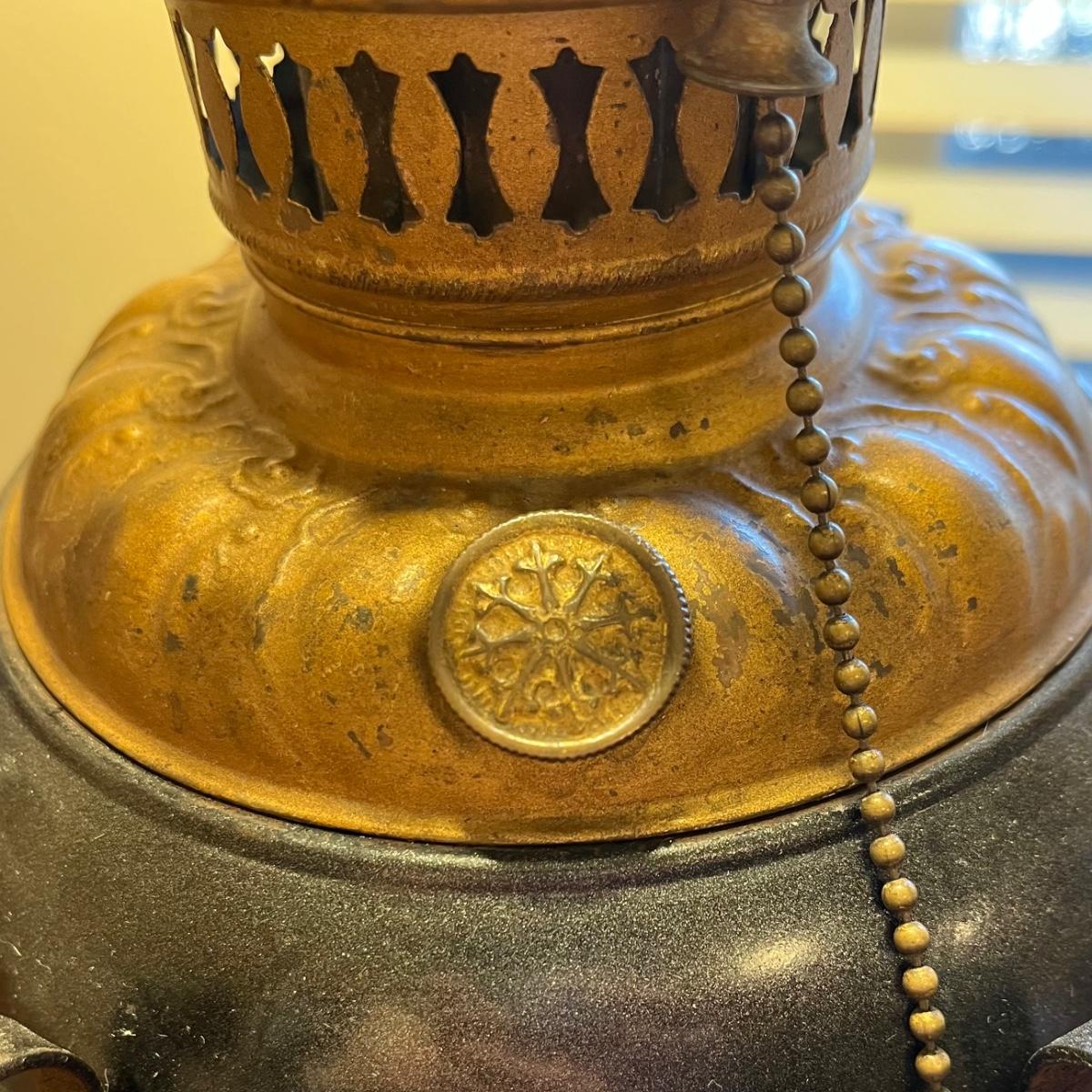 Two lamp bases include an Aura Galaxy Tiffany Lamp base measuring 7”D x 20”H including the finial, and a converted oil lamp measuring 10.5”D at the base x 17.5”H without the bulb. The Aura lamp, made of metal with a deep bronze finish, has two switches that work the lamp and the oil lamp has a pull chain switch.