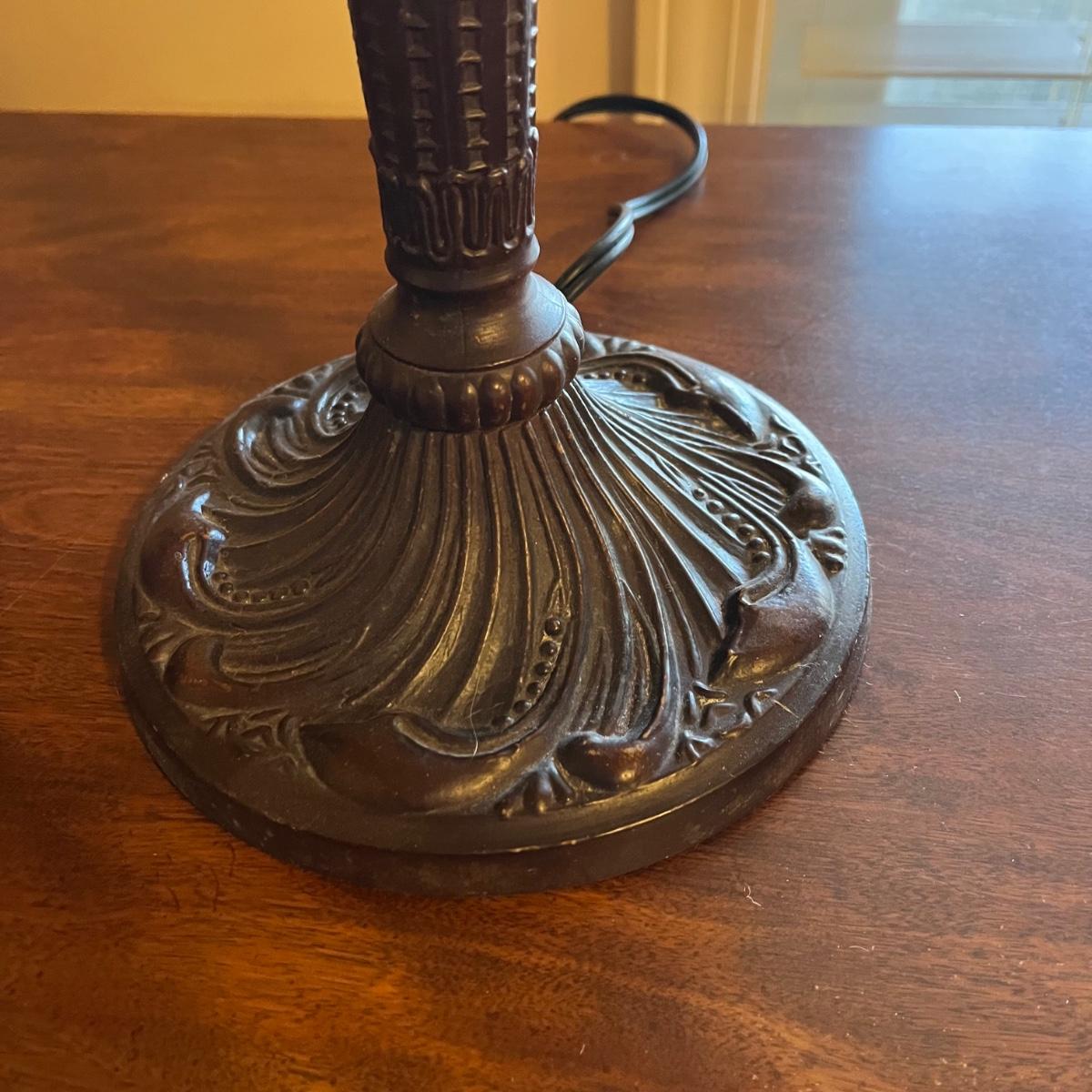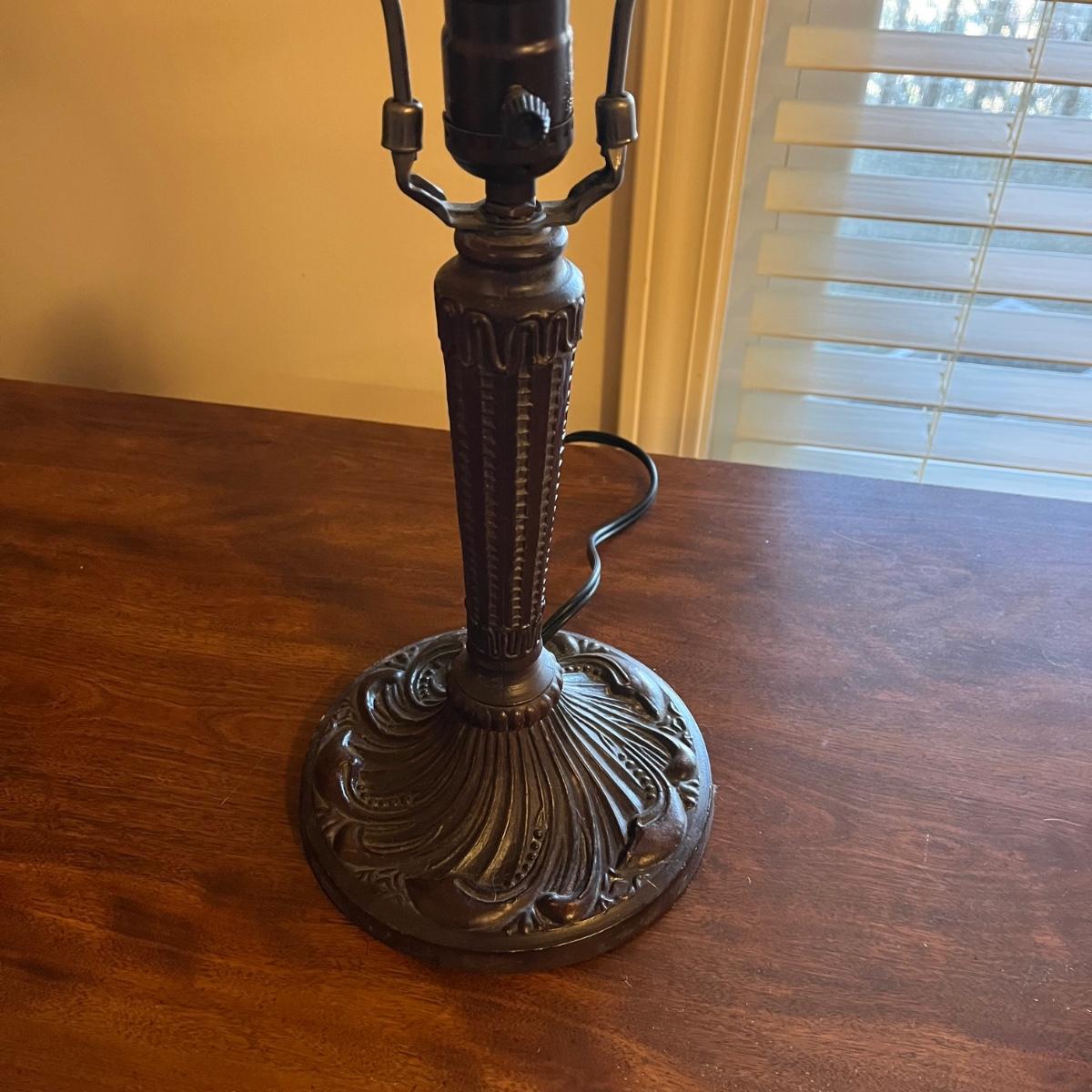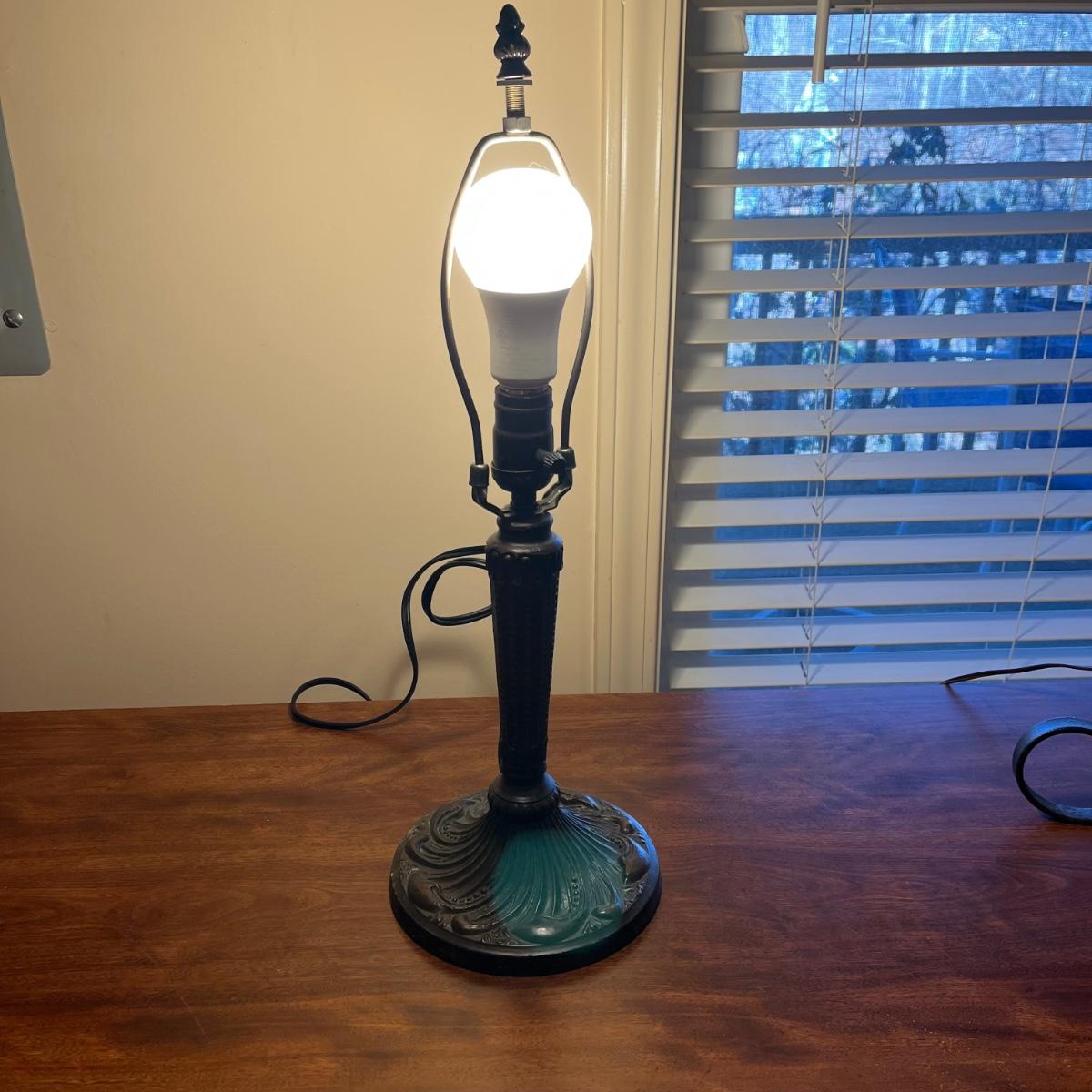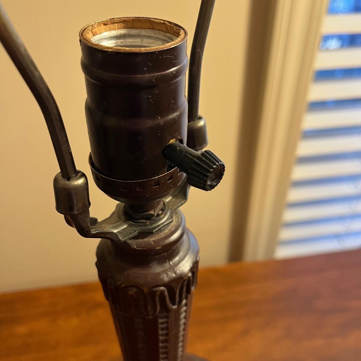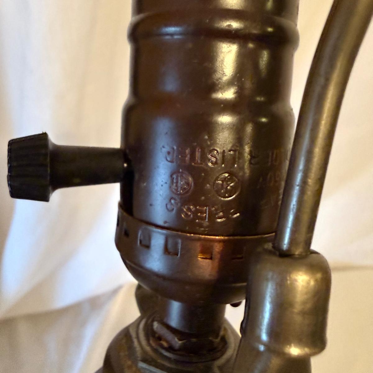 Two lamp bases include an Aura Galaxy Tiffany Lamp base measuring 7”D x 20”H including the finial, and a converted oil lamp measuring 10.5”D at the base x 17.5”H without the bulb. The Aura lamp, made of metal with a deep bronze finish, has two switches that work the lamp and the oil lamp has a pull chain switch.