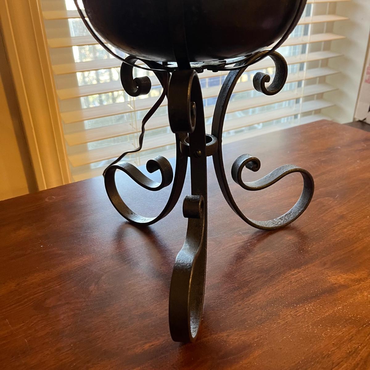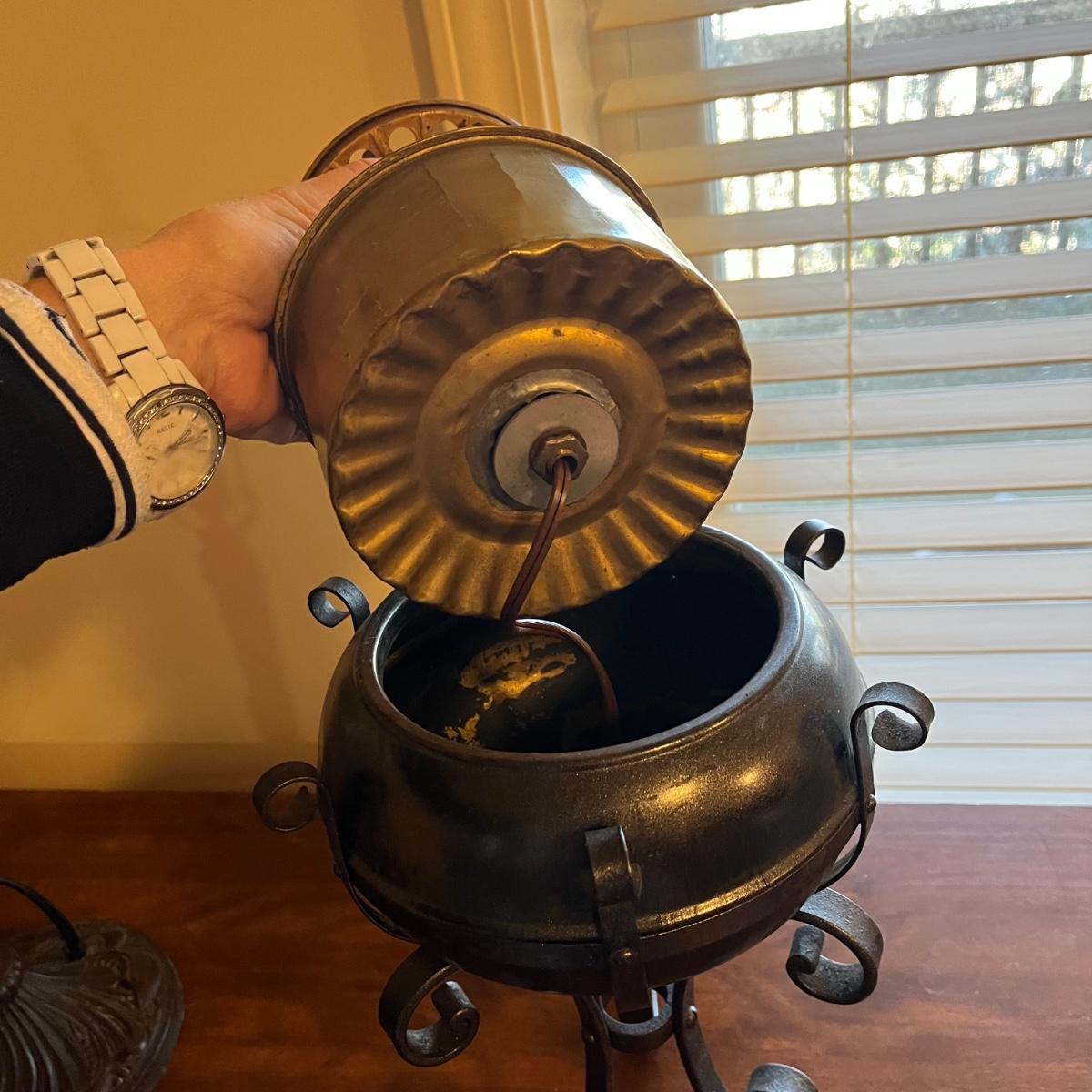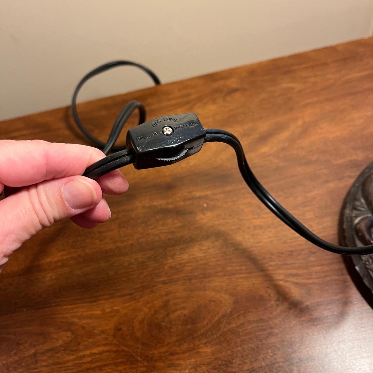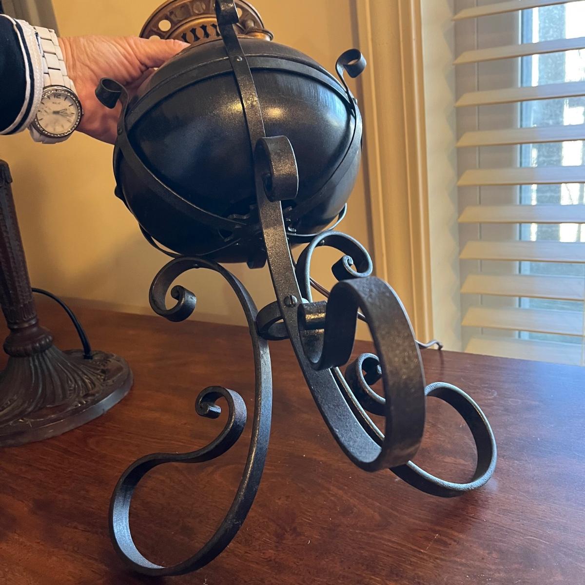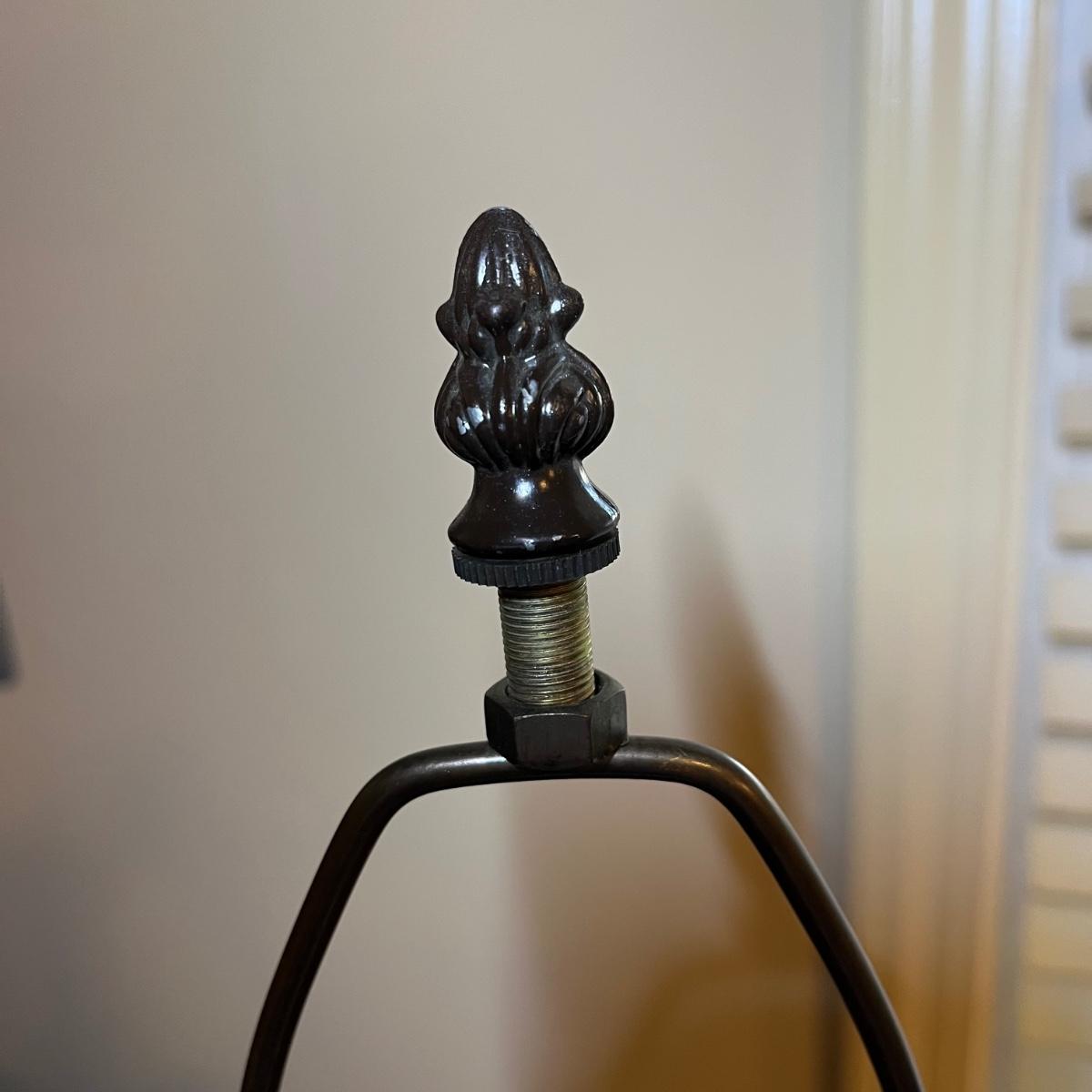 Two lamp bases include an Aura Galaxy Tiffany Lamp base measuring 7”D x 20”H including the finial, and a converted oil lamp measuring 10.5”D at the base x 17.5”H without the bulb. The Aura lamp, made of metal with a deep bronze finish, has two switches that work the lamp and the oil lamp has a pull chain switch.