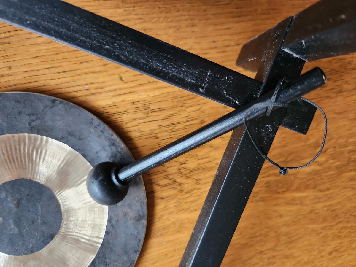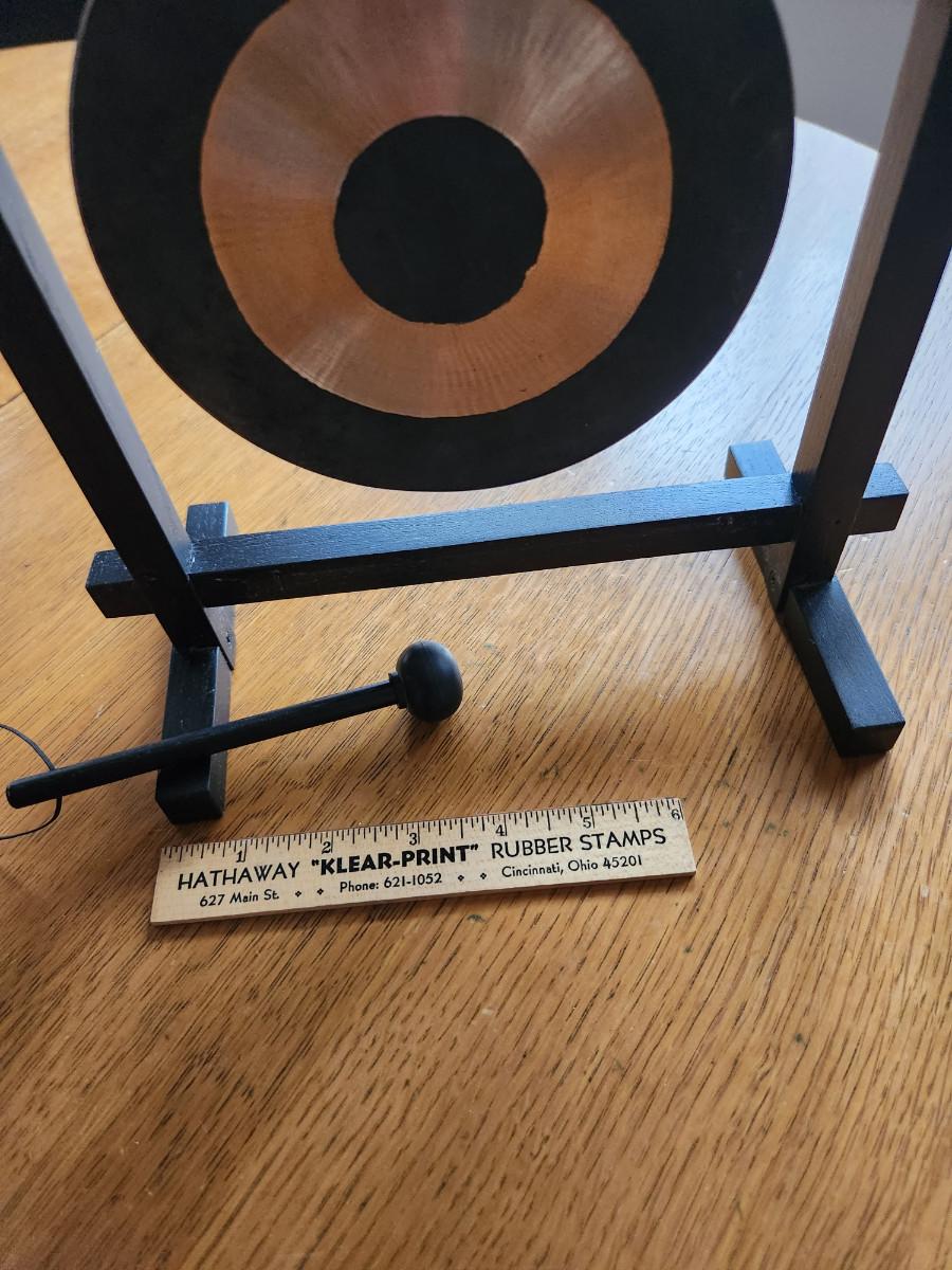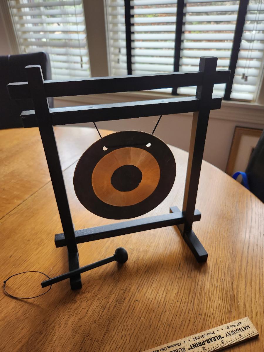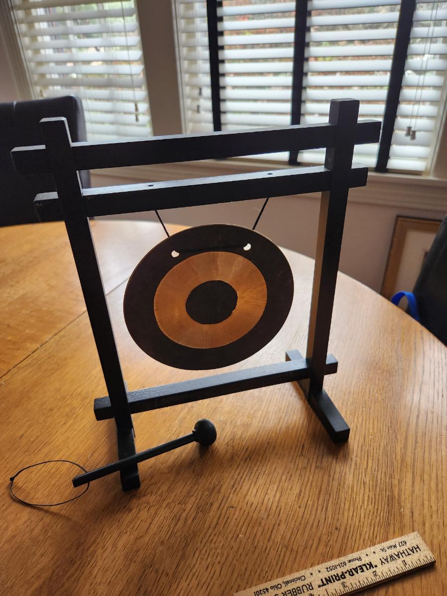 This auction lot is for a very unique Aura Gong. Bang the gong and the ringing is said to help cleanse the aura of the area. The black wood stand measures about 12-inches tall by 10-inches wide. The heavy brass gong is attached with roping and the unit comes with a wood mallet. Gong away if you bid high.