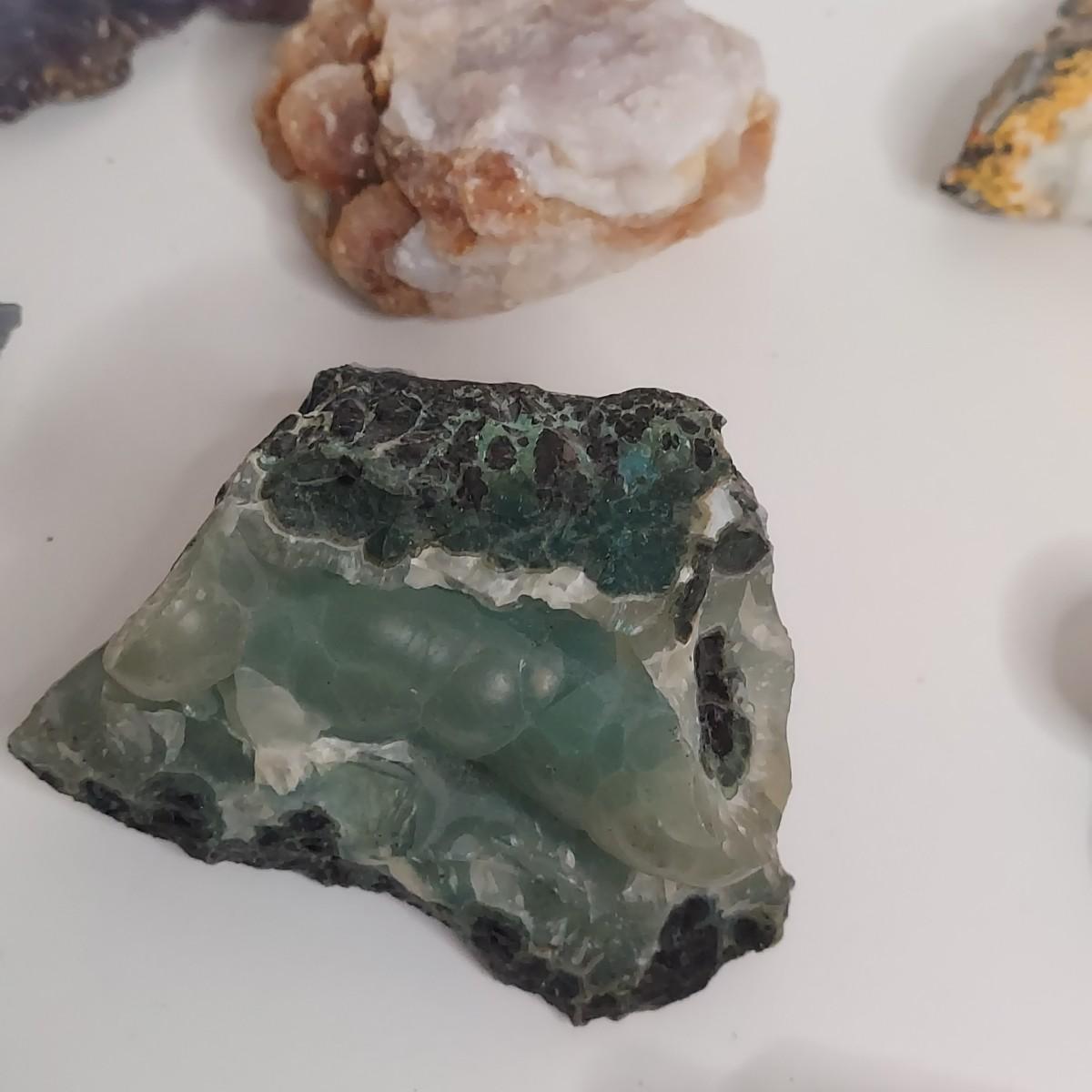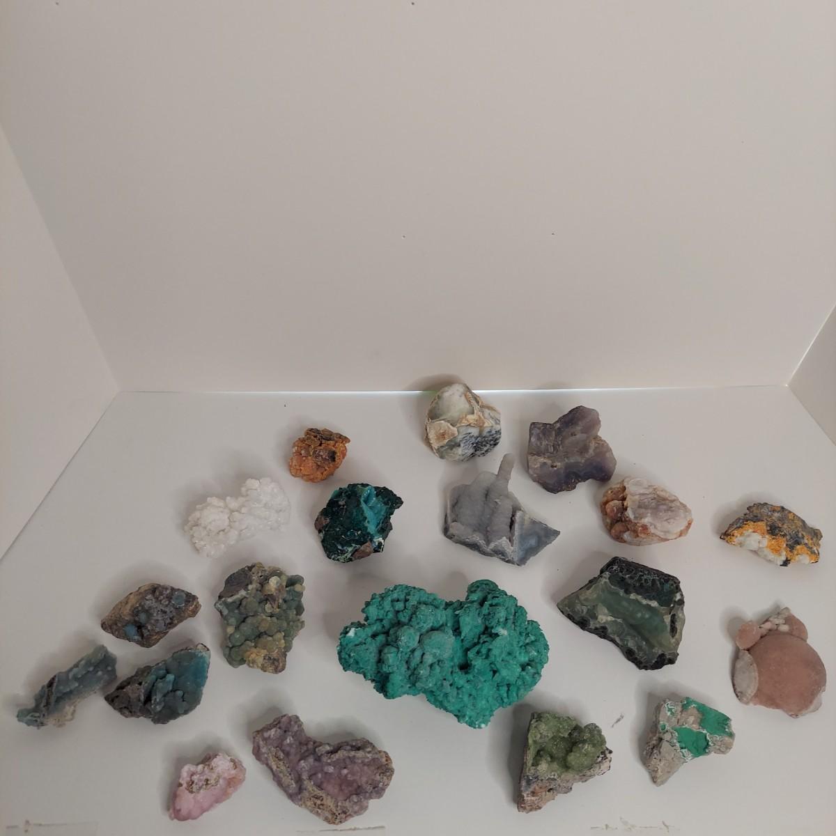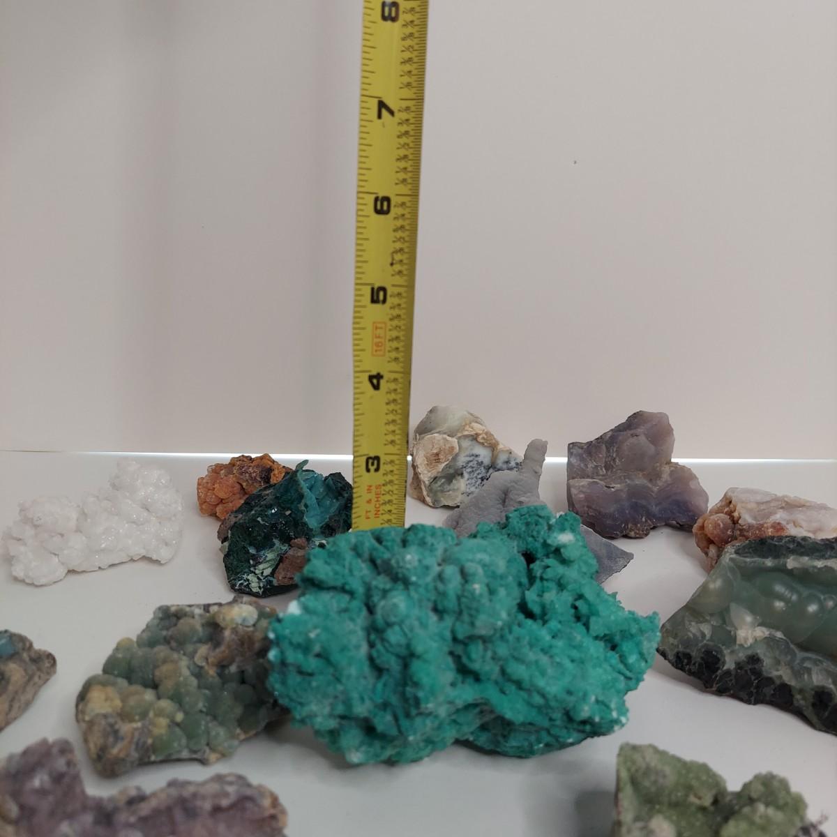 Contains 15+ pieces. Appears to include aurichalcite, smithsonite, thompsonite, variscite, hemimorphite, prehnite, chalcedony, chrysocolla and more. The largest piece measures roughly 5” x 3” x 2.5"H. Please see photos for details.