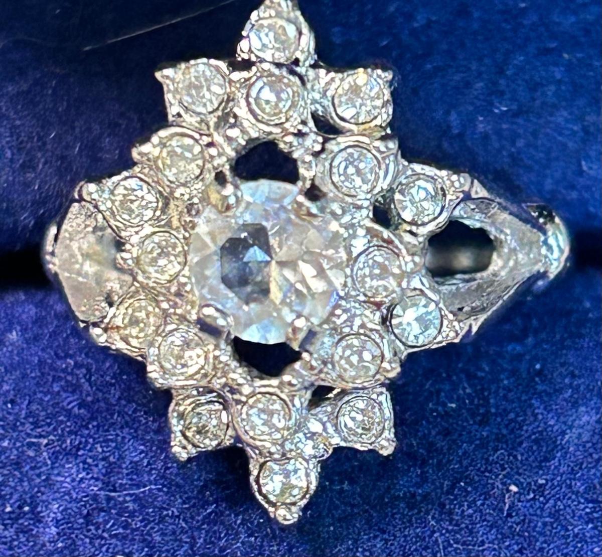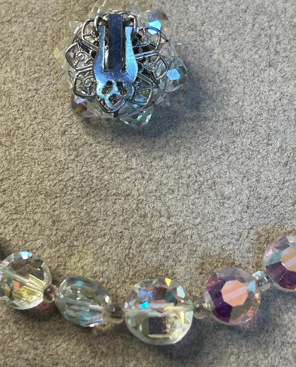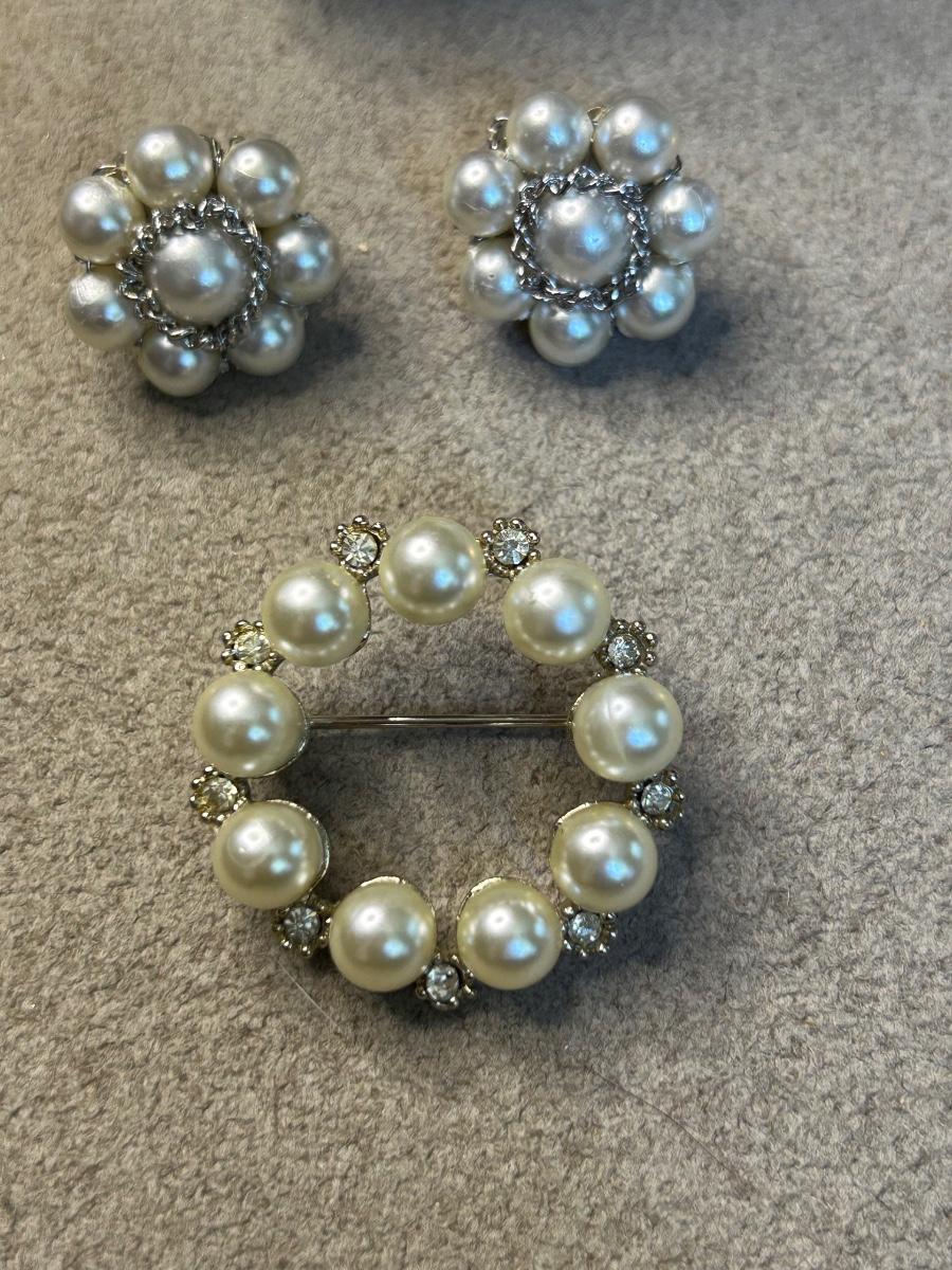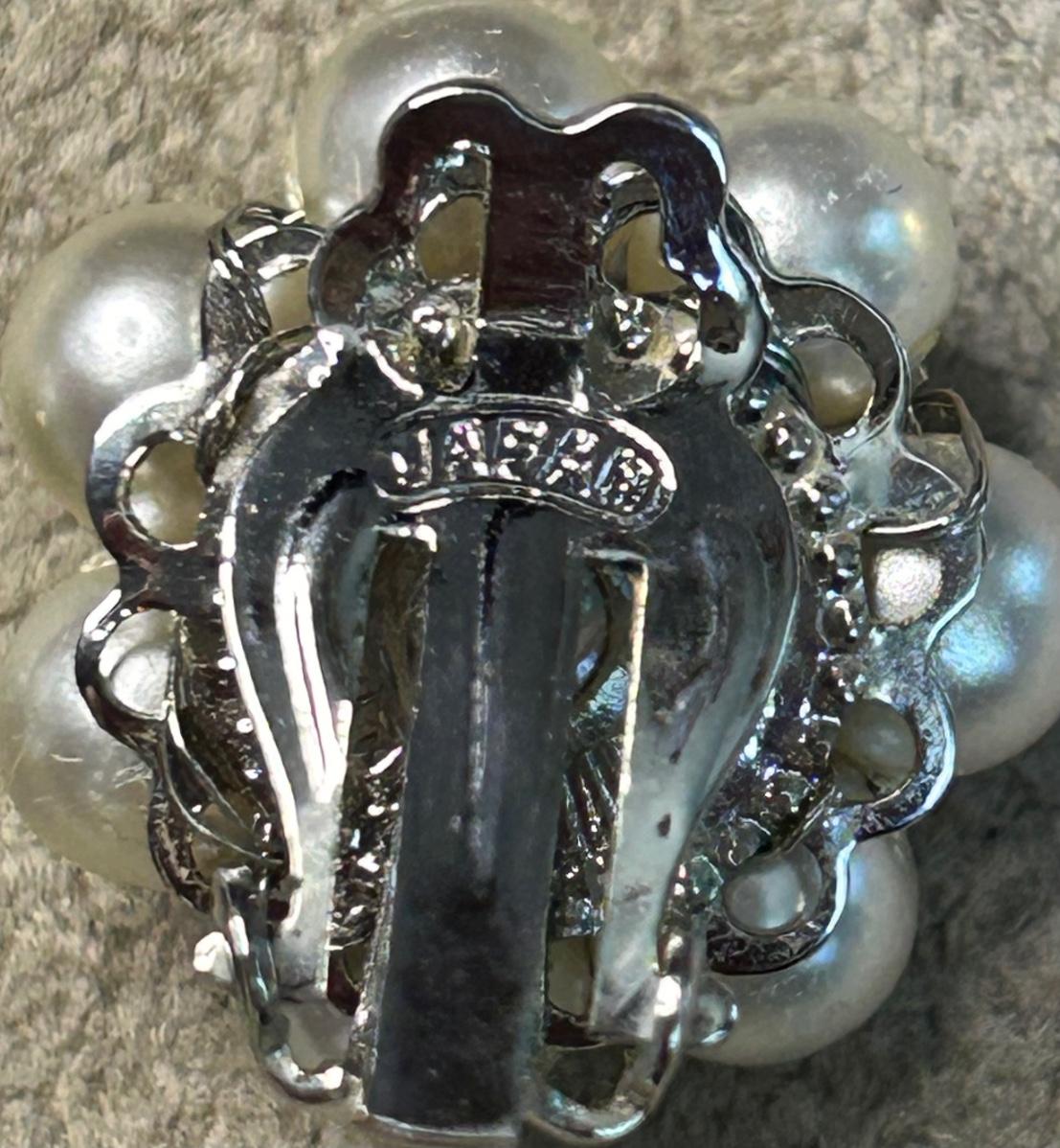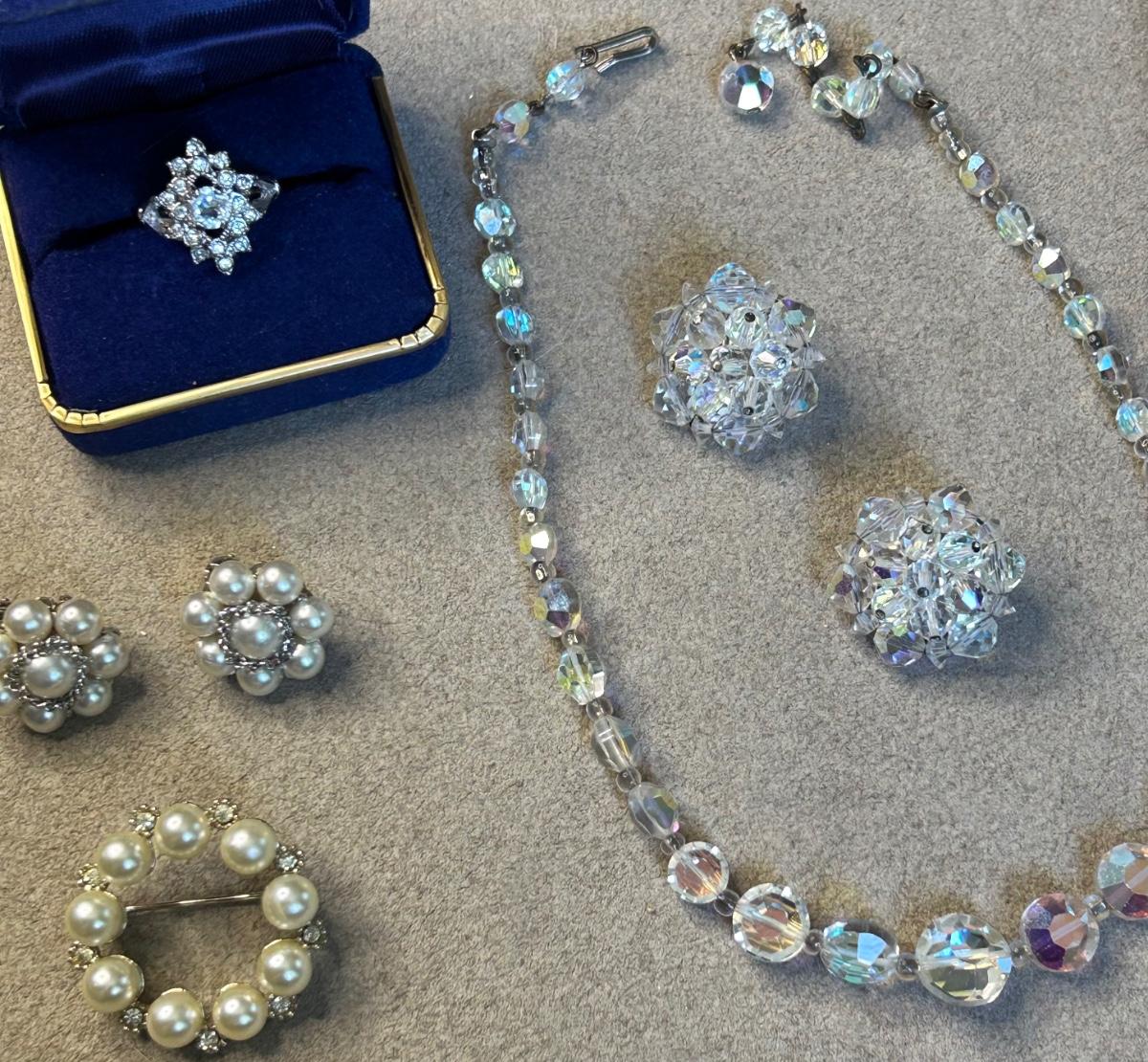 The pearl earrings are clip ons and stamped Japan. The AB earrings are also clip ons. The necklace is stunning!! The ring is a size 5.