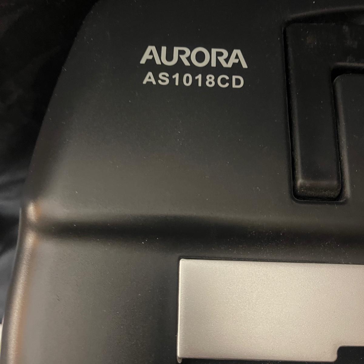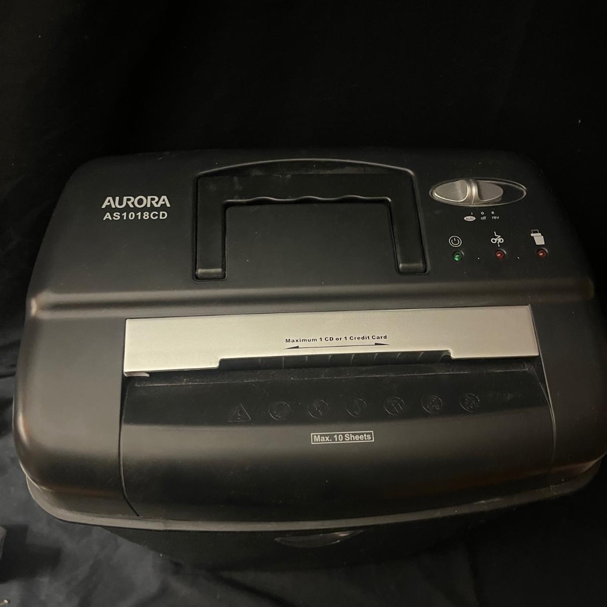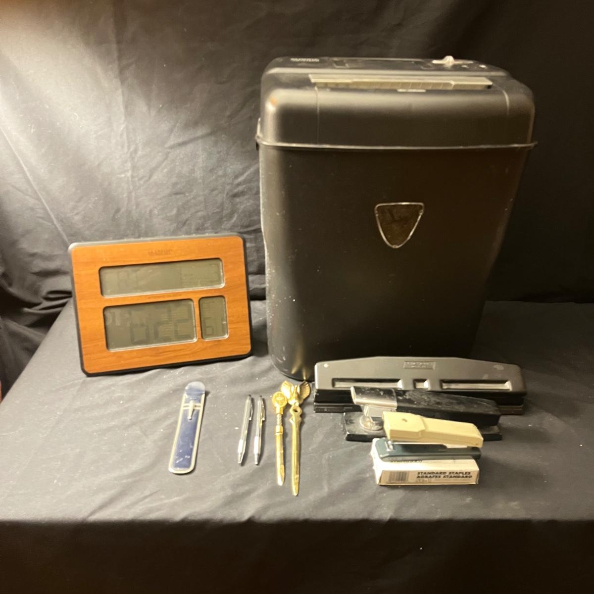 Lot includes an Aurora shredder, La Crosse atomic clock, two staplers, two Cross pens, brass letter opener and metal letter opener, triple hole punch and two metal 5” rulers. Shredder powered on when plugged in and measures 14” x 8” x 17”H.