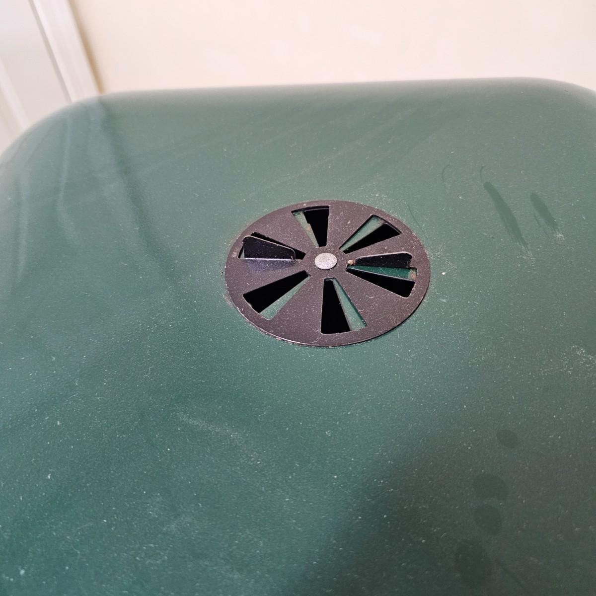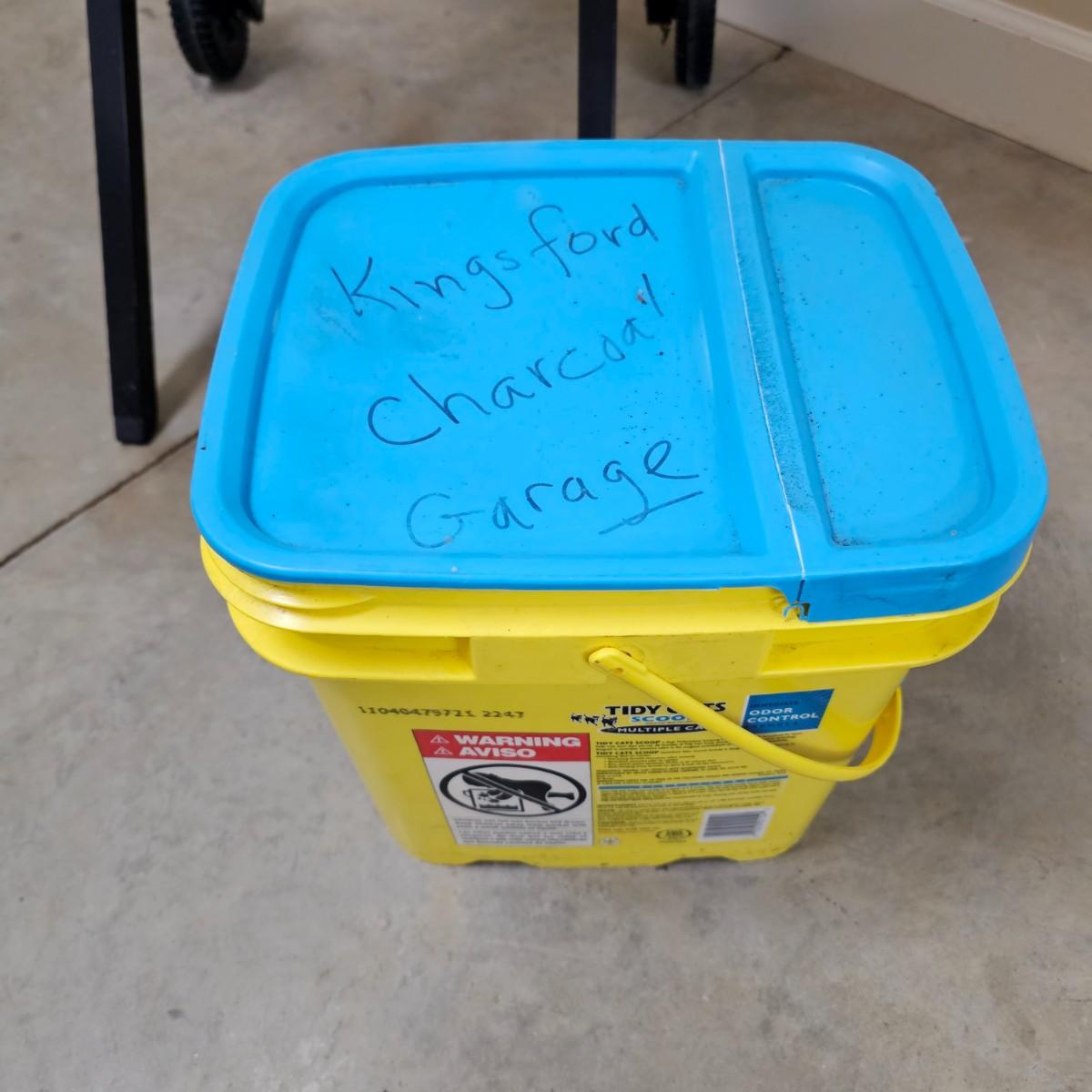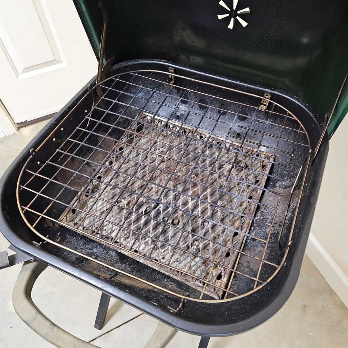 Dark green enamel charcoal grill on rolling stand by Aussie. Grill has ventured lid, inner cooking grid and charcoal tray. Measures 21" x 29" x 35"H, comes with part bucket of charcoal. See photos for details. Local pickup only.