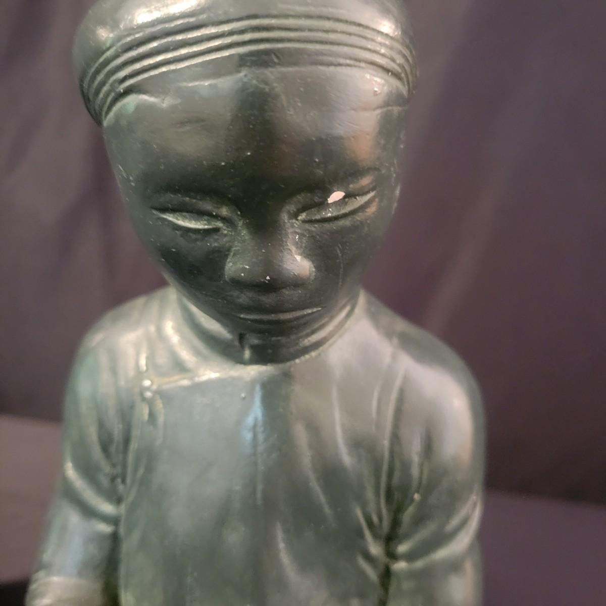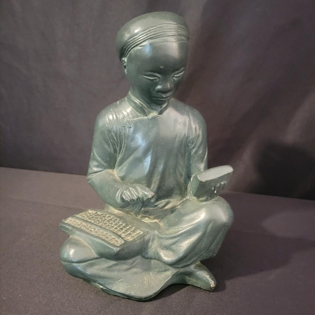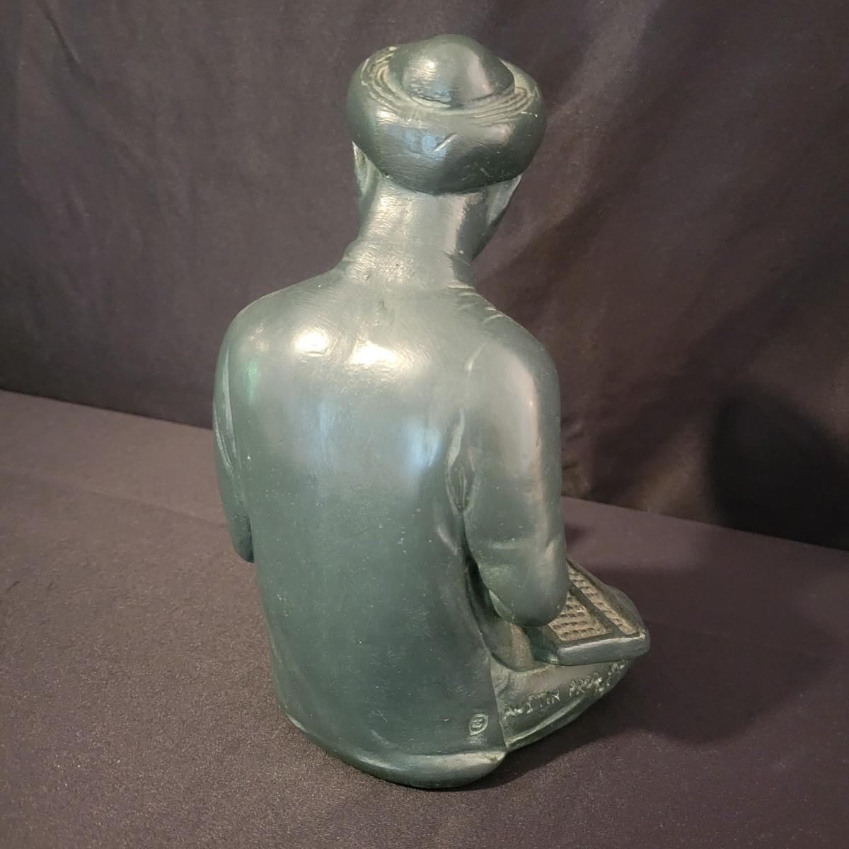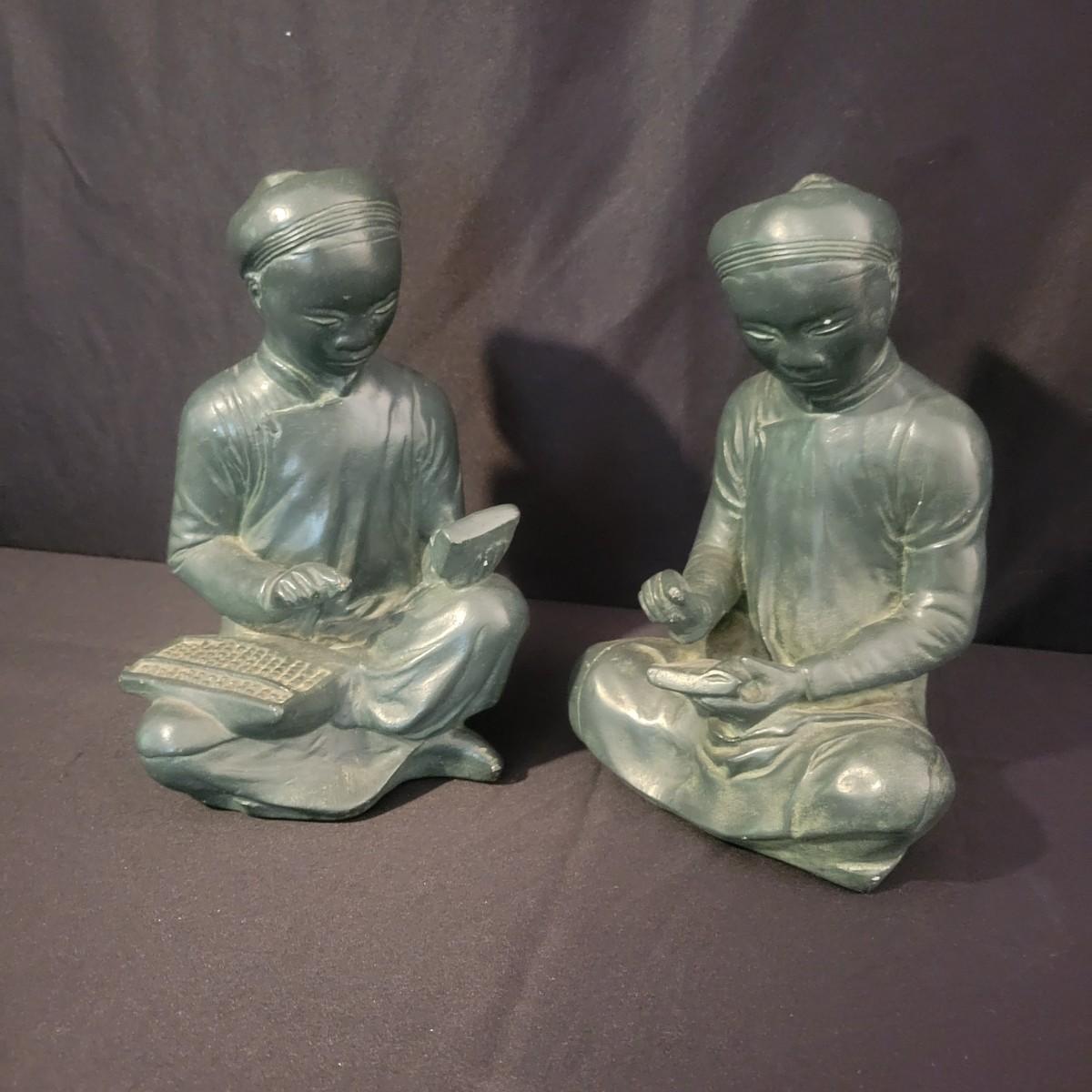 A pair of sculptures that are cast pieces made of durastone and then given a green finish.. They were manufactured by Austin Prod Inc. These pieces depict two Asian men preforming calculations and measure approximately 6" x 4.5" x 8.5"H. One piece does have a minor blemish above the eye. Shipping available. Shipping art can be costly. We suggest contacting our preferred local shipping provider, Postage Express, with dimensions and getting an estimate before bidding: (828) 670-5501 or postageexpress@yahoo.com.