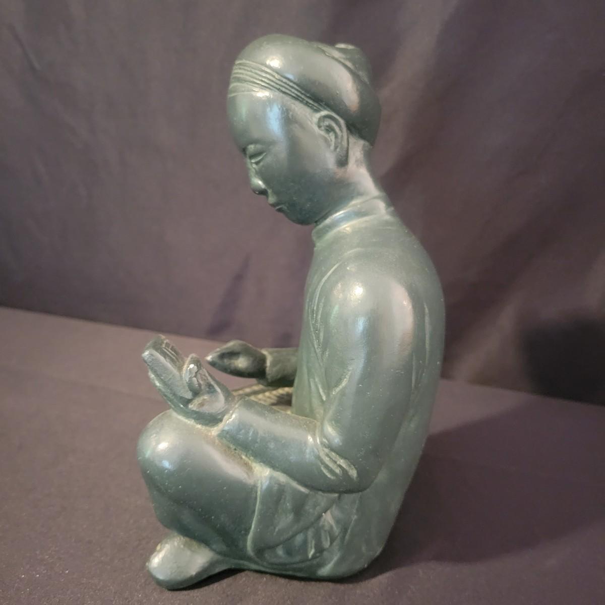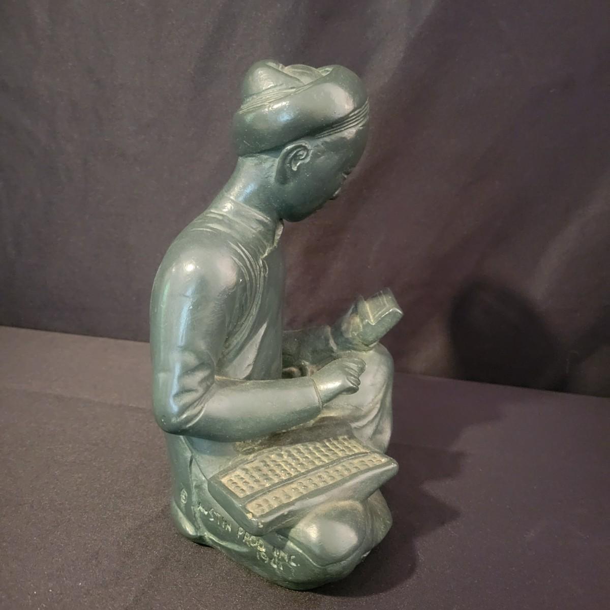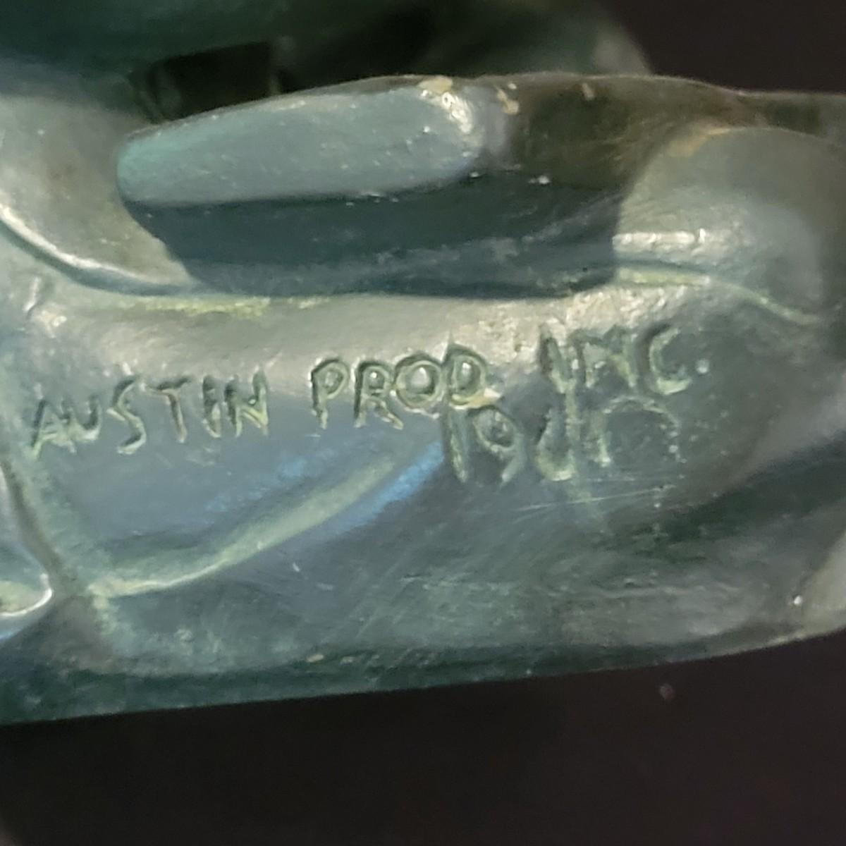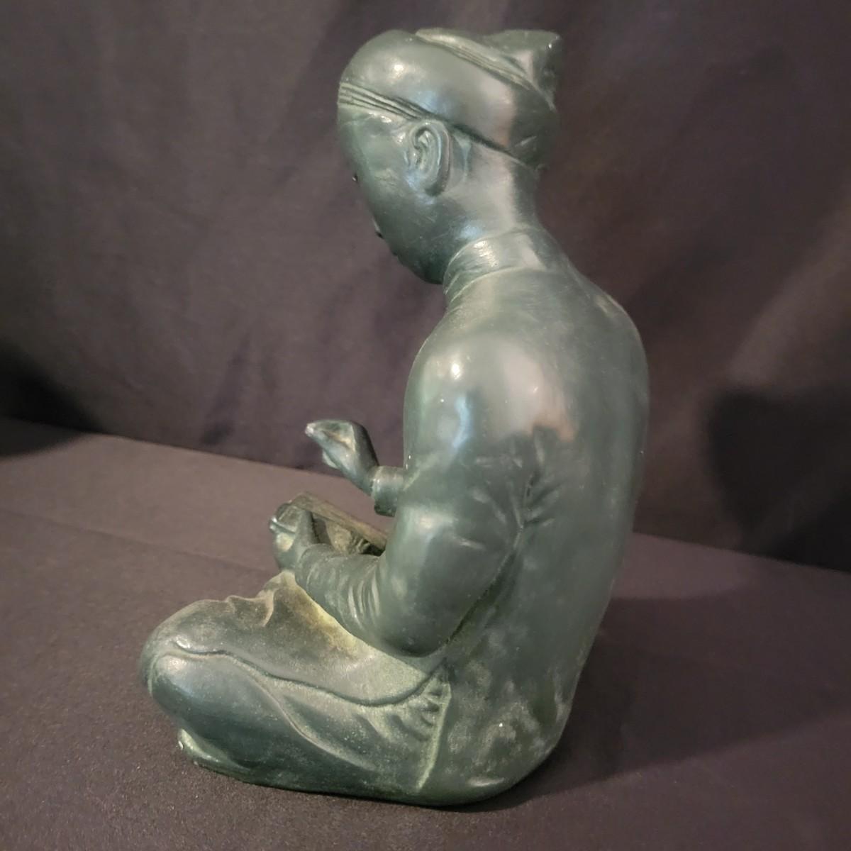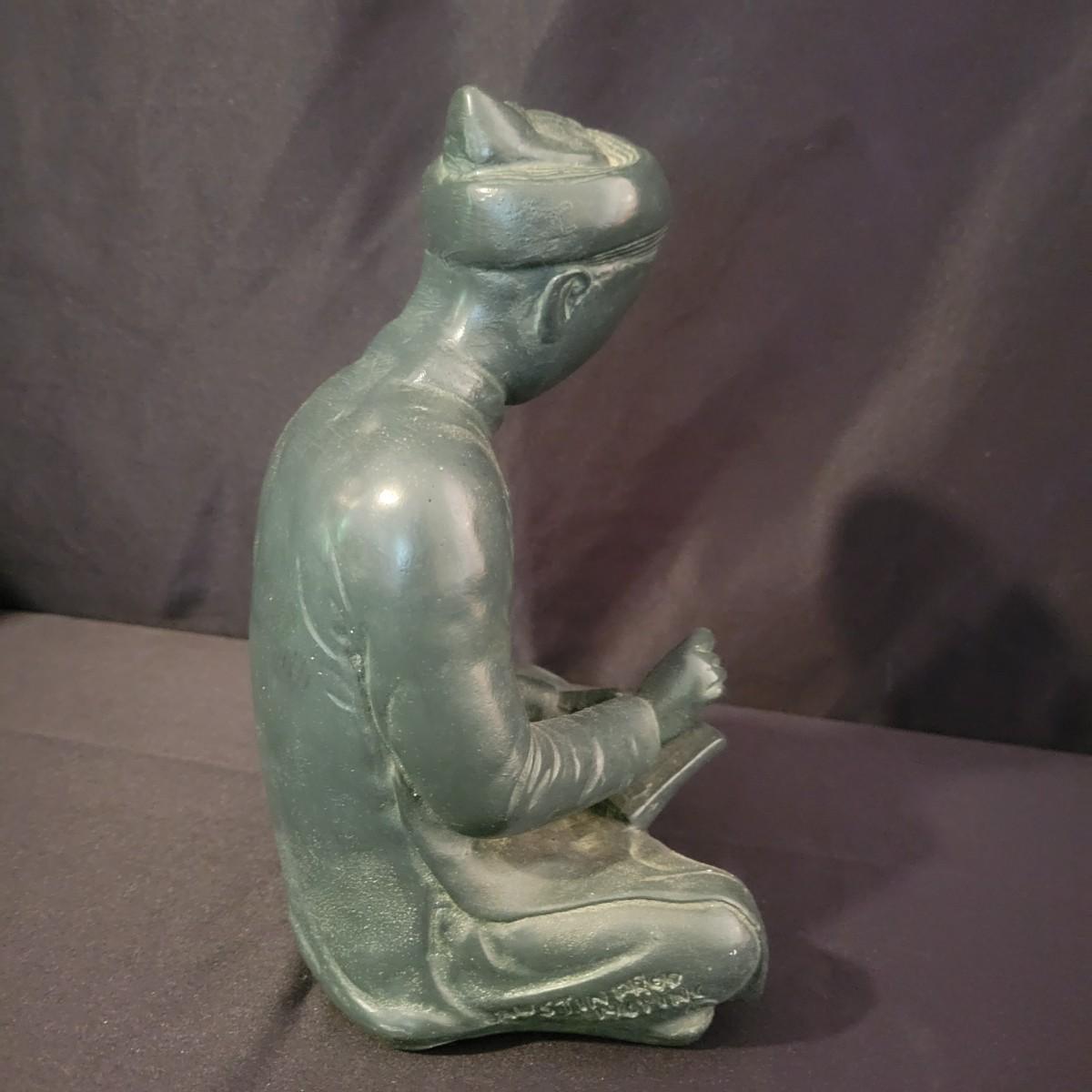 A pair of sculptures that are cast pieces made of durastone and then given a green finish.. They were manufactured by Austin Prod Inc. These pieces depict two Asian men preforming calculations and measure approximately 6" x 4.5" x 8.5"H. One piece does have a minor blemish above the eye. Shipping available. Shipping art can be costly. We suggest contacting our preferred local shipping provider, Postage Express, with dimensions and getting an estimate before bidding: (828) 670-5501 or postageexpress@yahoo.com.