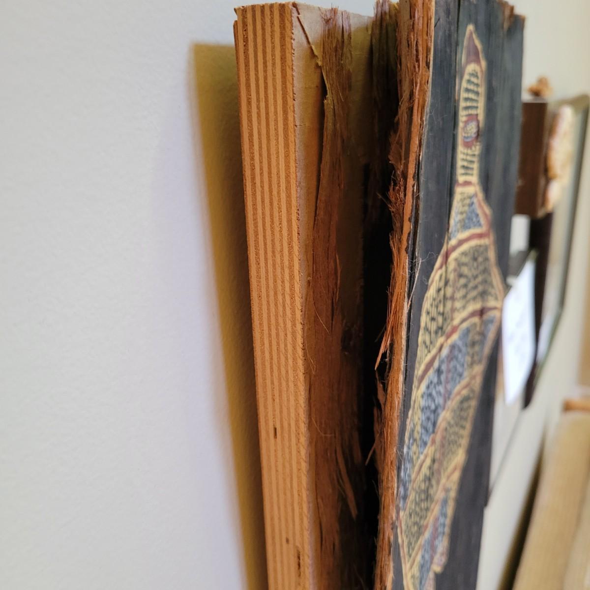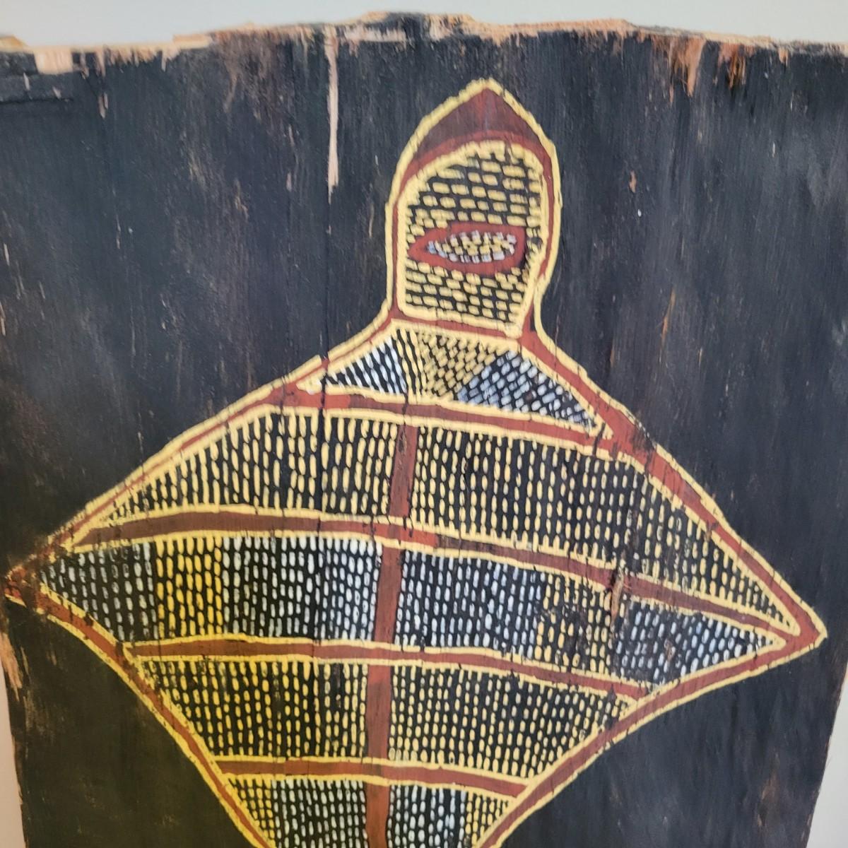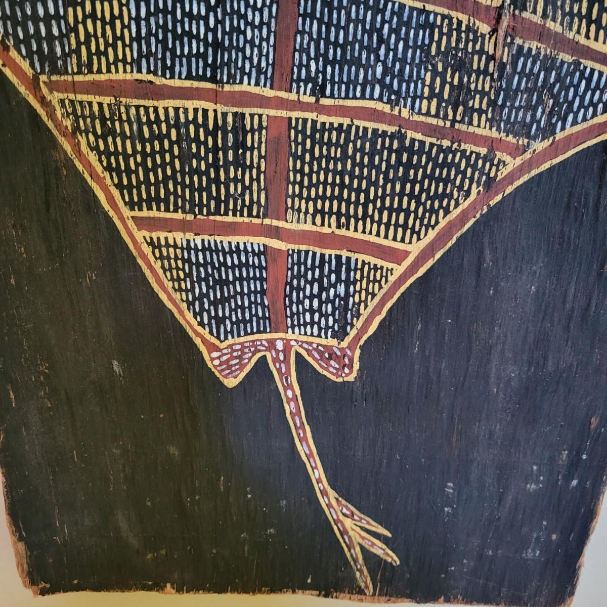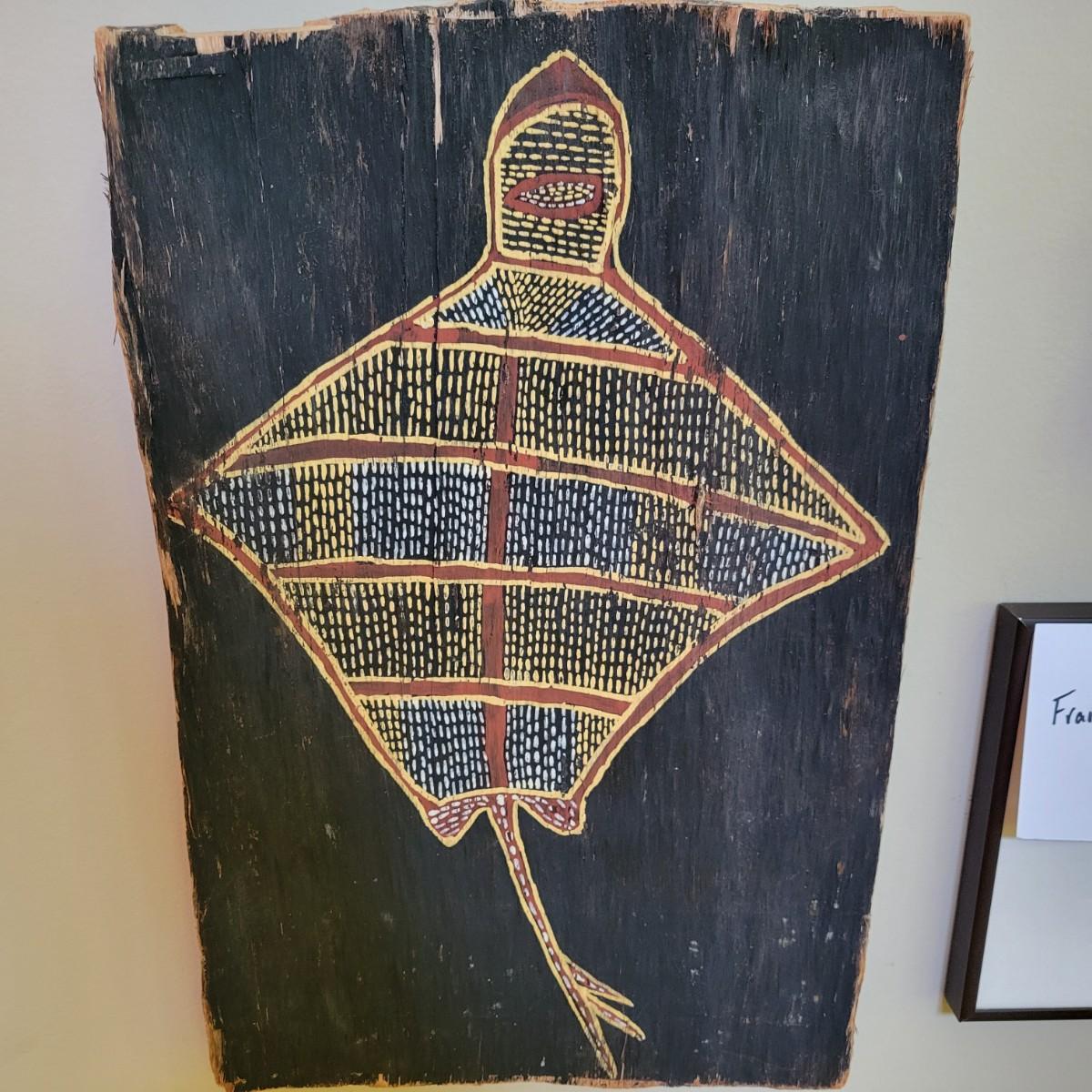 According to the seller, this is an authentic piece of Australian aboriginal art of a stingray painted on bark. This piece is mounted to a stretcher bar for hanging and to protect the piece. Measures approximately 12" x 1" x 16". One side of this piece is detaching from the frame. Shipping available. Shipping art can be costly. We suggest contacting our preferred local shipping provider, Postage Express, with dimensions and getting an estimate before bidding: (828) 670-5501 or postageexpress@yahoo.com.
