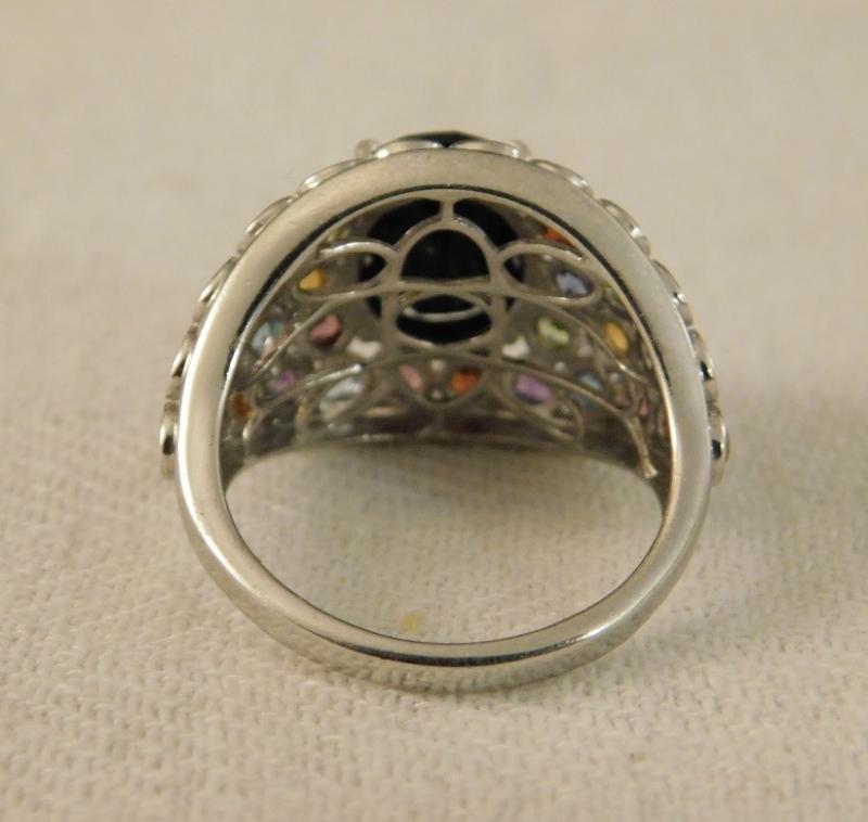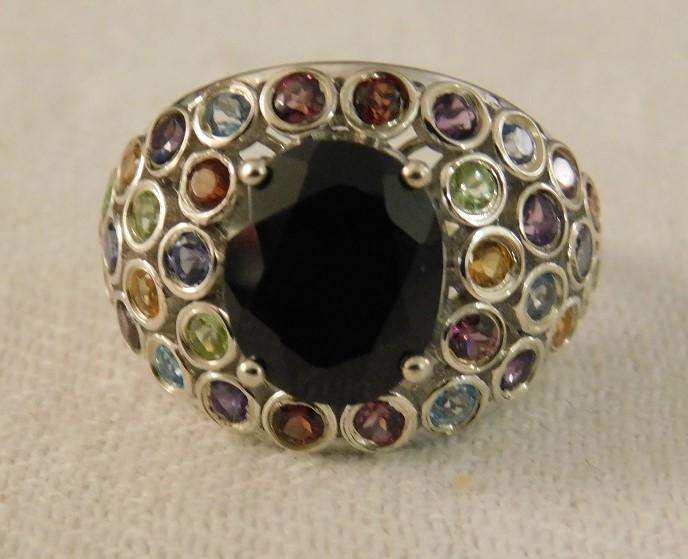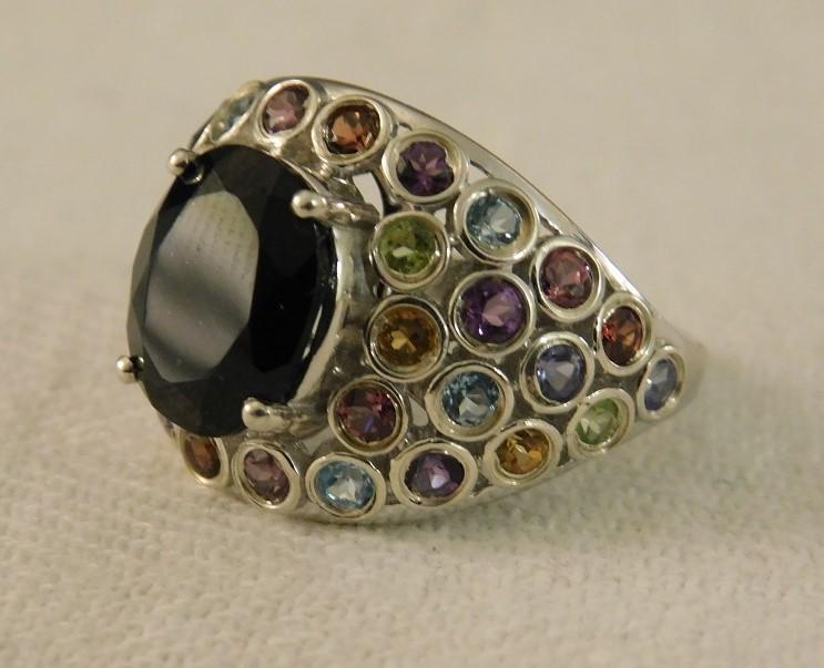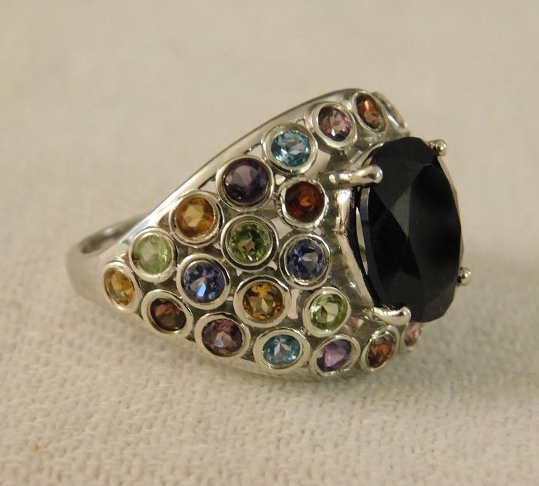 Australian Black Tourmaline Faceted Ring with Multi Stone Accents Platinum over sterling. Brilliant coloring.