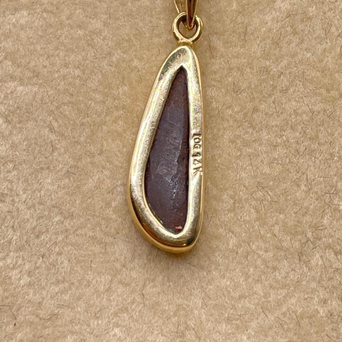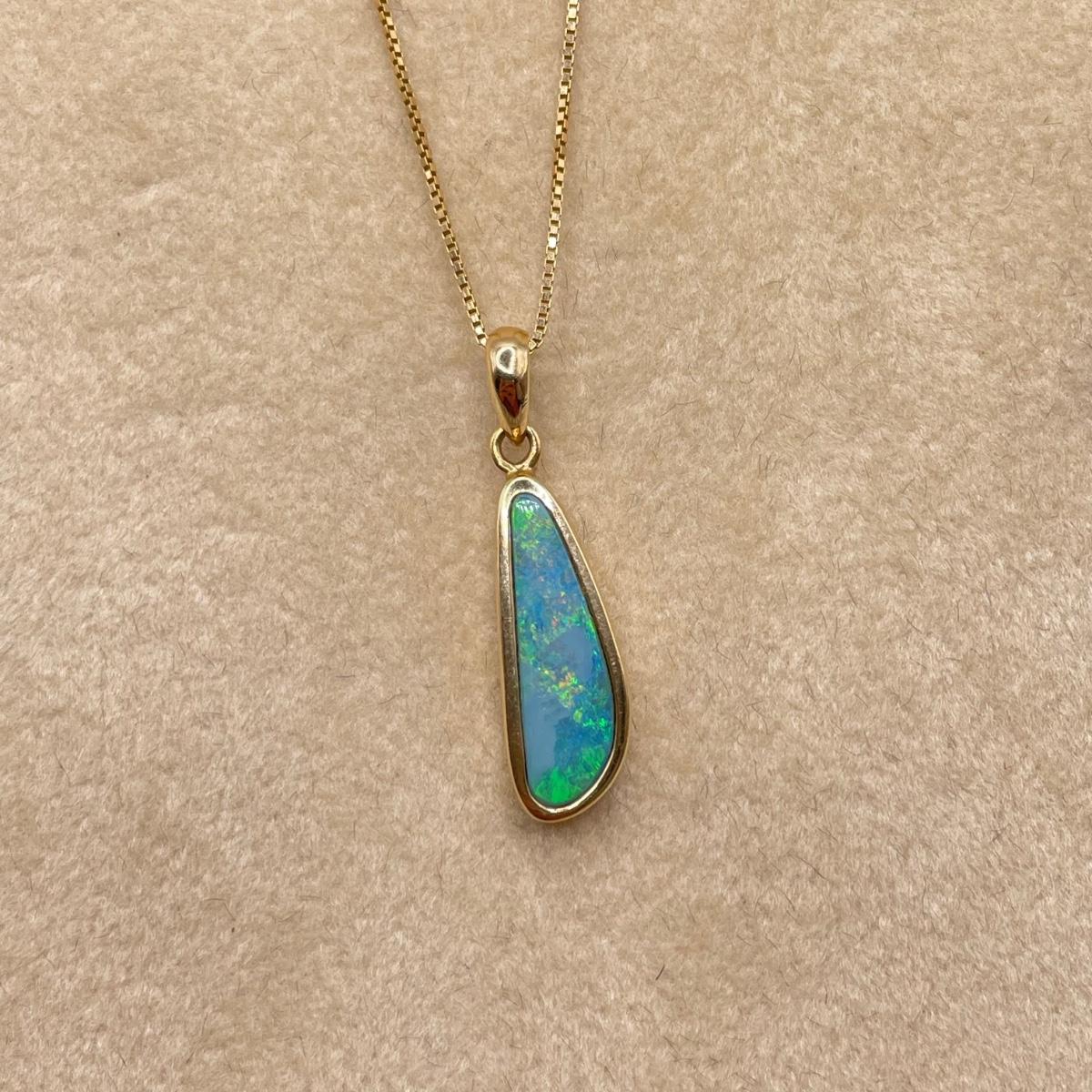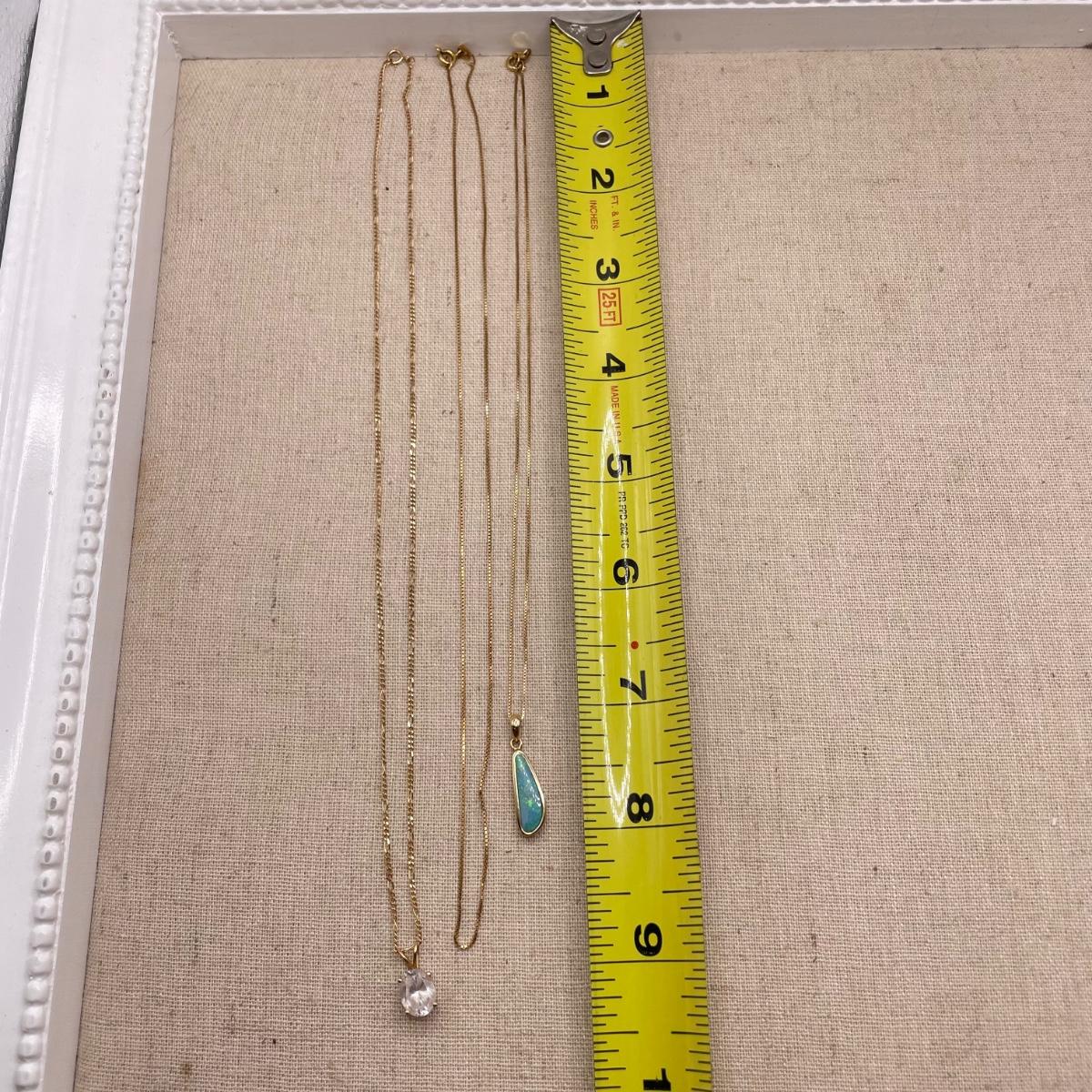 Three gold chains, the outer two photographed are marked 14K and the middle chain without a pendant shown is marked 750. The pendant that appears to be an Australian opal is also marked 14k. The final pendant is not marked, but the gold setting registered as 14k on our gold tester. The gem is likely glass and has a little cloudiness on it. Bid start is at or near melt value. All sales are final. No returns or refunds. Please bid accordingly. Shipping available.