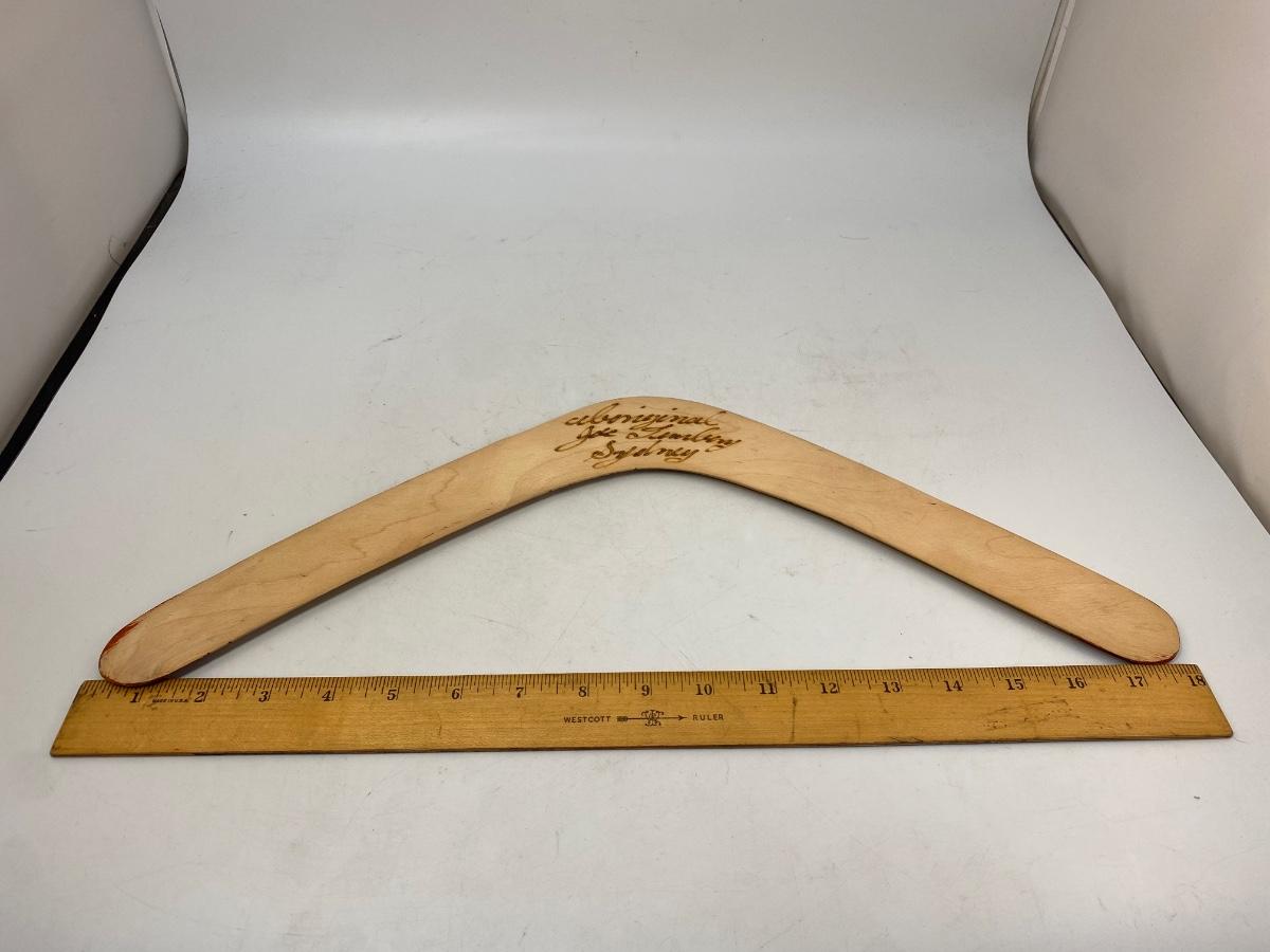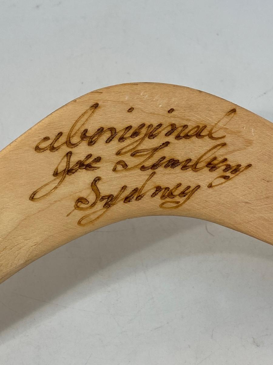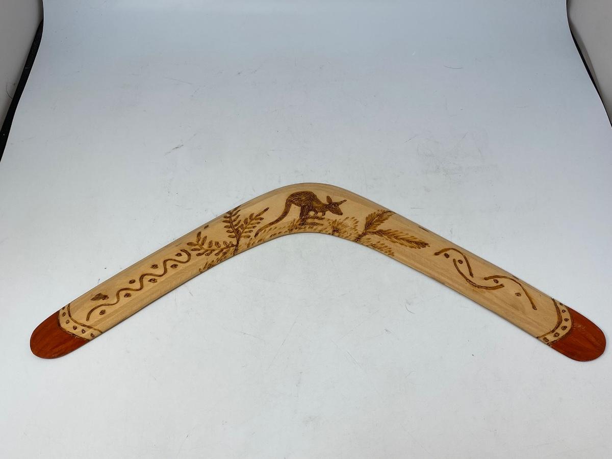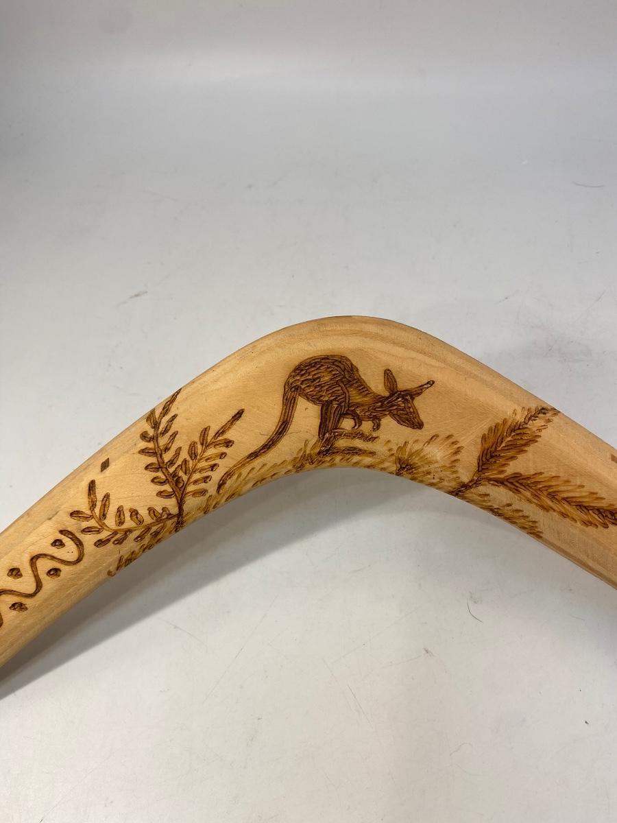 Australian Souvenir Boomerang Burnt Wood Kangaroo Design Signed on Back. Good condition, did not test.