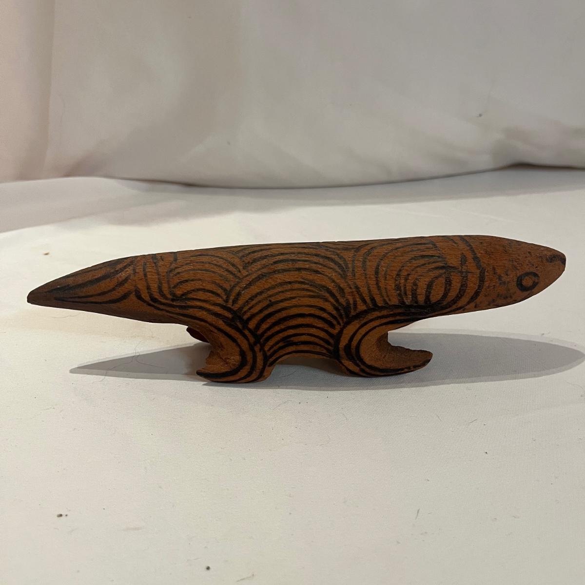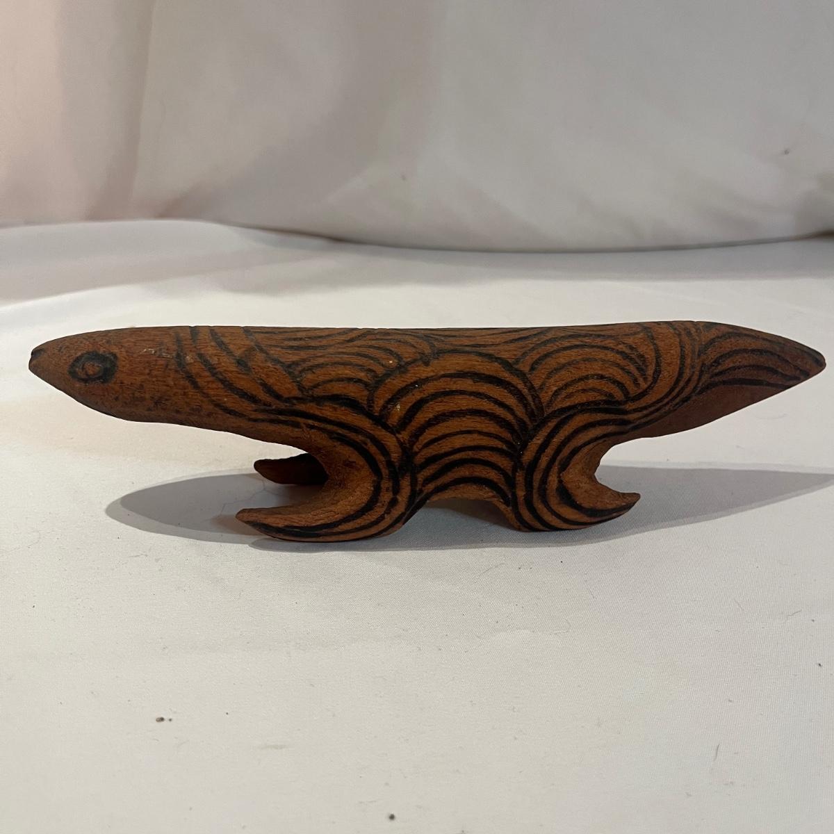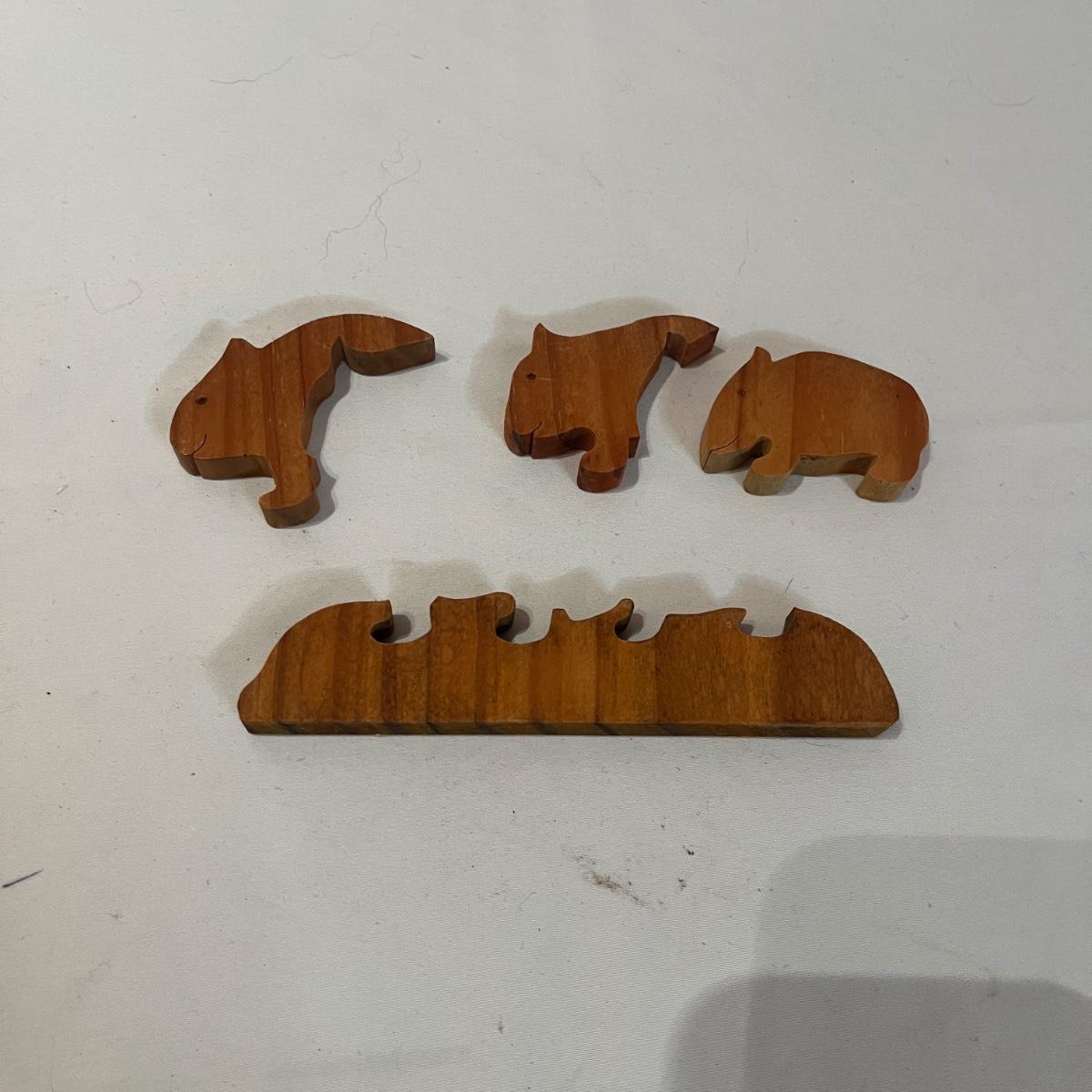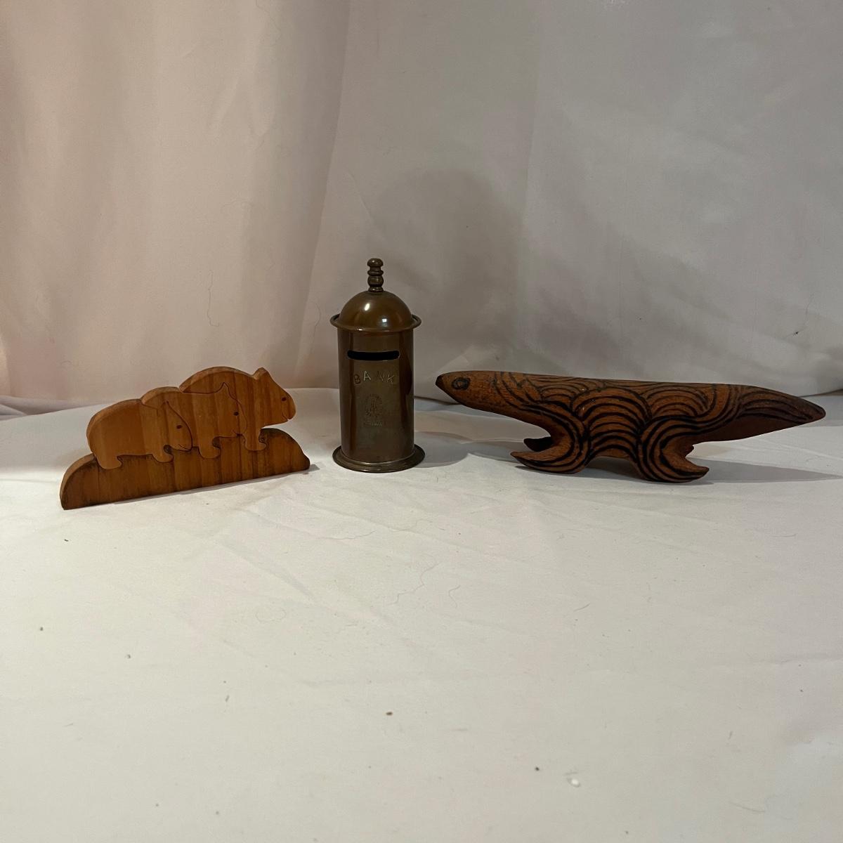 According the the owner, these items are all from Australia. The collection includes a copper Soho Foundry Sovereign Hill Ballarat Copper Money Bank, a wooden wombat puzzle, and an Australian Aboriginal poker art style wooden lizard. Wooden lizard figurine measures 9” x 2” x 2.5”H.