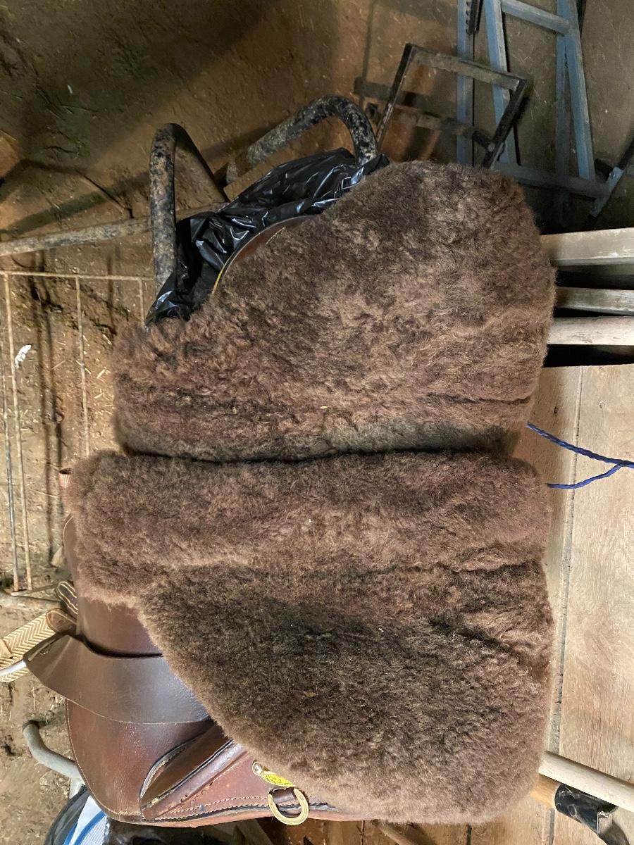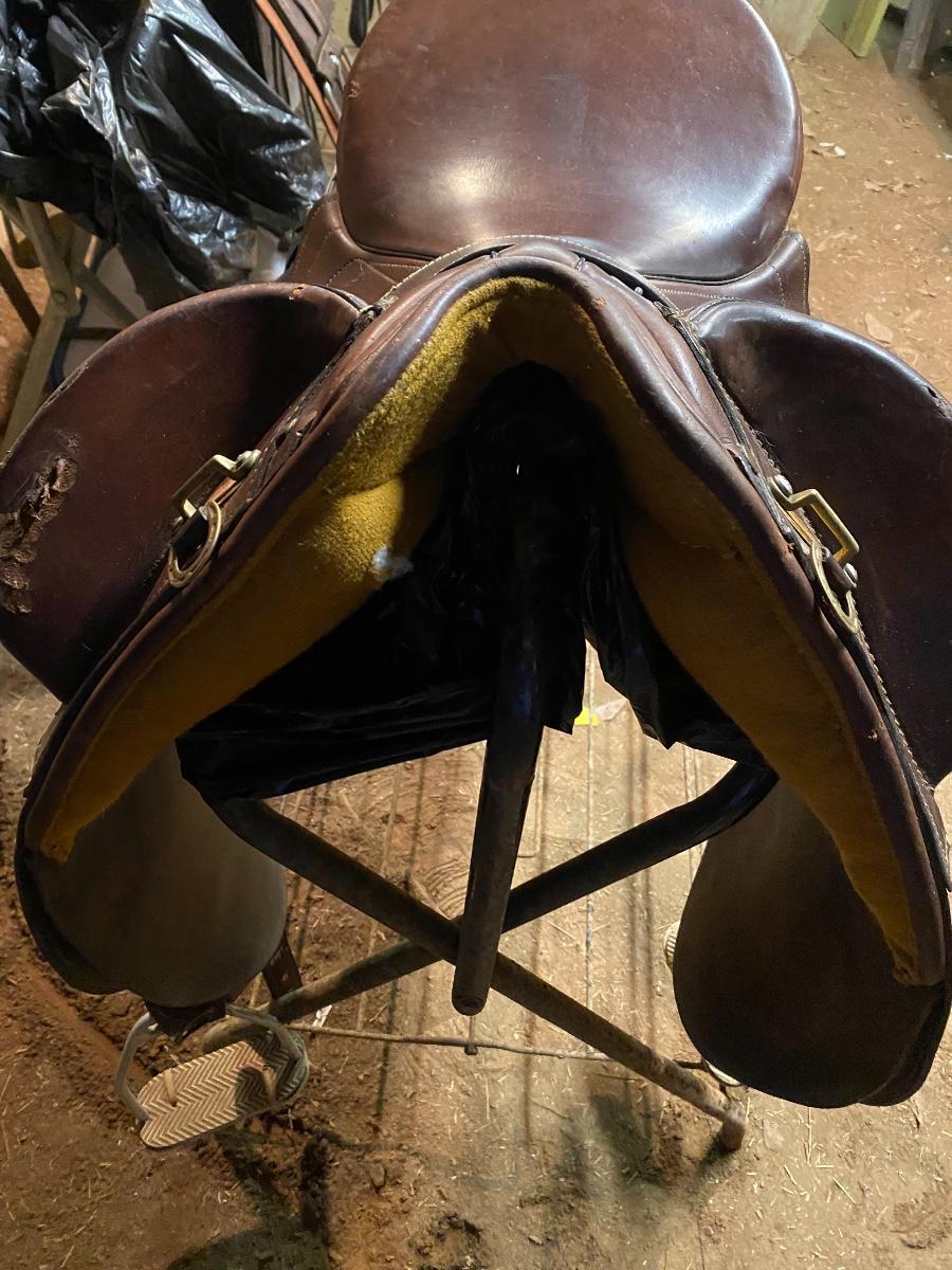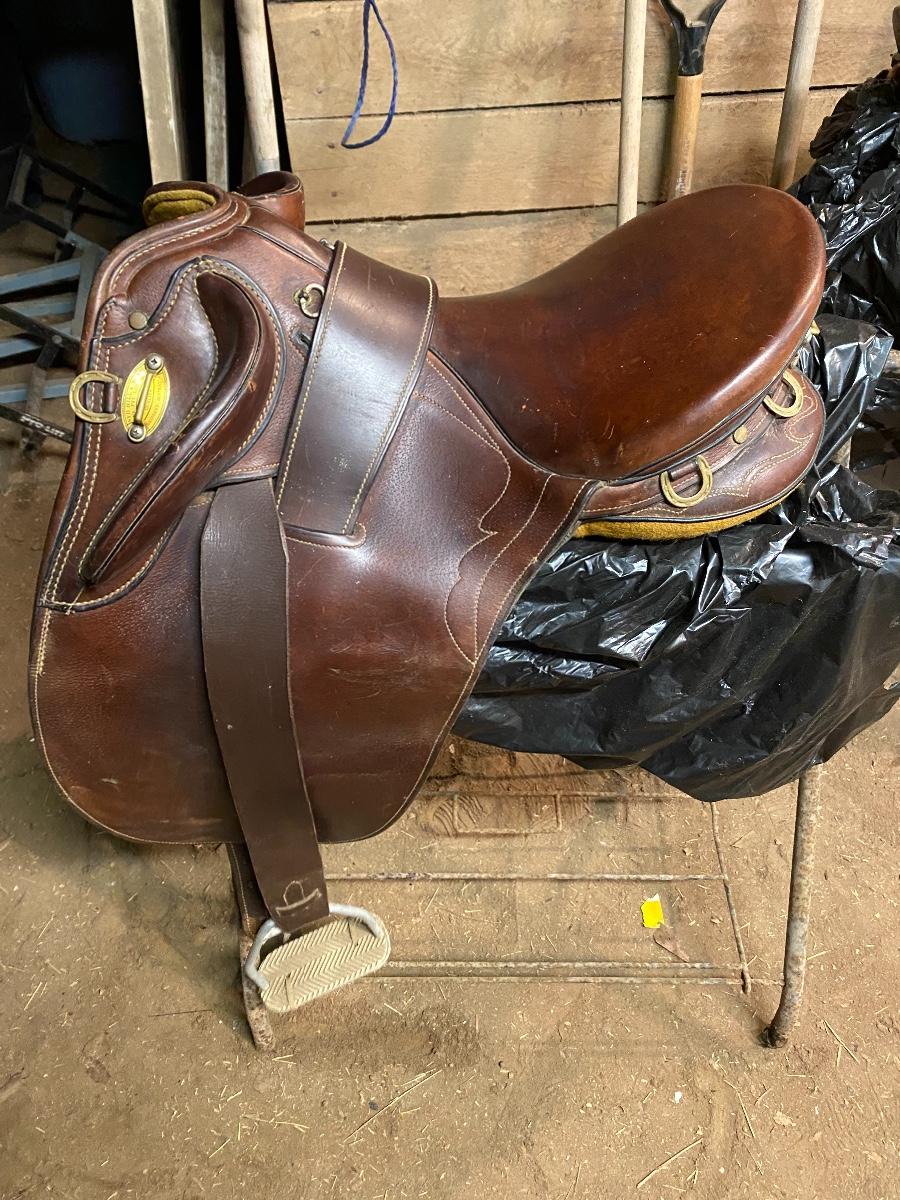 Australian Syd Hill & Sons Suprema quality saddle, Brisbane Australia. Size medium. English stirrups and straps. Saddle is in good condition with some scuffing on fenders. Sheepskin saddle pads included.