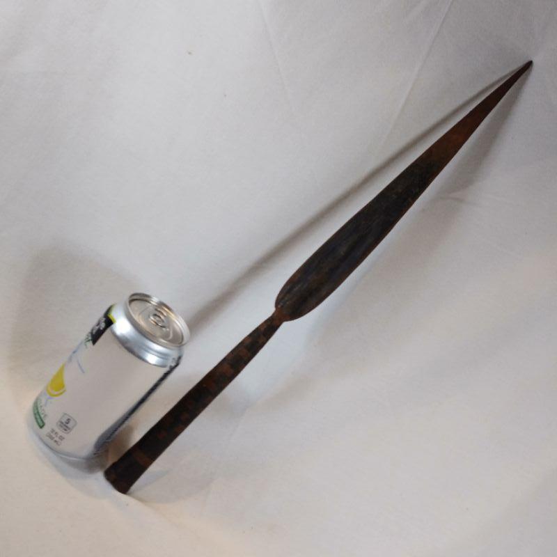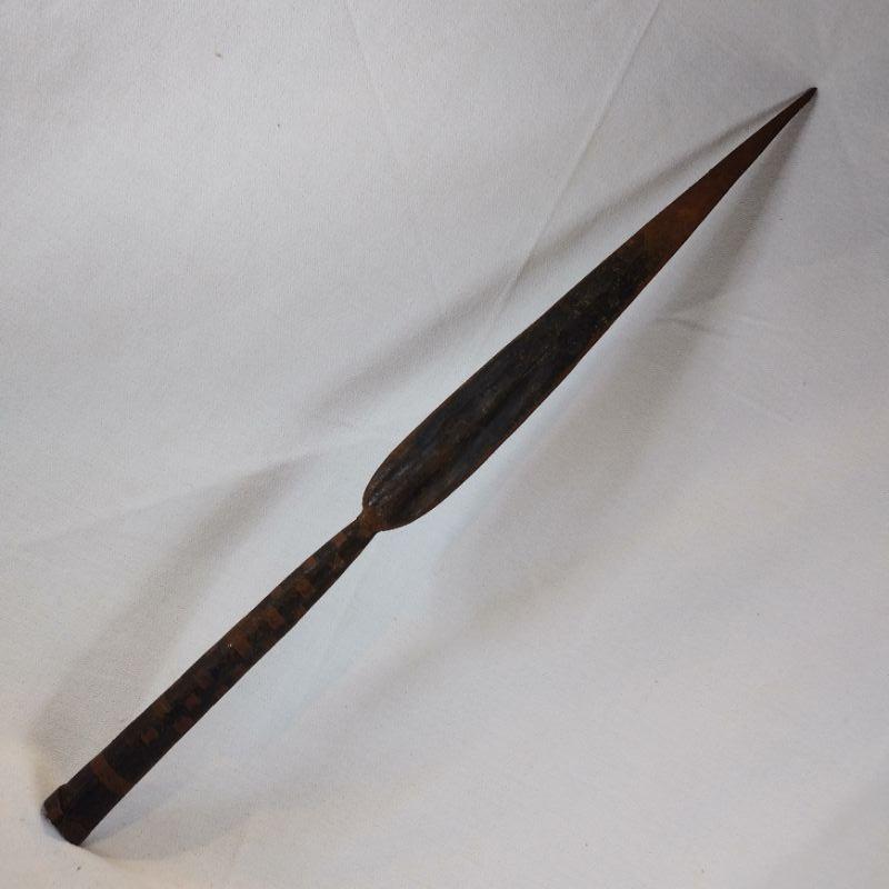 This is one of a pair of very old African Spear Heads. (Second spear is elsewhere in this auction.) Clients lived in Africa in the 40's and brought this home to Louisville in the 60's. It is 19 1/2-inches long X 1 1/2-inches wide. Hand wrought - very heavy and sharp. Amazing.