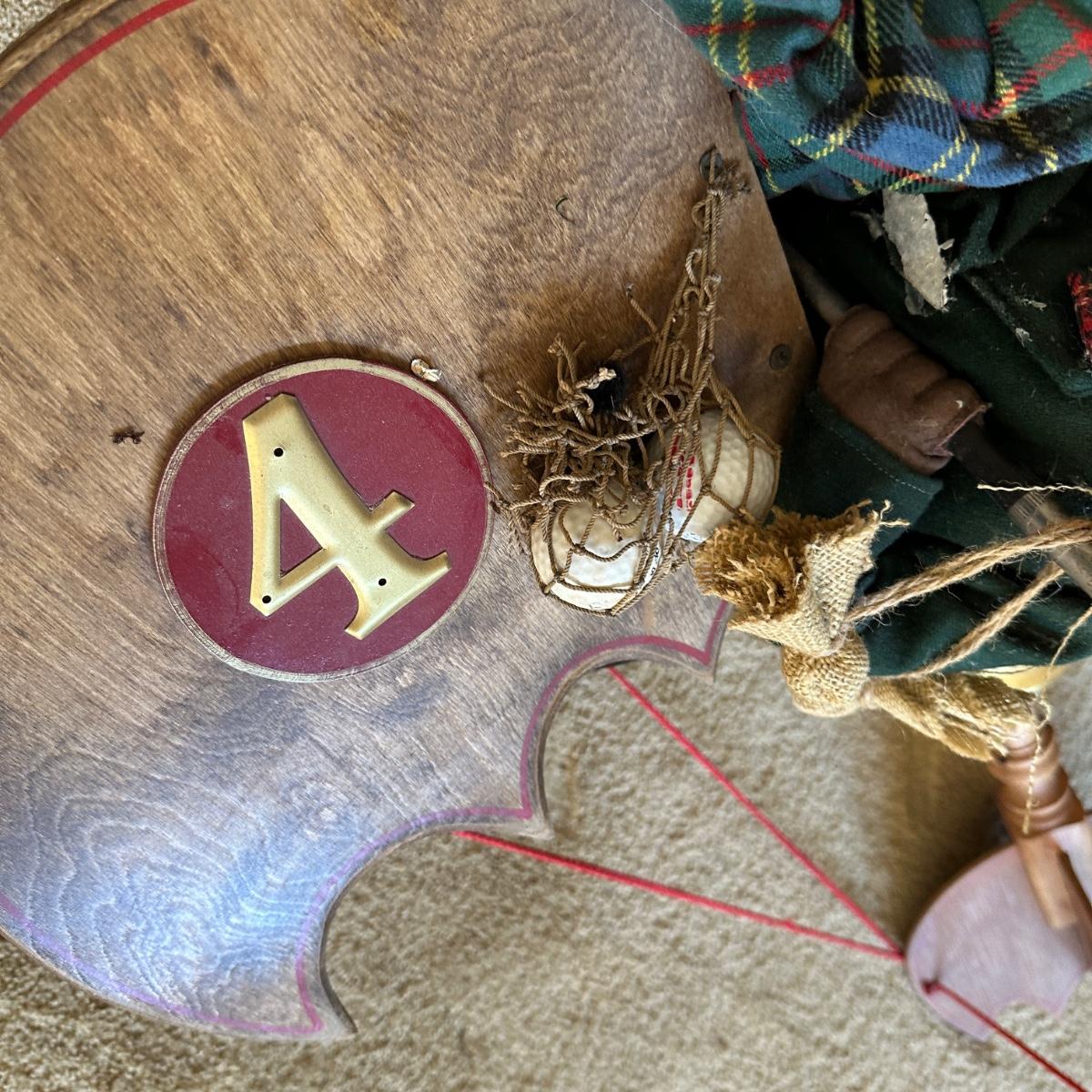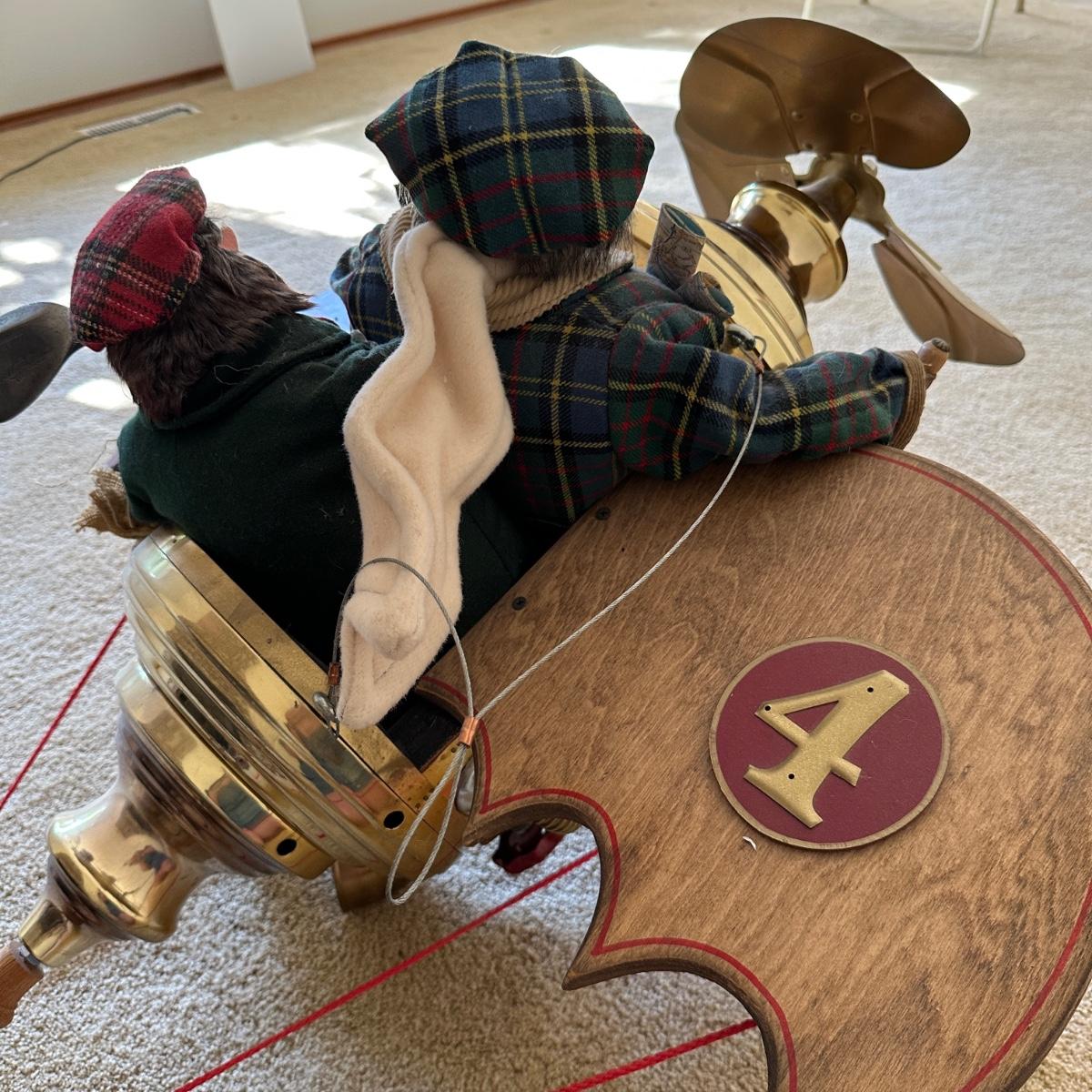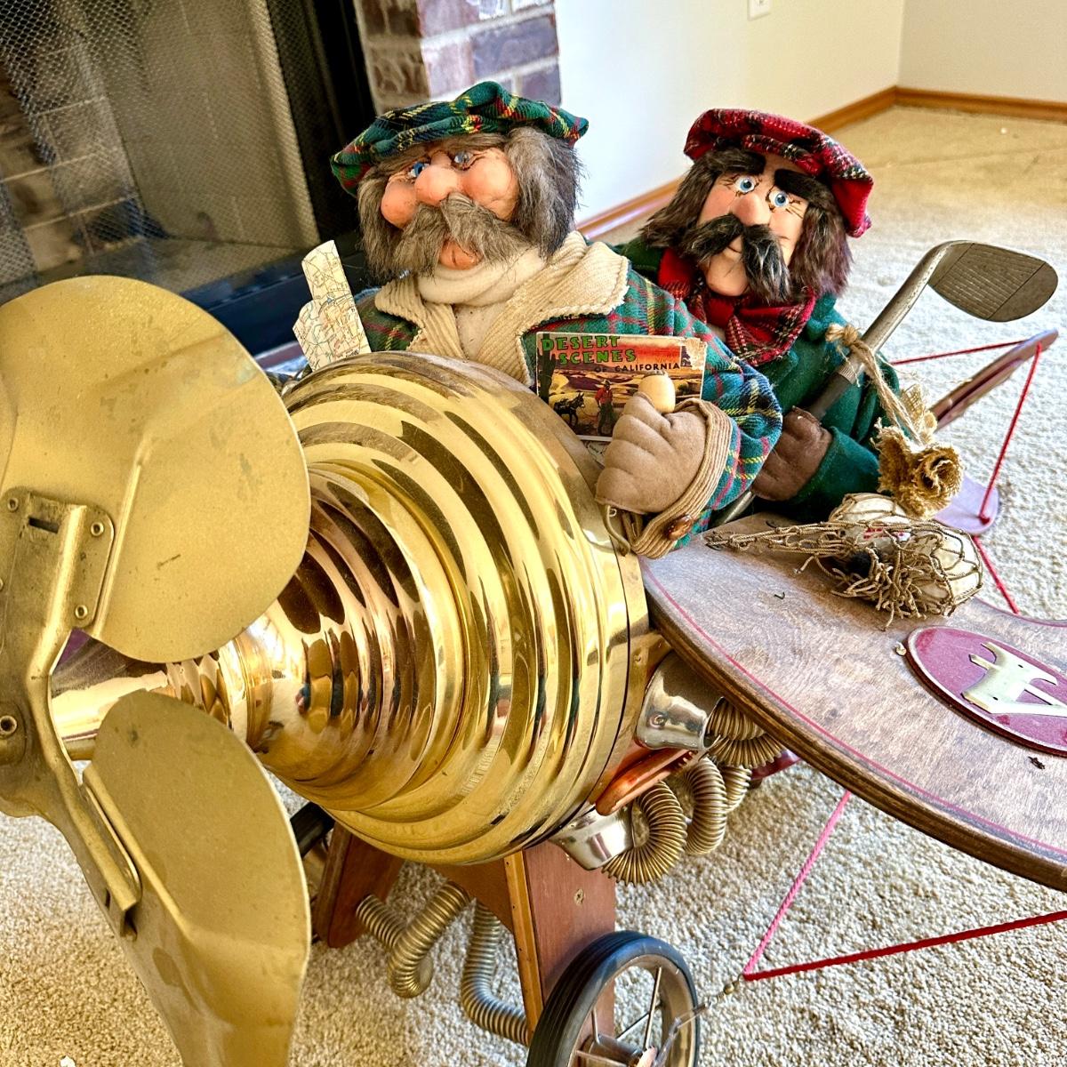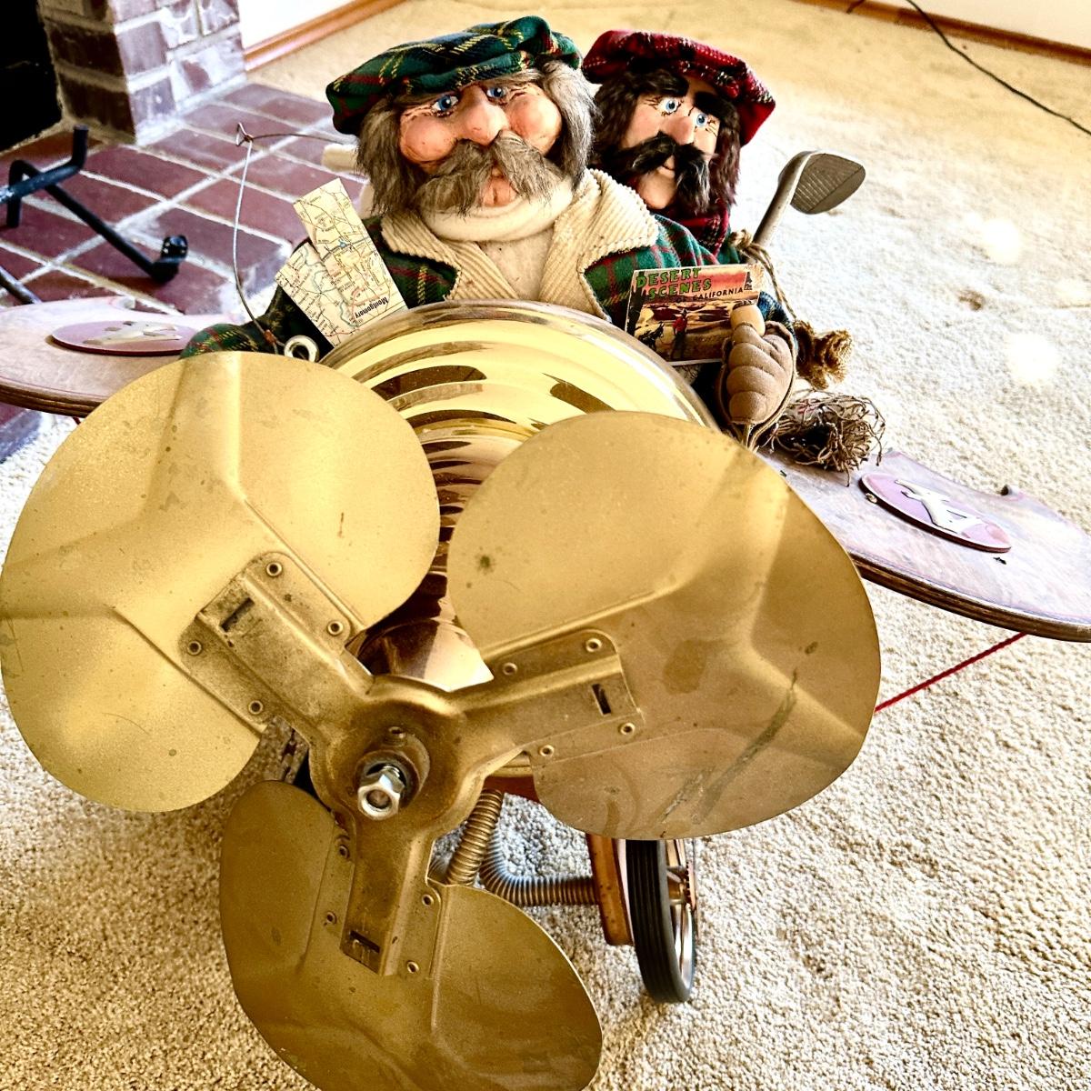 This authentic, and one-of-a-kind Al Kidwell creation features The Wright Brothers on the way to play their next round. Propeller spins and this piece is meant to be hung. 25 inches high and 46 inches long.. One brother wears a green plain jacket and holds a map the other wears a green jacket and carries a #8 golf club