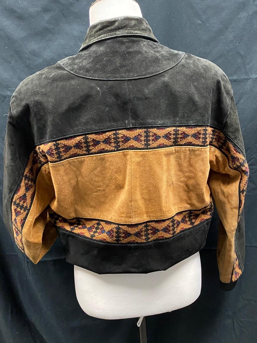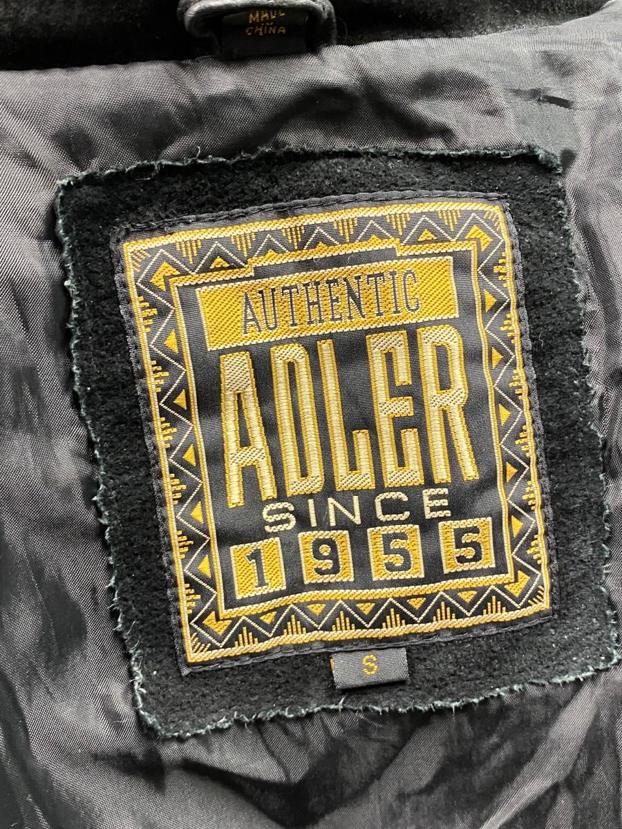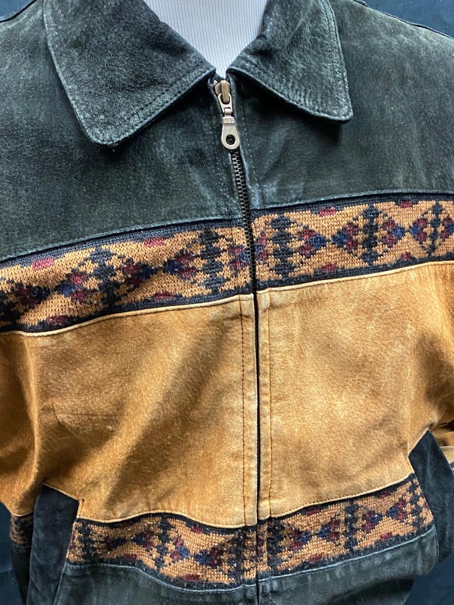 Authentic Alder two tone geometric design leather bomber style jacket. Size small. Previously worn condition. The right shoulder/upper arm is faded compared to the left arm.
