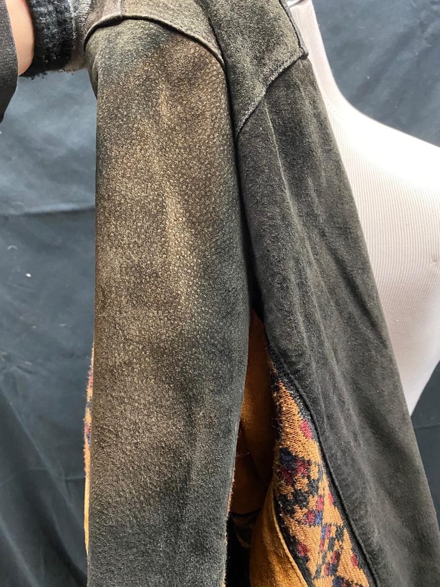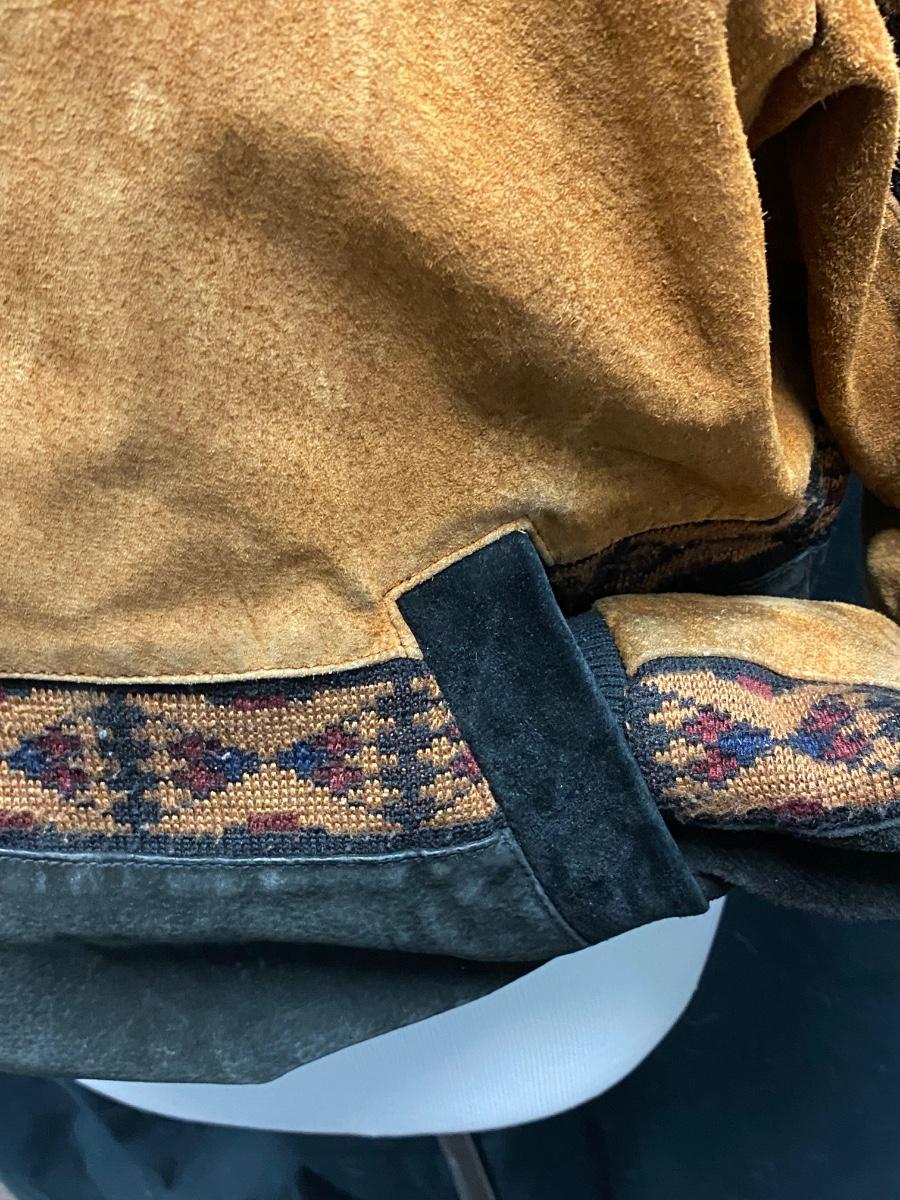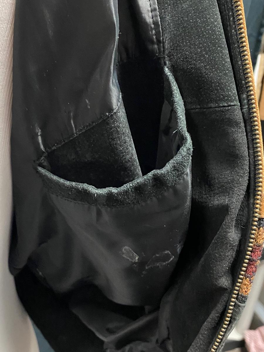 Authentic Alder two tone geometric design leather bomber style jacket. Size small. Previously worn condition. The right shoulder/upper arm is faded compared to the left arm.