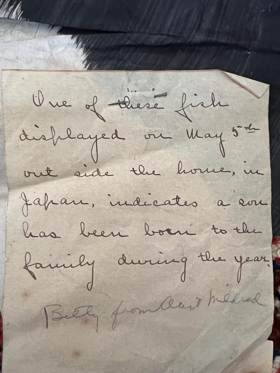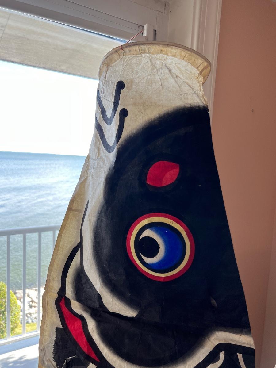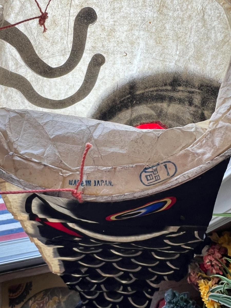 This is an amazing paper koi wind flag 60" long and 20" wide. It comes with a note attached explaining it was hung outside the house in Japan indicating a son has been born.