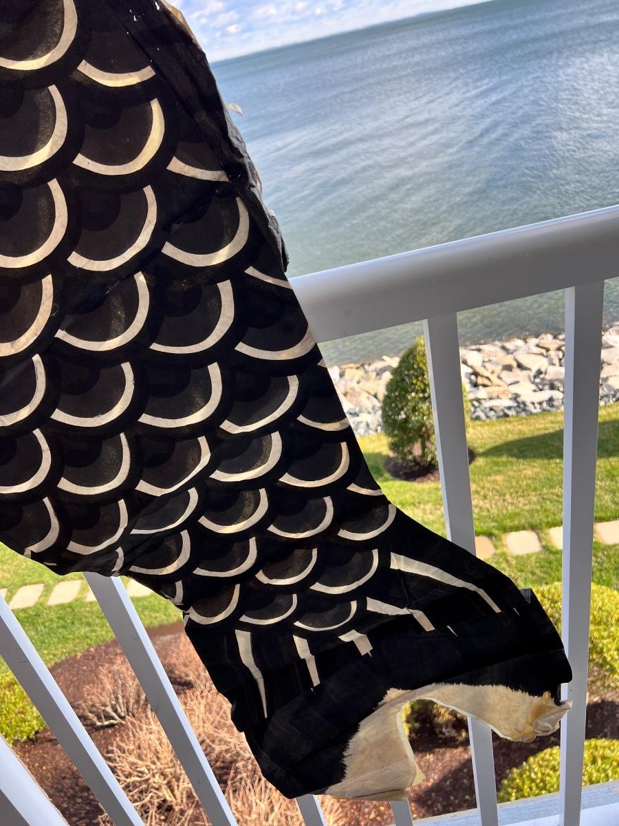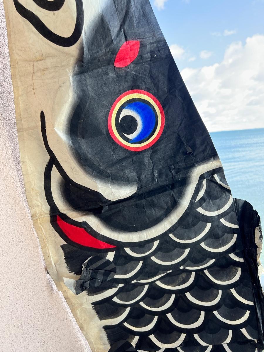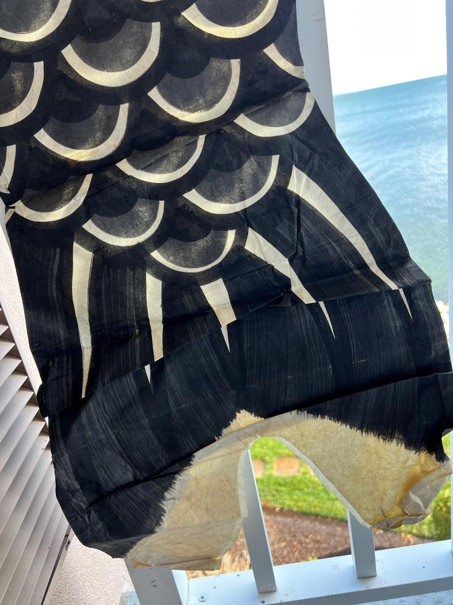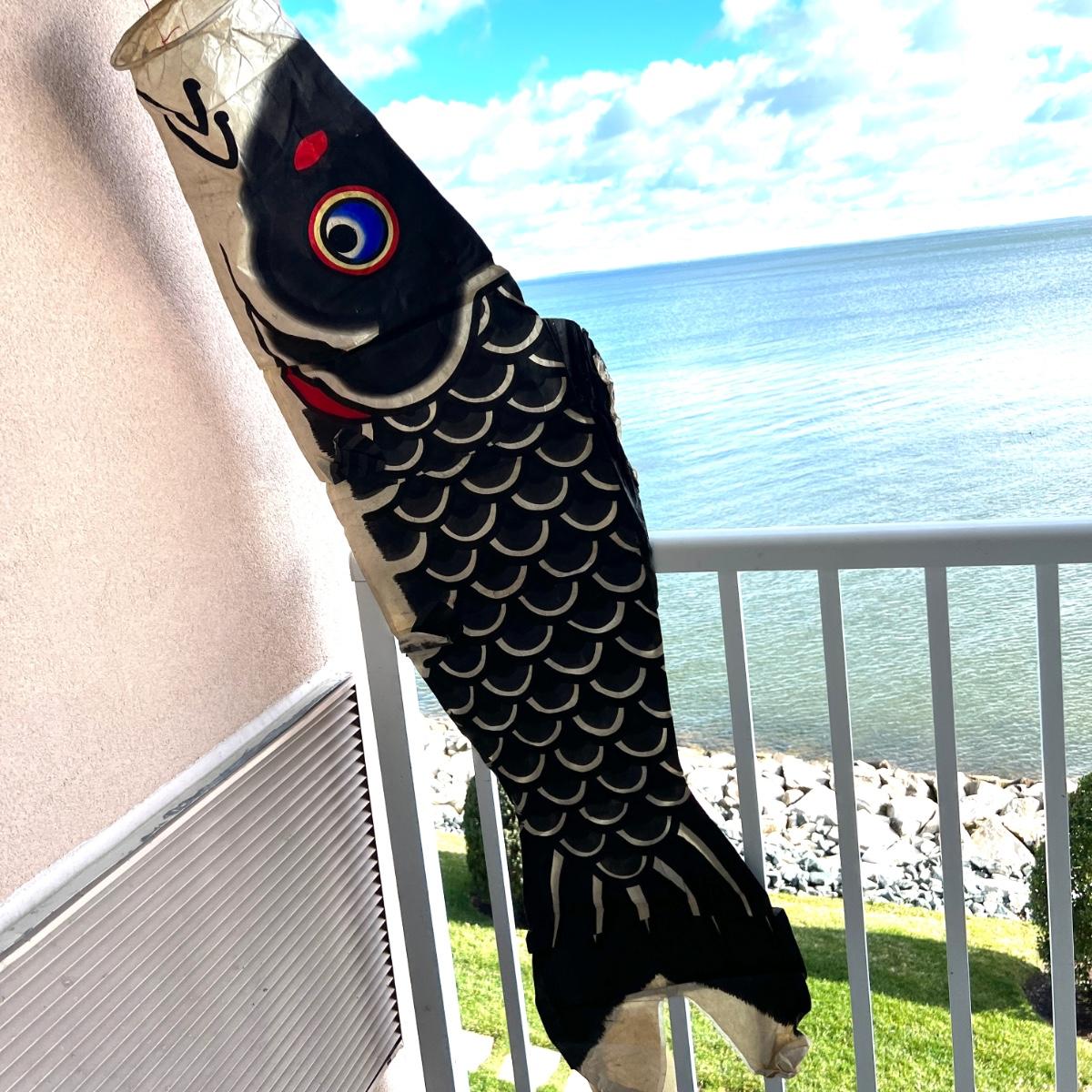 This is an amazing paper koi wind flag 60" long and 20" wide. It comes with a note attached explaining it was hung outside the house in Japan indicating a son has been born.