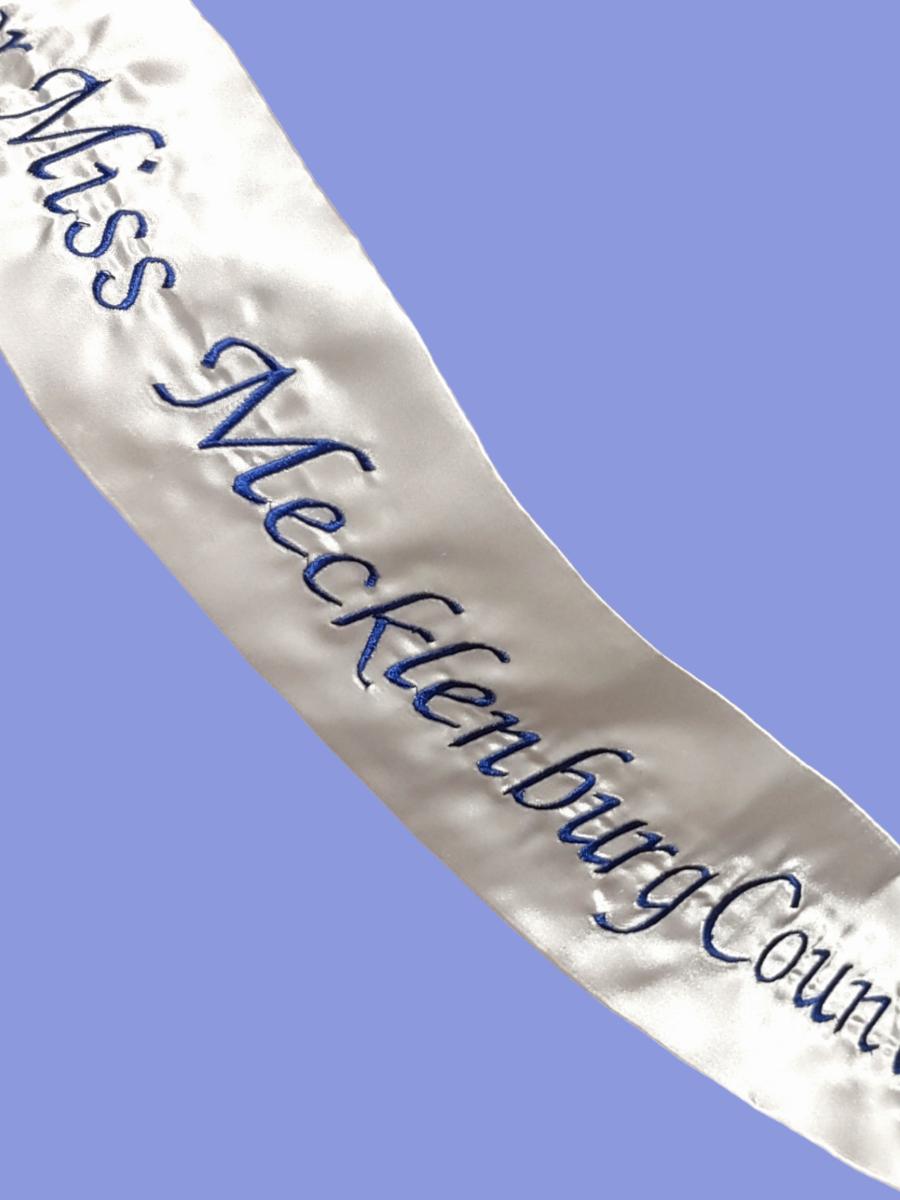 - White Satin w/ Blue Embroidered Words - "2008 Junior Miss Mecklenburg County"