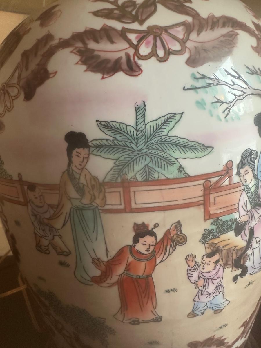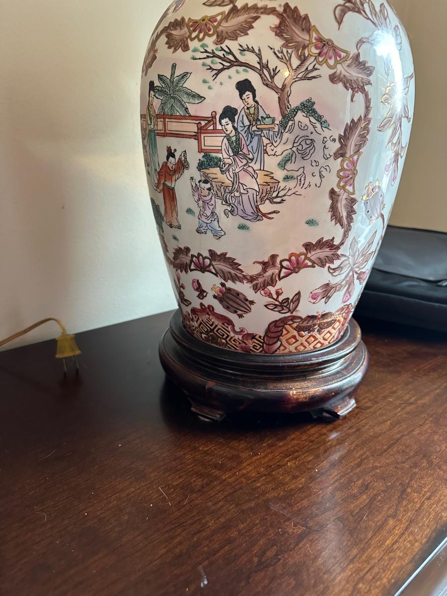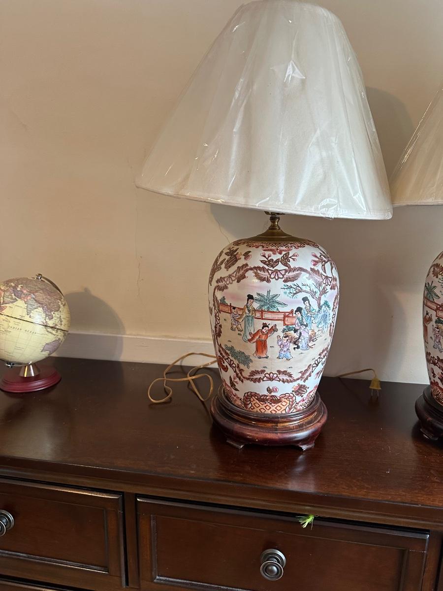 These are a pair of vintage Chinese-style porcelain ginger jar table lamps, featuring hand-painted Chinoiserie motifs of figures and florals on a wooden base.