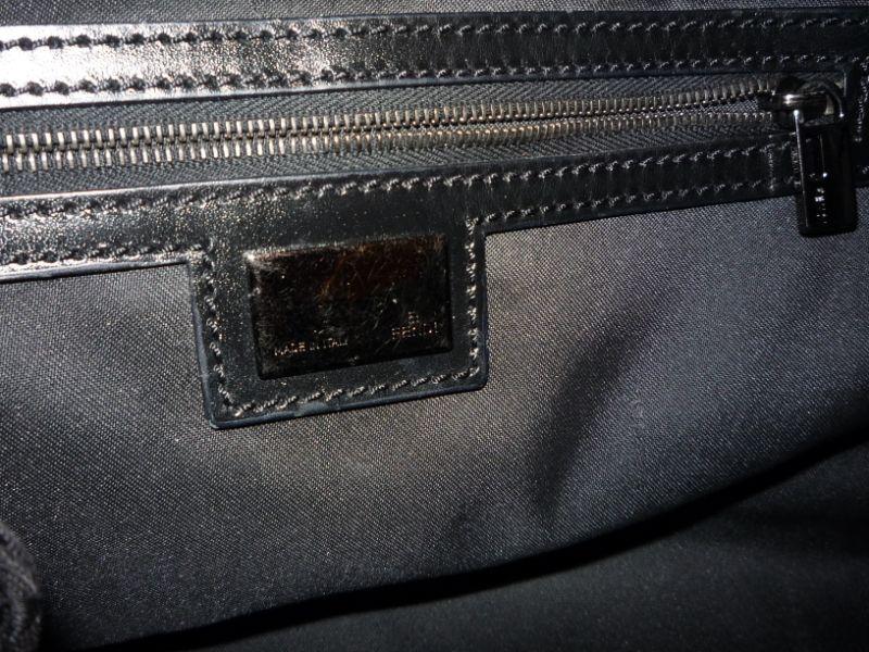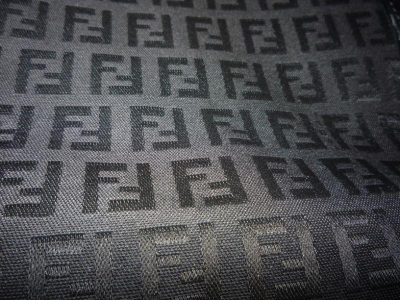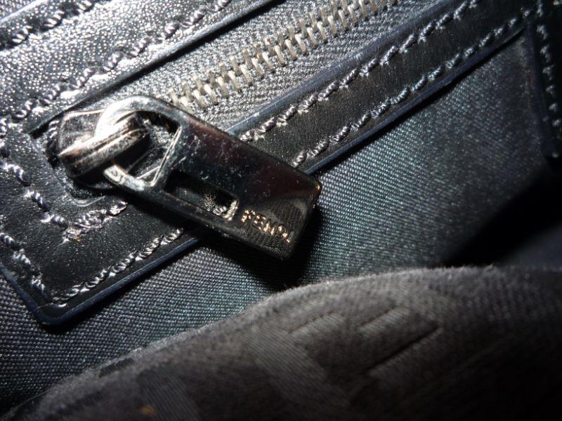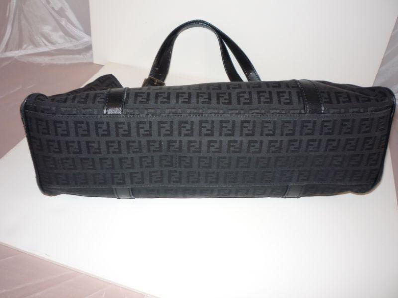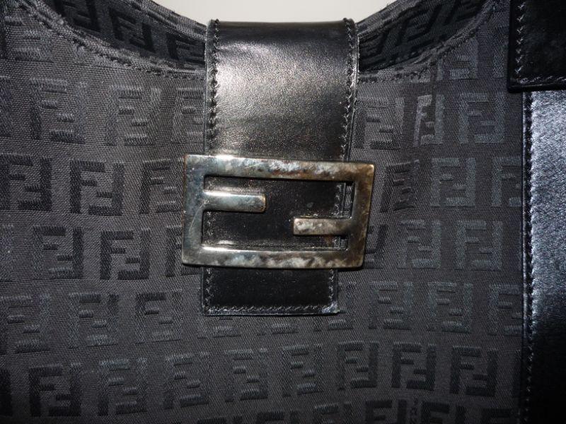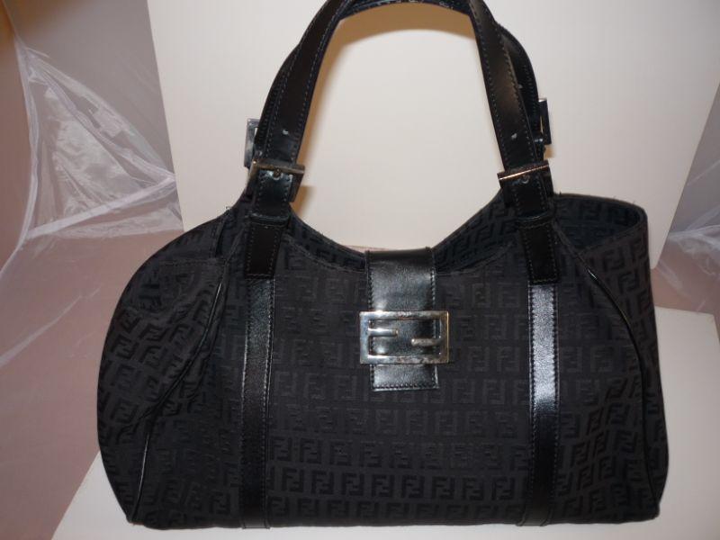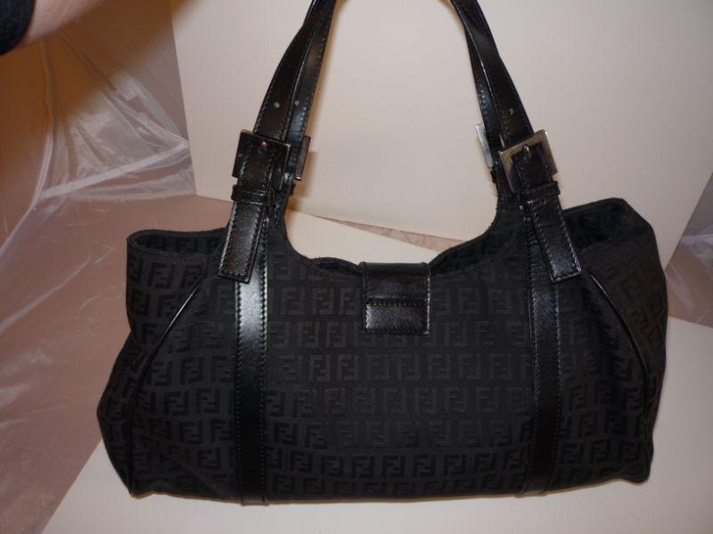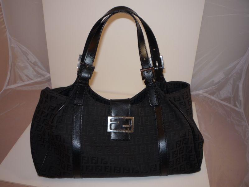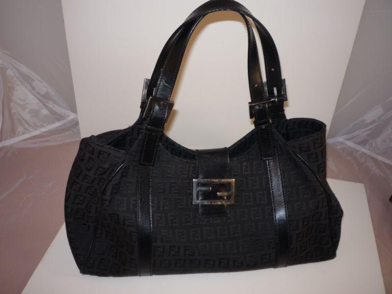 Black Fendi handbag - over the shoulder or handheld - interior zipper - magnetic close. Traditional Fendi logo embossed cloth canvas-like material. Leather straps - latch needs polish but will leave that to the lucky bidder.