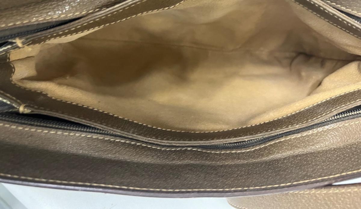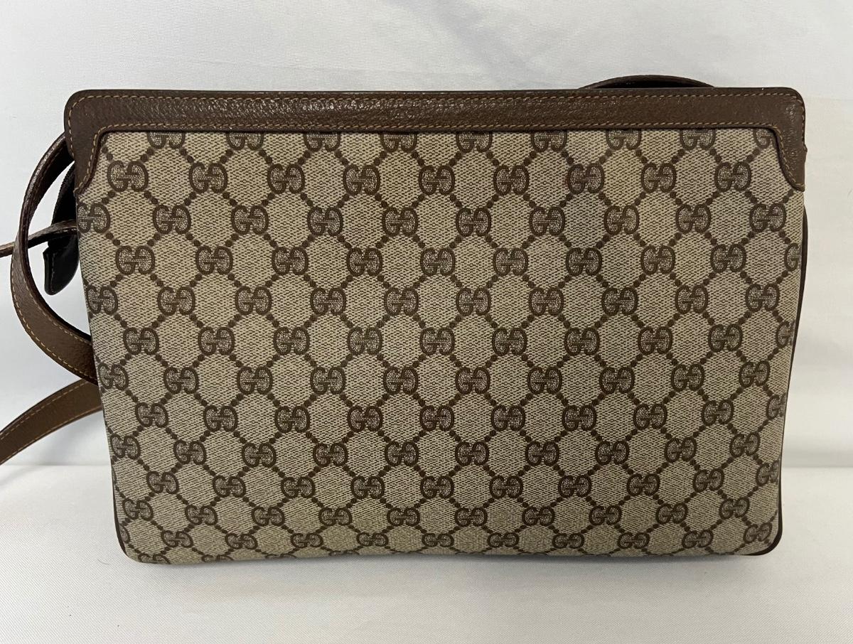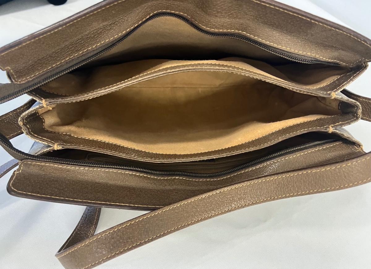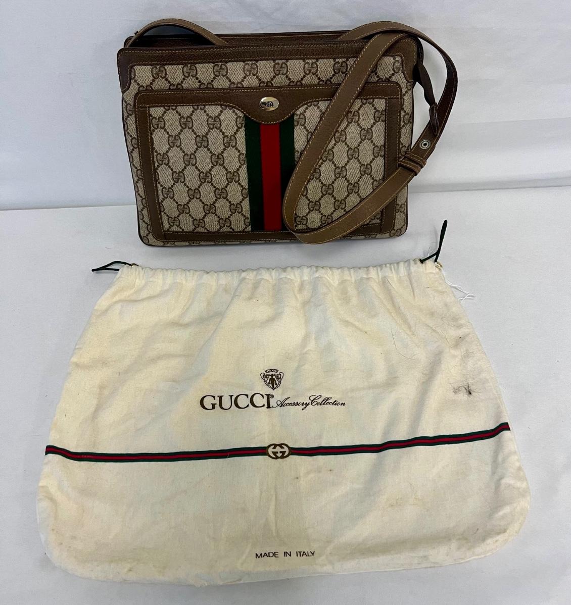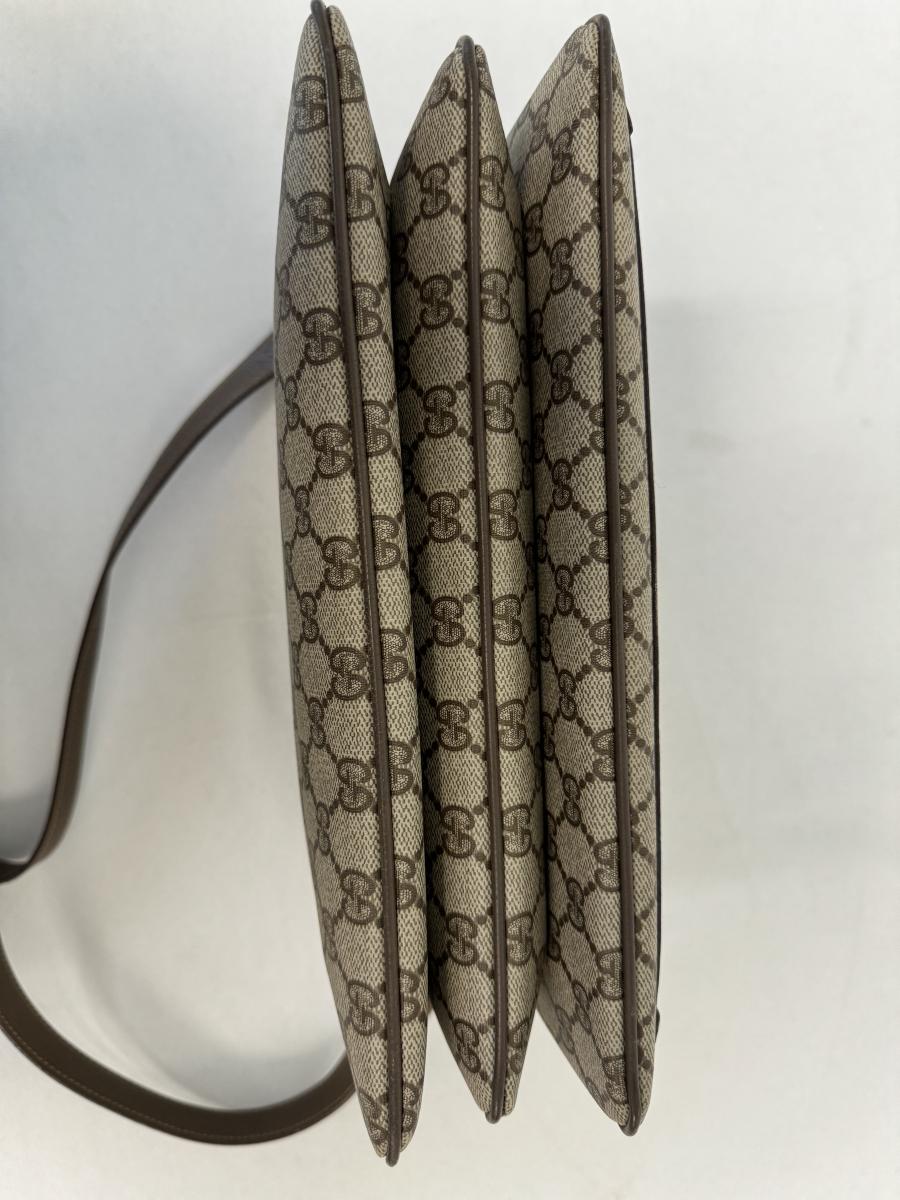 GG monogram. Three inner compartments with inner zipped pocket, and outer front sleeve pocket. Strap is adjustable from short shoulder to long shoulder. Stain free. Includes dust cover. Measurement: 12.75"L x 8.75"H (body, approximate). [LA]