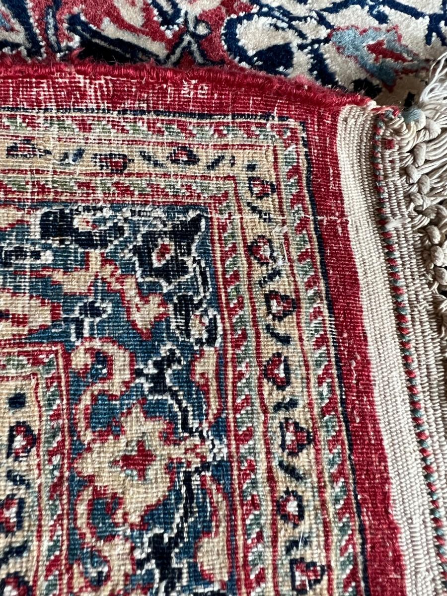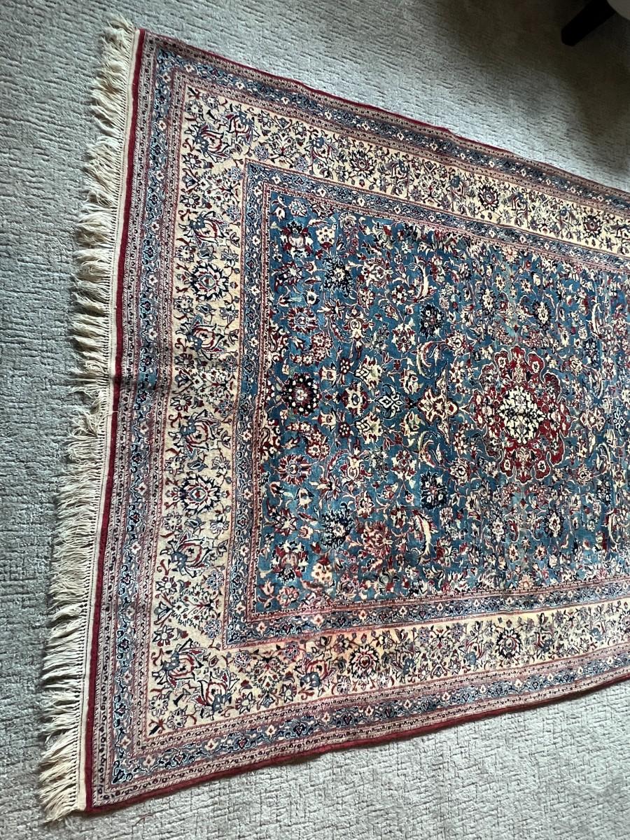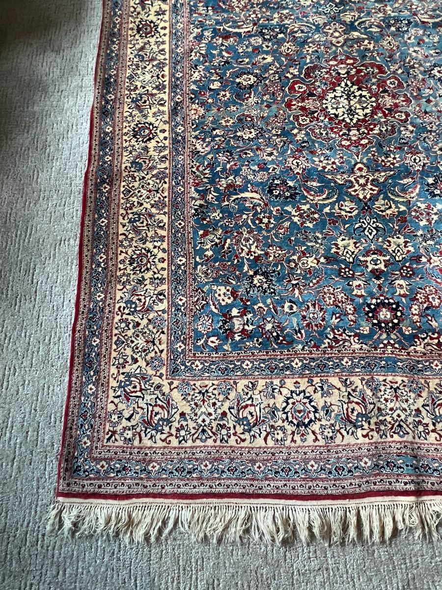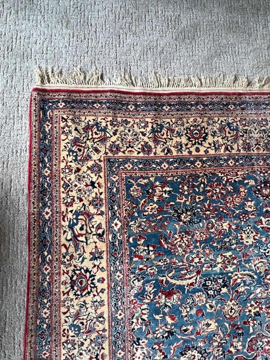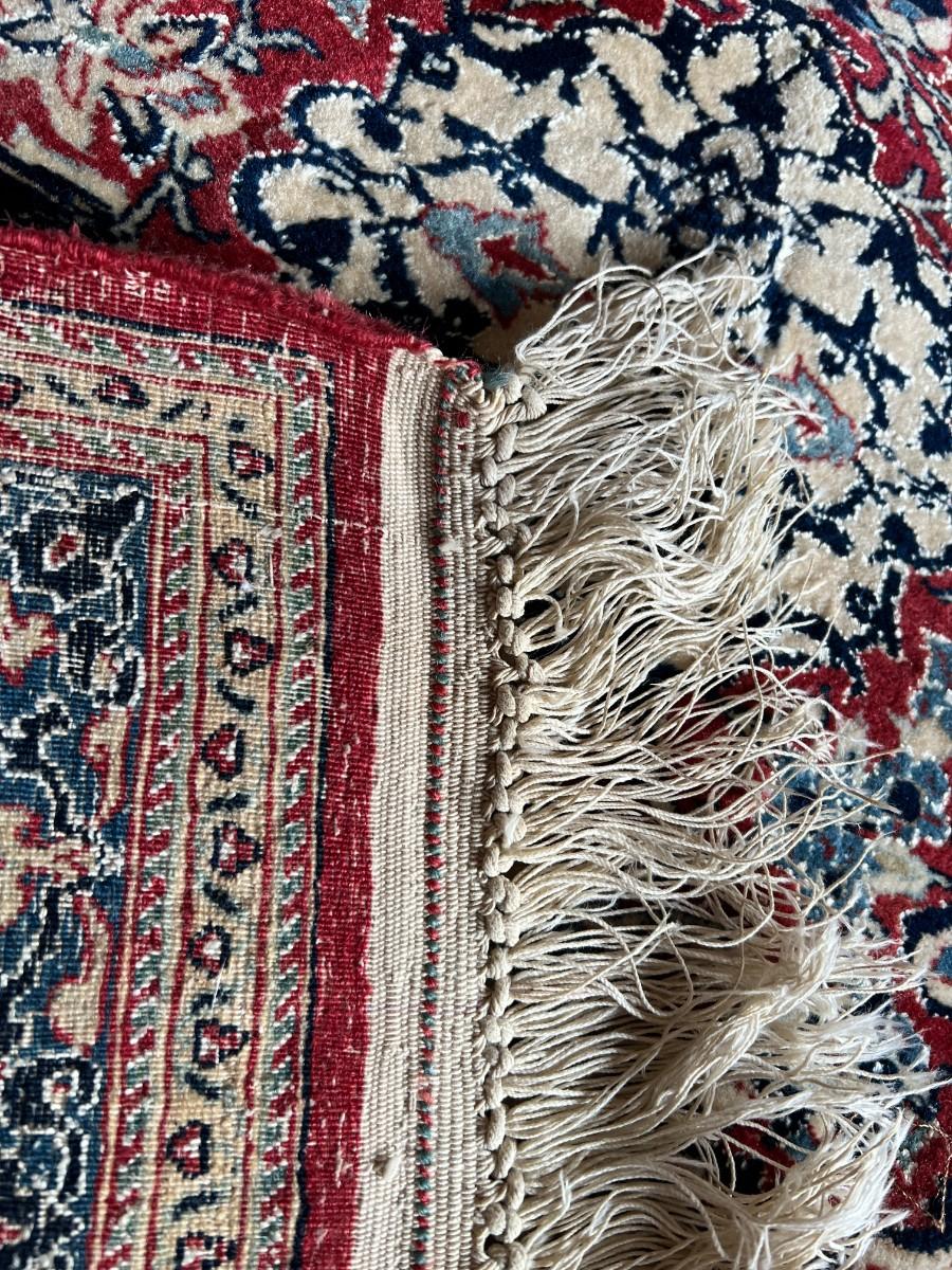 Beautiful and rare authentic handmade Persian rug using the nain tabas knot style. Wool and silk. Rug features a blue and deep burgundy red pattern with tan accents. In good condition, with some light signs of wear (condition as shown in photos).