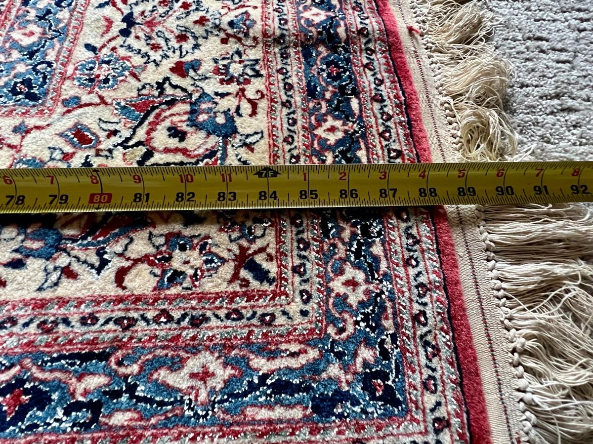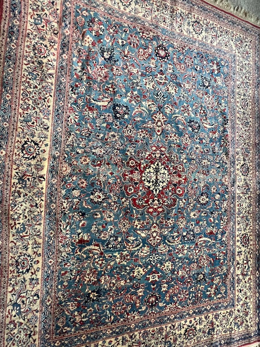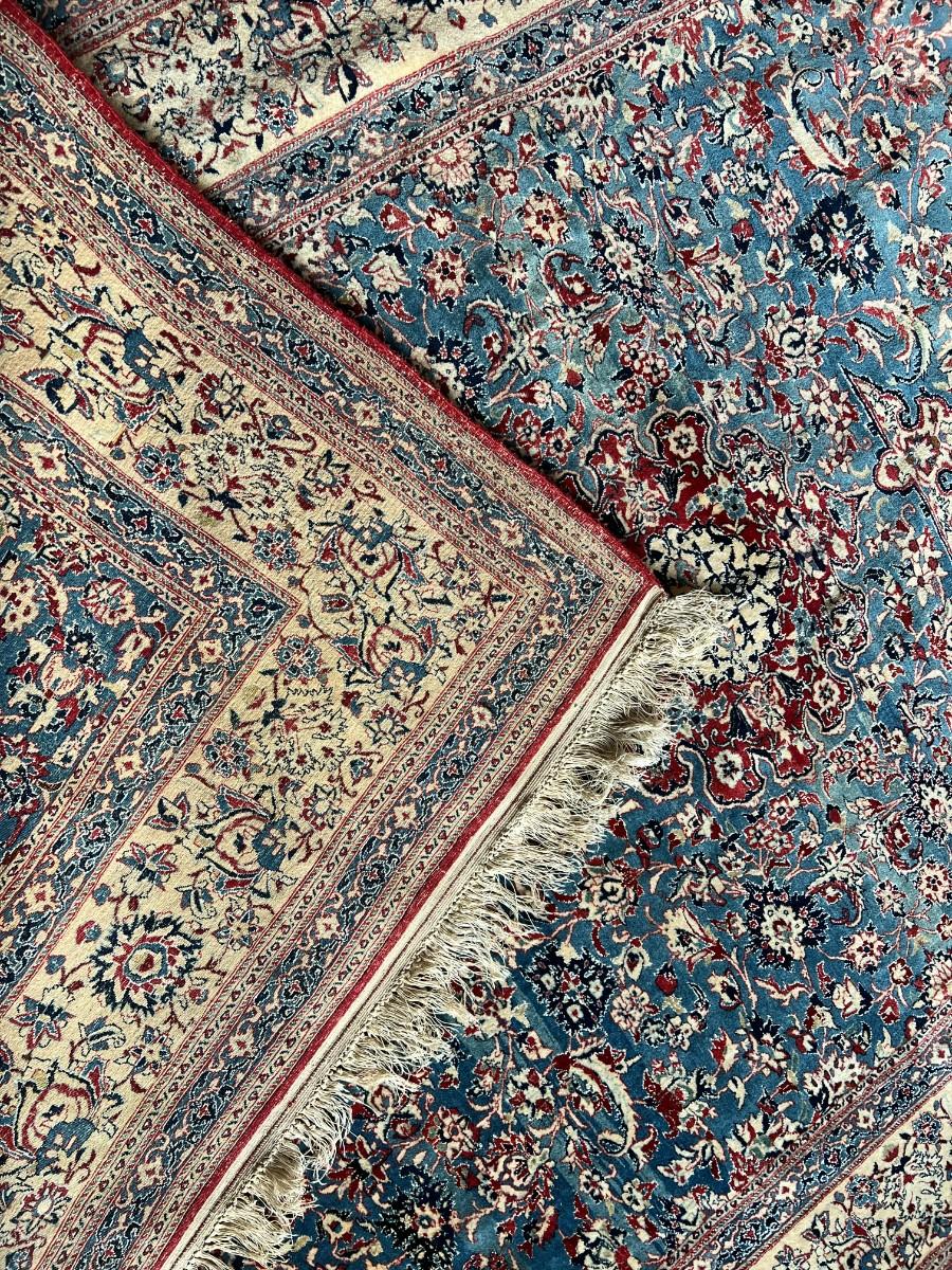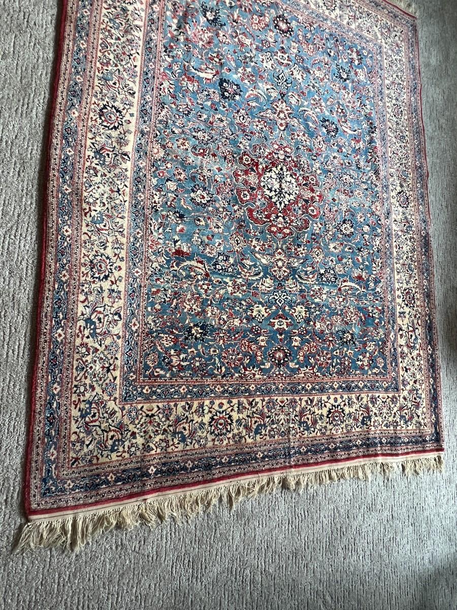 Beautiful and rare authentic handmade Persian rug using the nain tabas knot style. Wool and silk. Rug features a blue and deep burgundy red pattern with tan accents. In good condition, with some light signs of wear (condition as shown in photos).