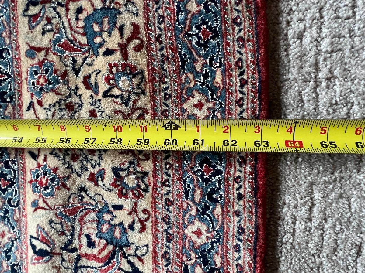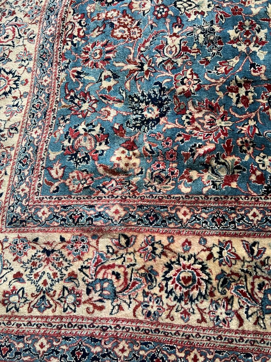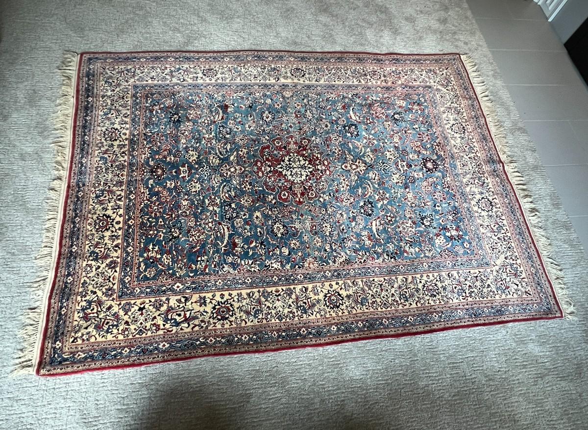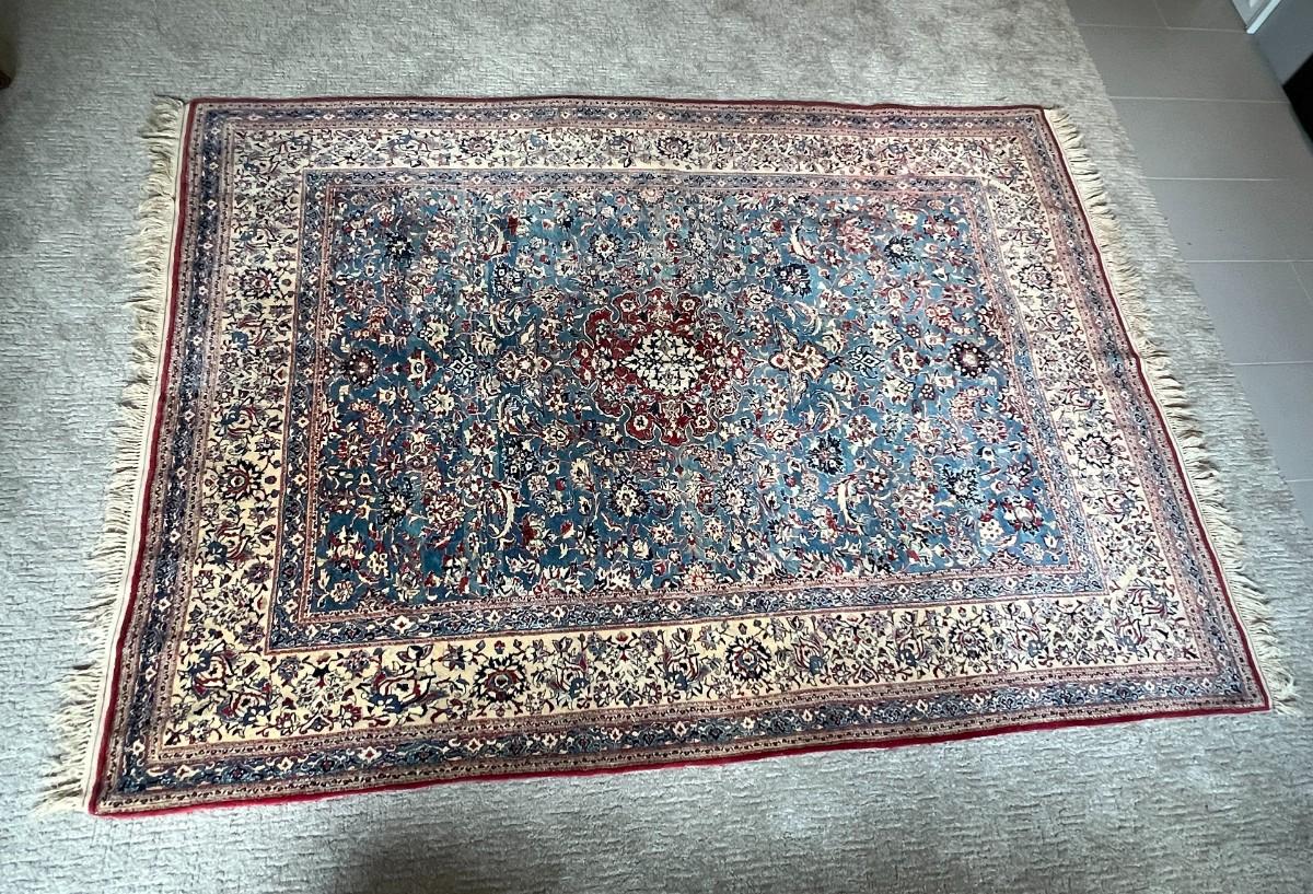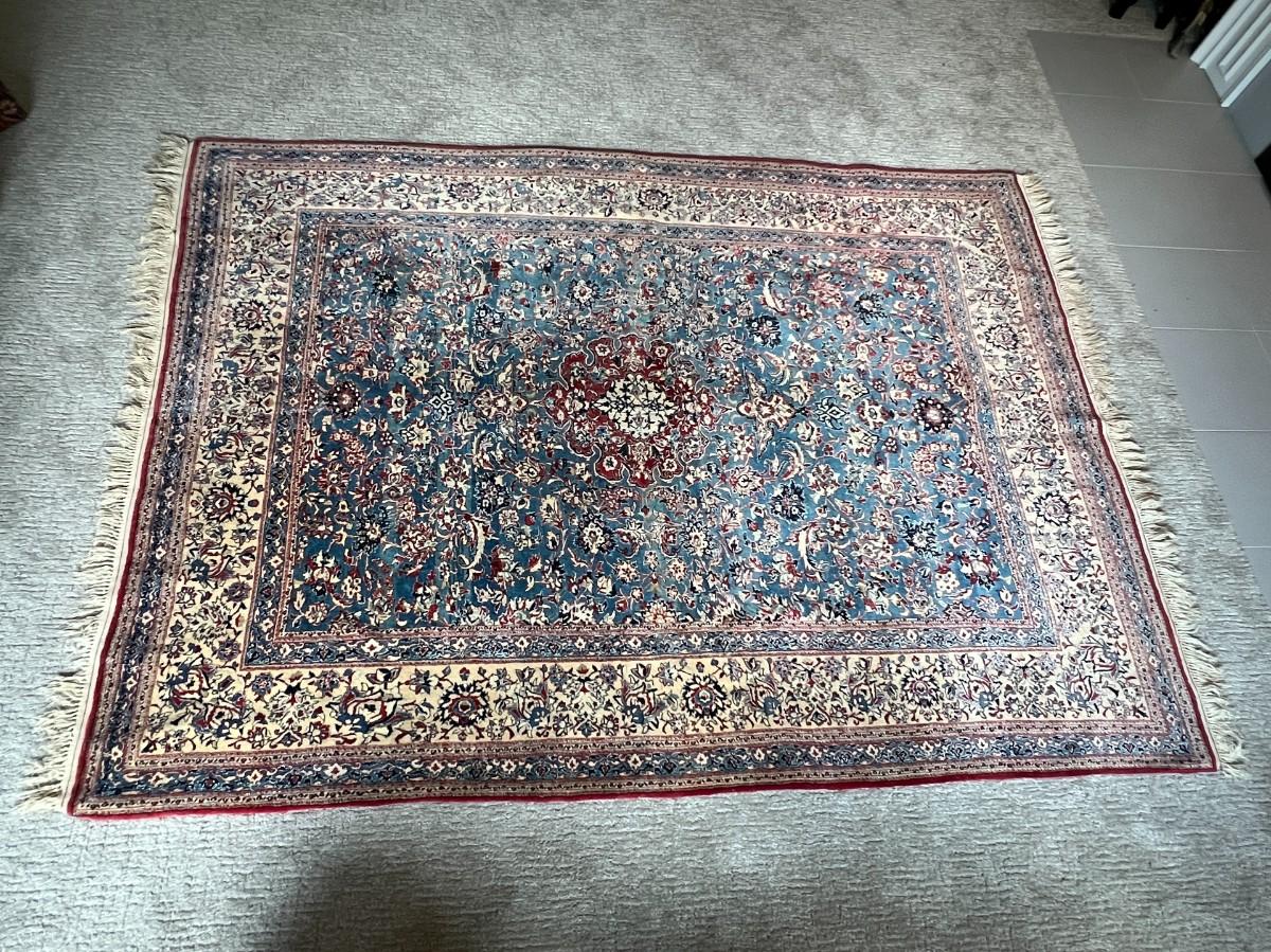 Beautiful and rare authentic handmade Persian rug using the nain tabas knot style. Wool and silk. Rug features a blue and deep burgundy red pattern with tan accents. In good condition, with some light signs of wear (condition as shown in photos).