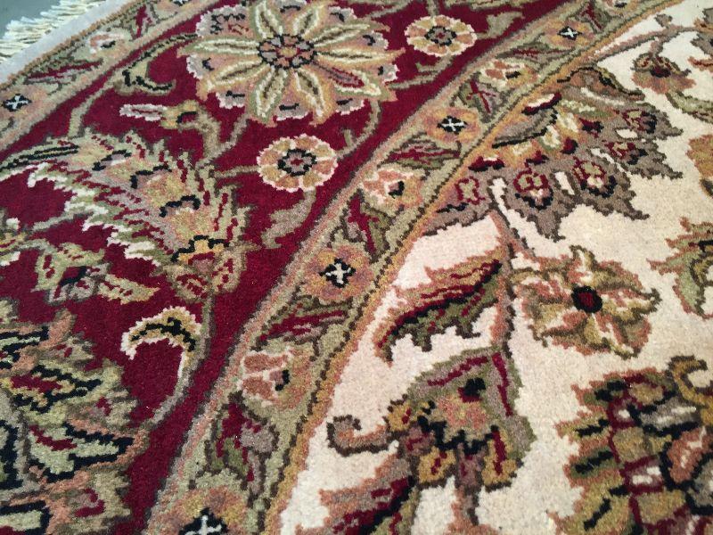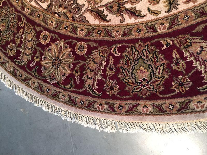8x8 Hand Knotted authentic Jaipur round rug in tan , burgundy and multi accent colors Vege dye Hand Knotted in India 100% Natural wool pile