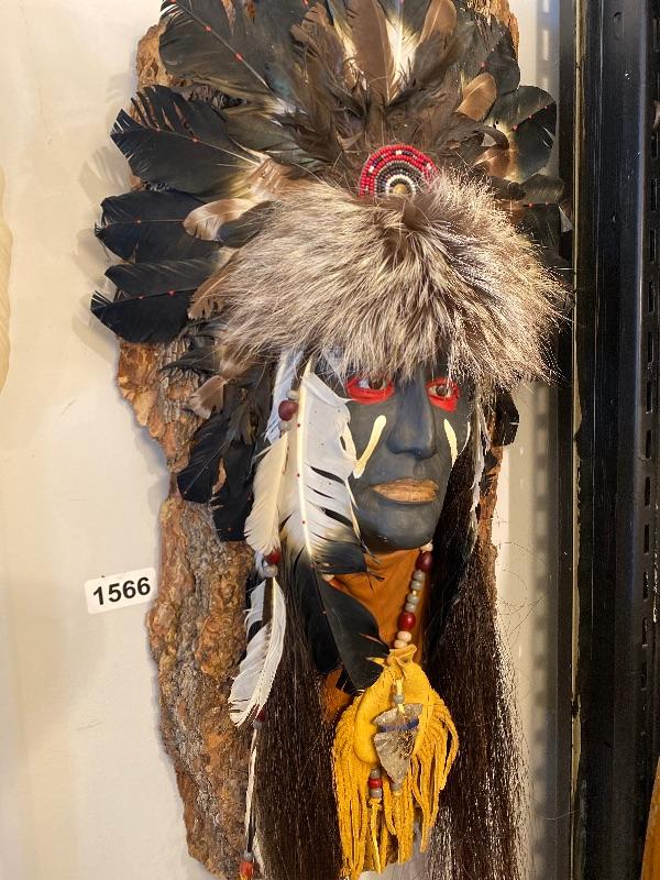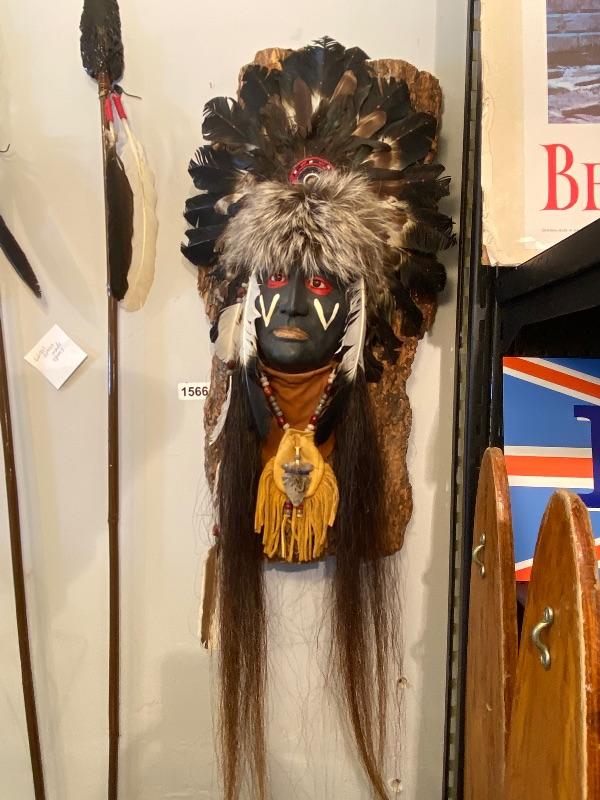 Real leather, seed beads, feathers, arrowhead, glass eyes, horse hair on half a log, handpainted spirit mask 26“ x 12“