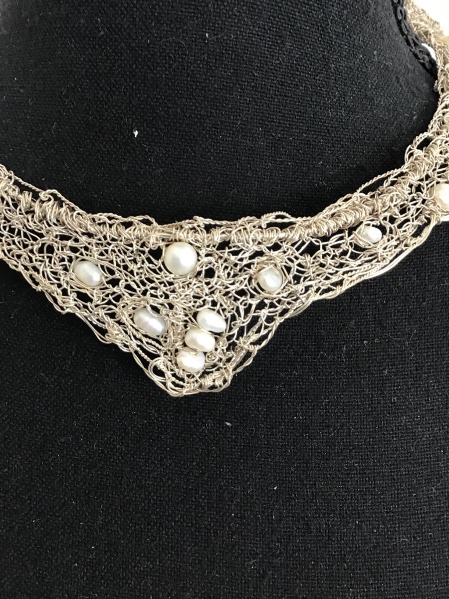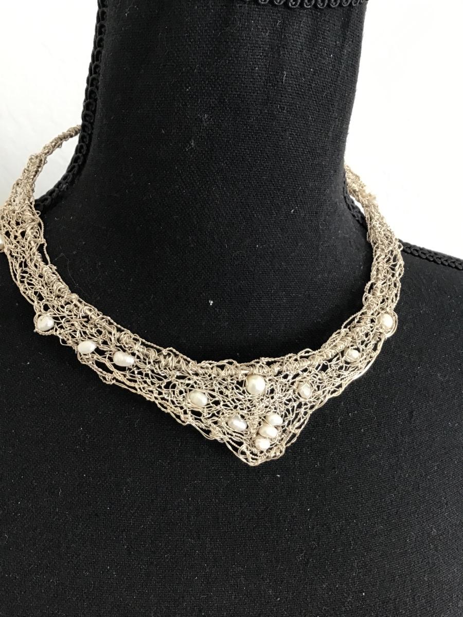 Authentic Pearls and Silver Wire Mesh Collar Necklace Vintage