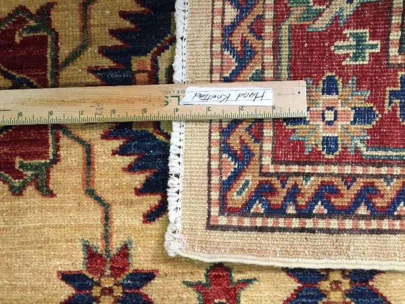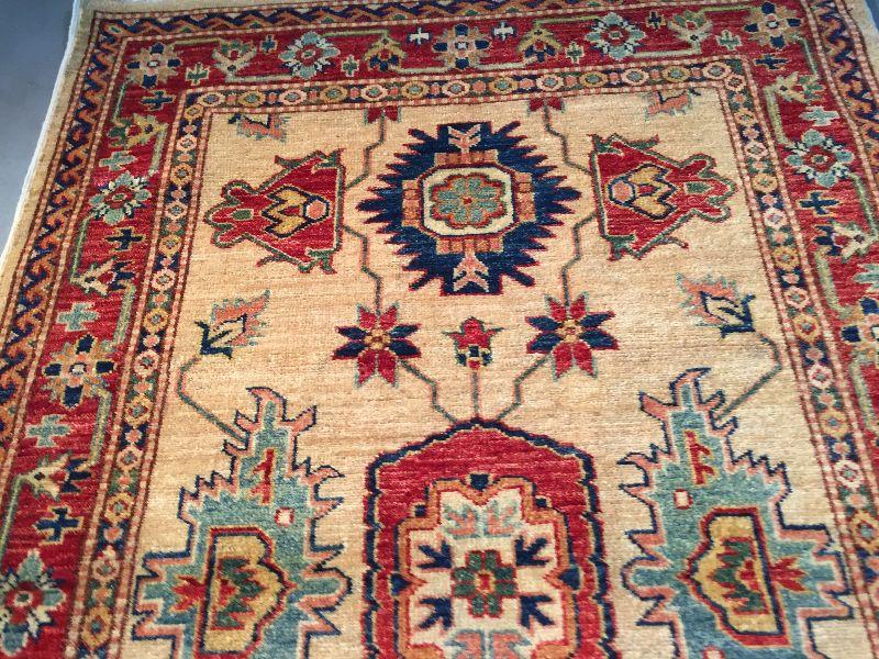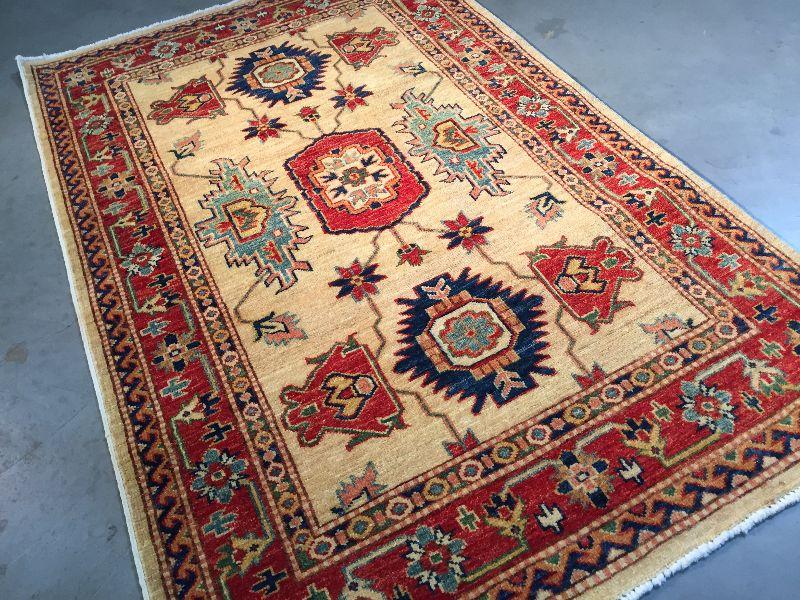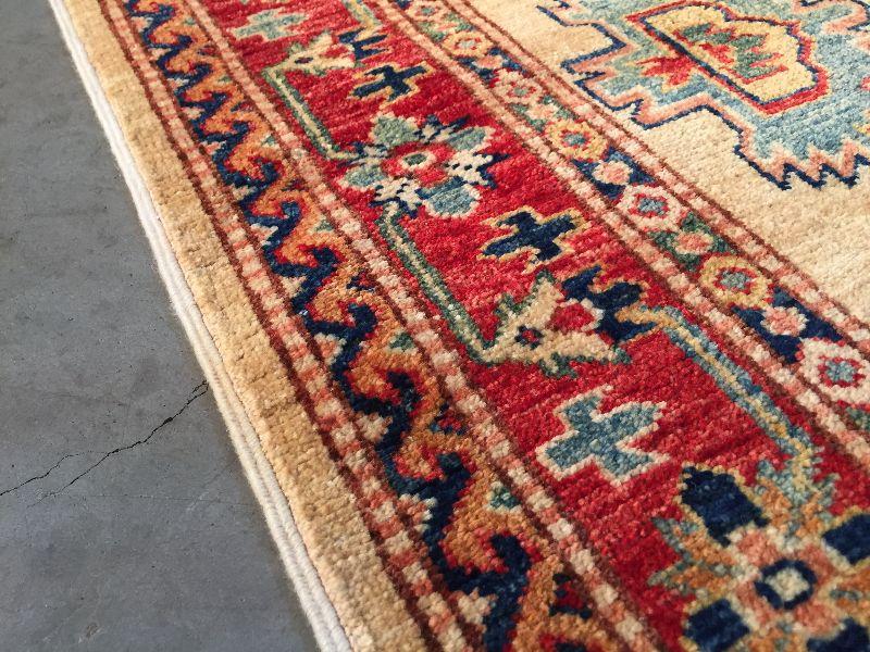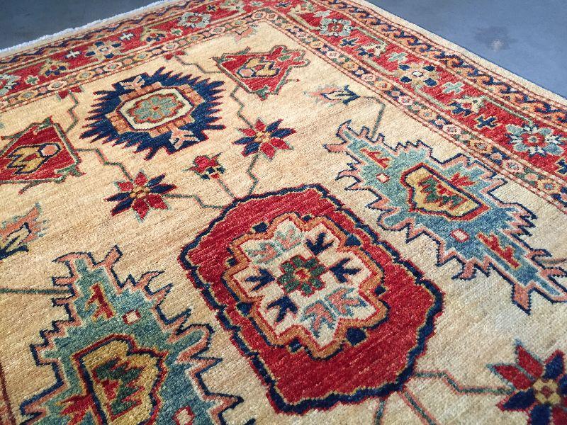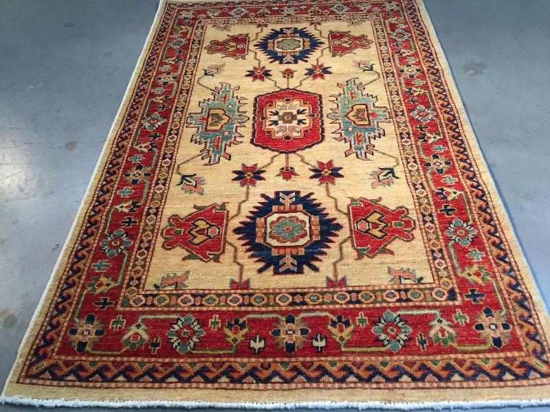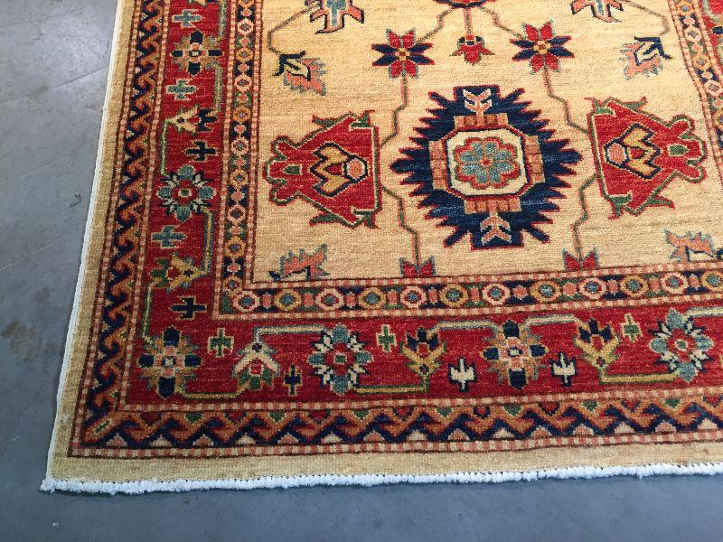 3.1 x 5'.3" AUTHENTIC SUPER QUALITY KAZAK RUG IN CLASSIC TAN, , RED AND MULTI ACCENT COLORS HAND KNOTTED AND VEGGY DYE NATURAL HAND SPUN WOOL , HAND KNOTTED IN PAKISTAN