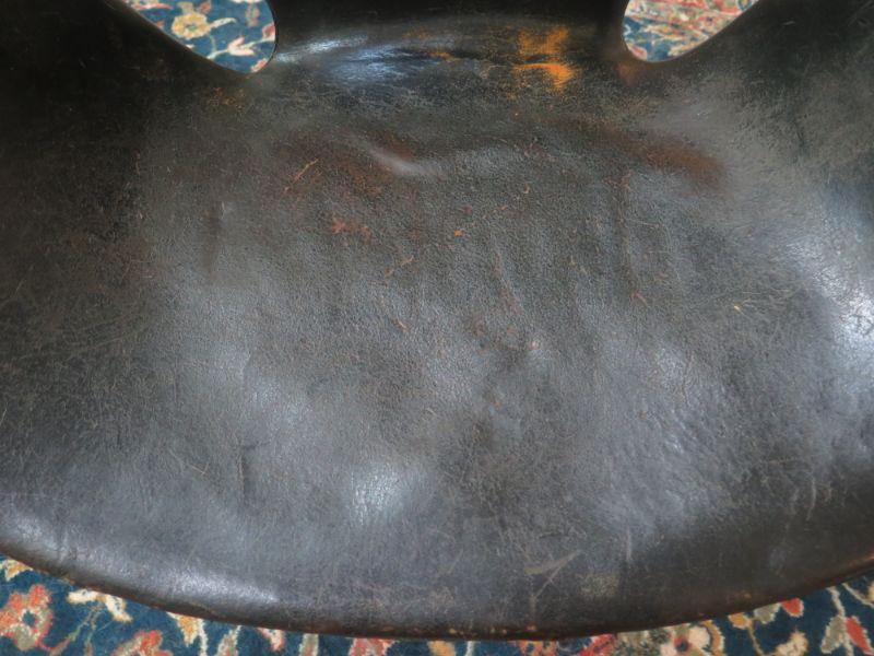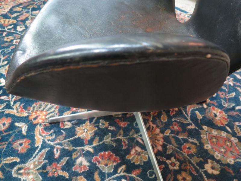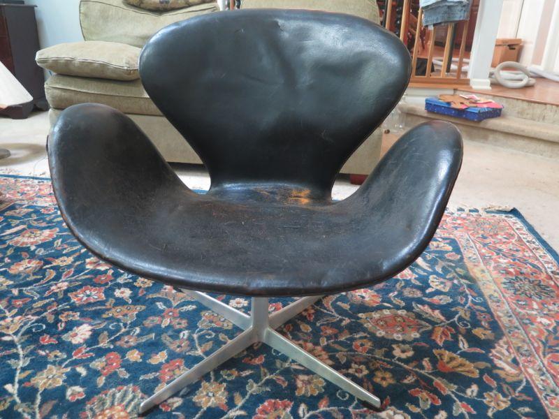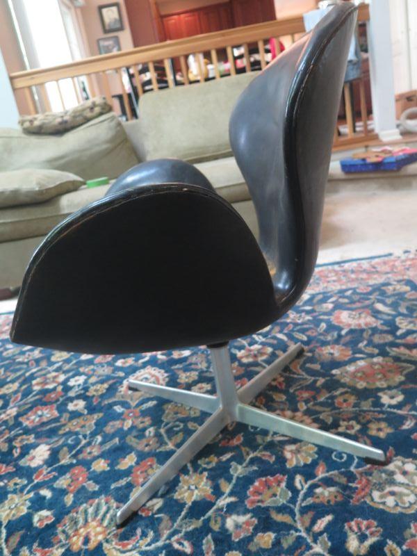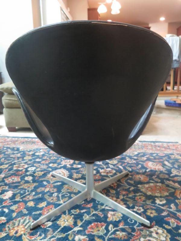 Authentic Vintage Fritz Hansen Black Leather Swan Chair! Own an original! Leather needs a little work, but this is an awesome chair! **Please read Terms and Conditions before placing a bid. Pick up is Sunday, September 1, 2019 from 10am to 4pm in Williamstown. All sales are final. All sales are as is, where is. Please review all photos. Any props included in photos are not included in listing. All measurements are approximate. Comes from home with cats.