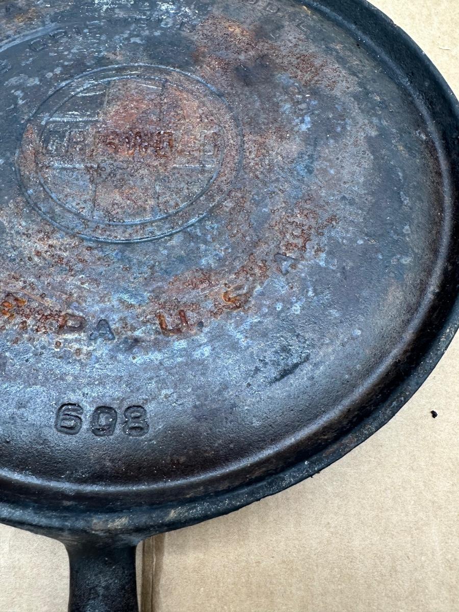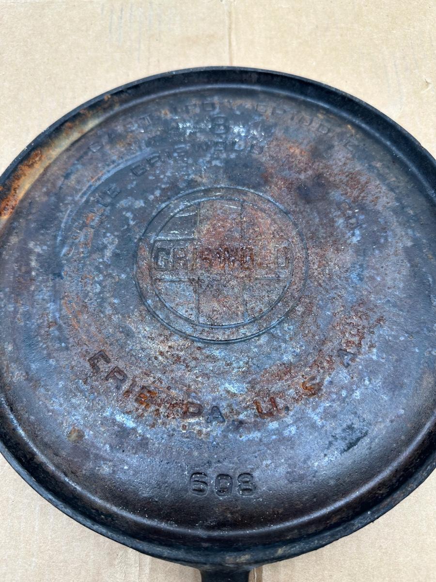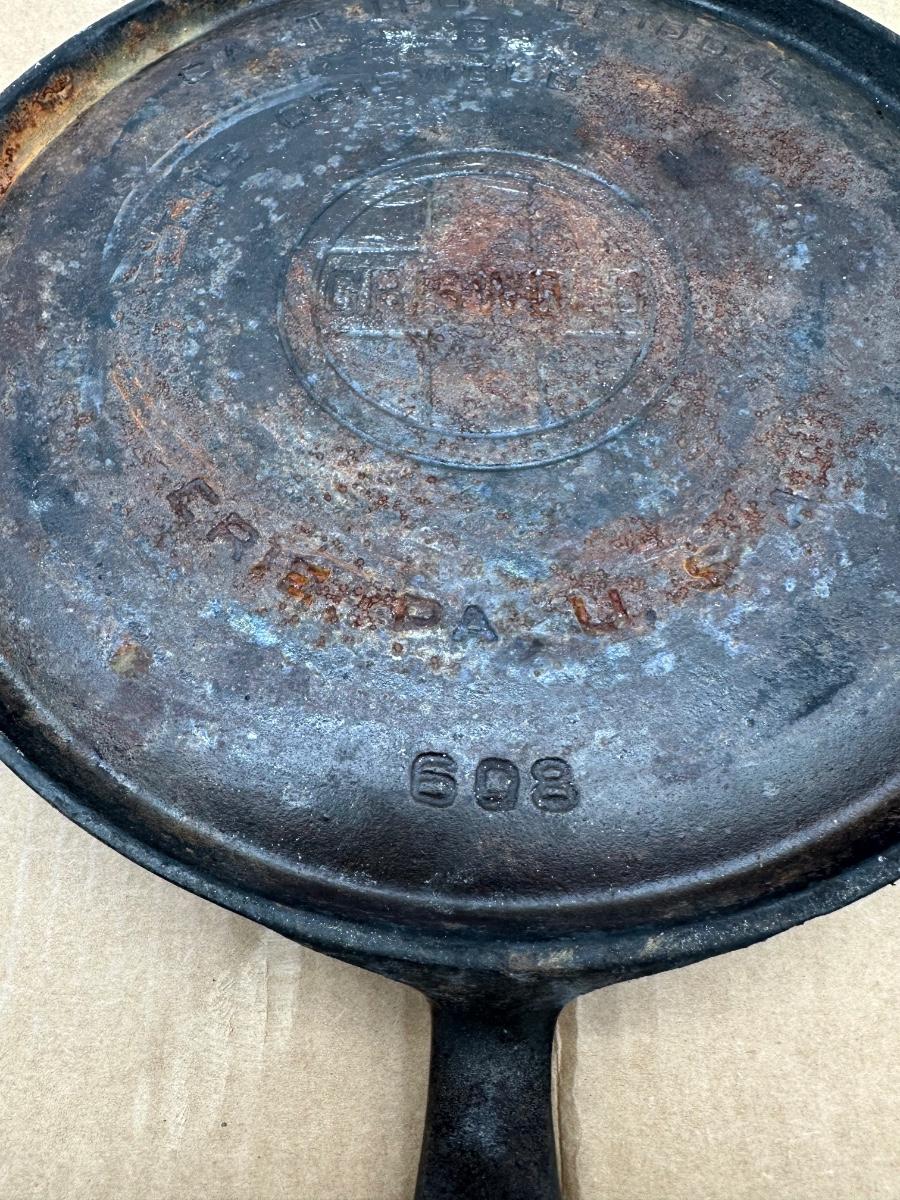 Authentic vintage Griswold cast iron skillet, marked “Griswold” in a circle cross logo, “Erie, PA, U.S.A.”, number 608.