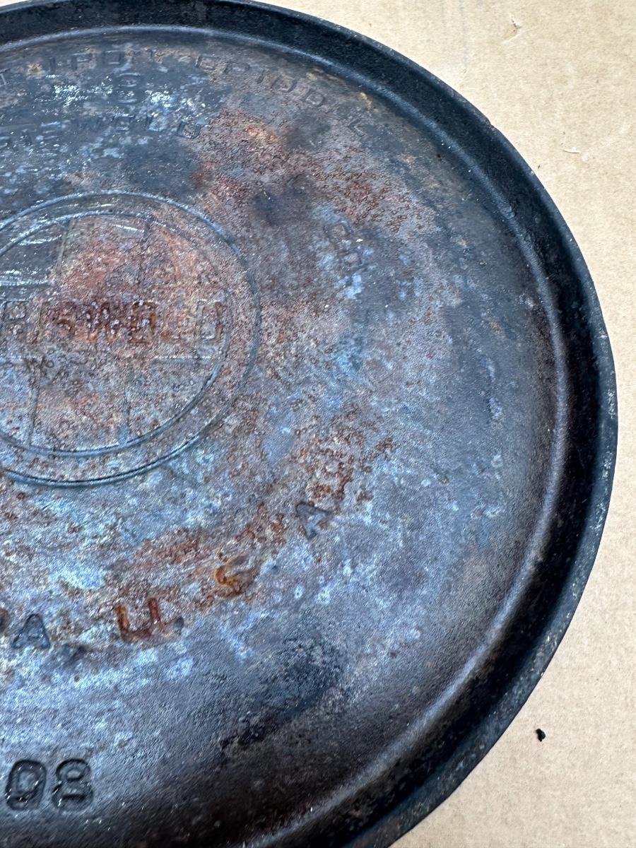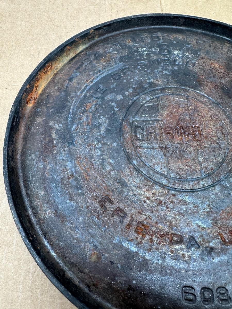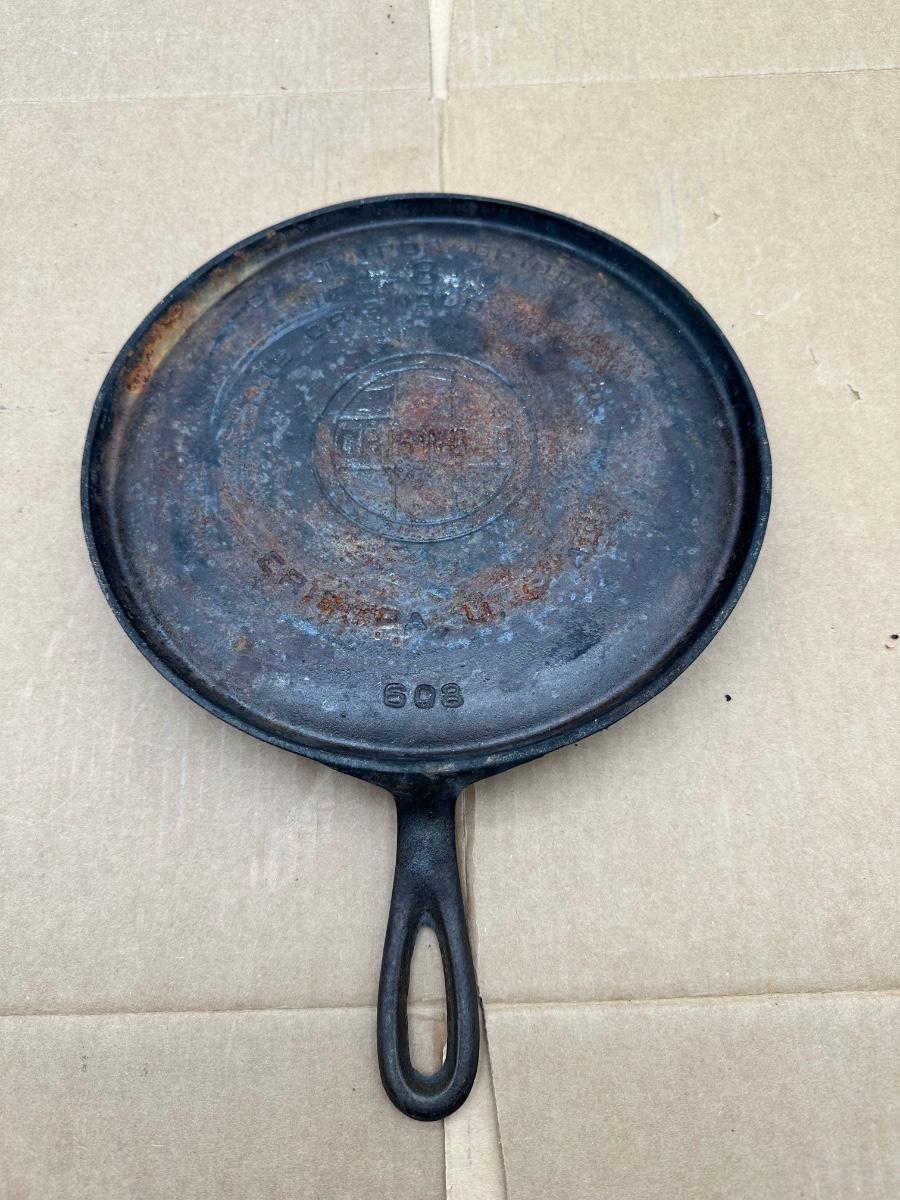 Authentic vintage Griswold cast iron skillet, marked “Griswold” in a circle cross logo, “Erie, PA, U.S.A.”, number 608.