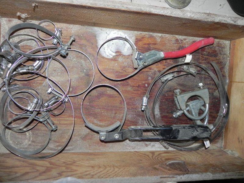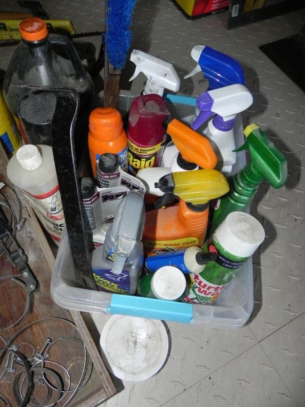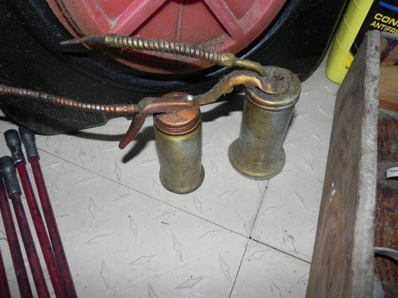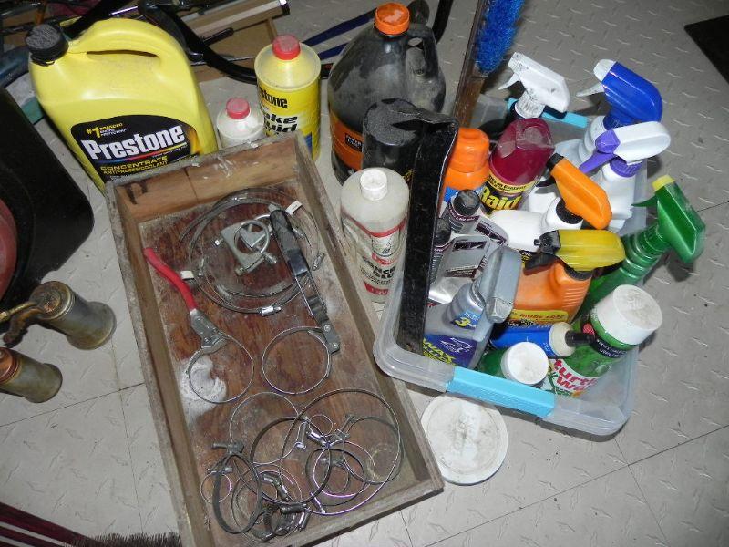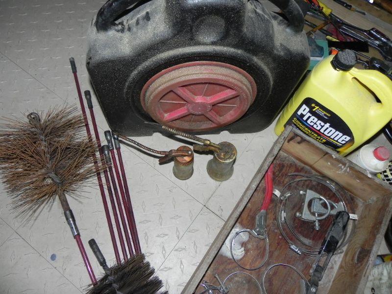 USED OIL COLLECTION CONTAINER, HOSE CLAMPS, VINTAGE OIL CANS, CHEMICALS AND 2 CHIMNEY SWEEPS
