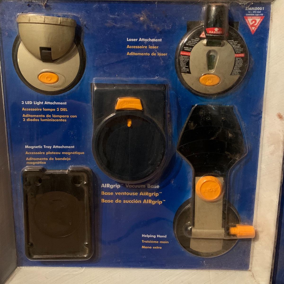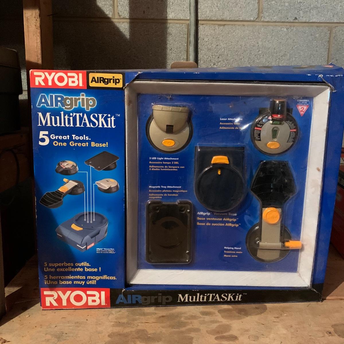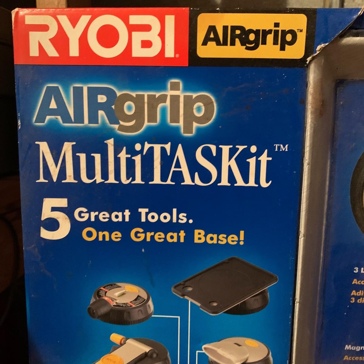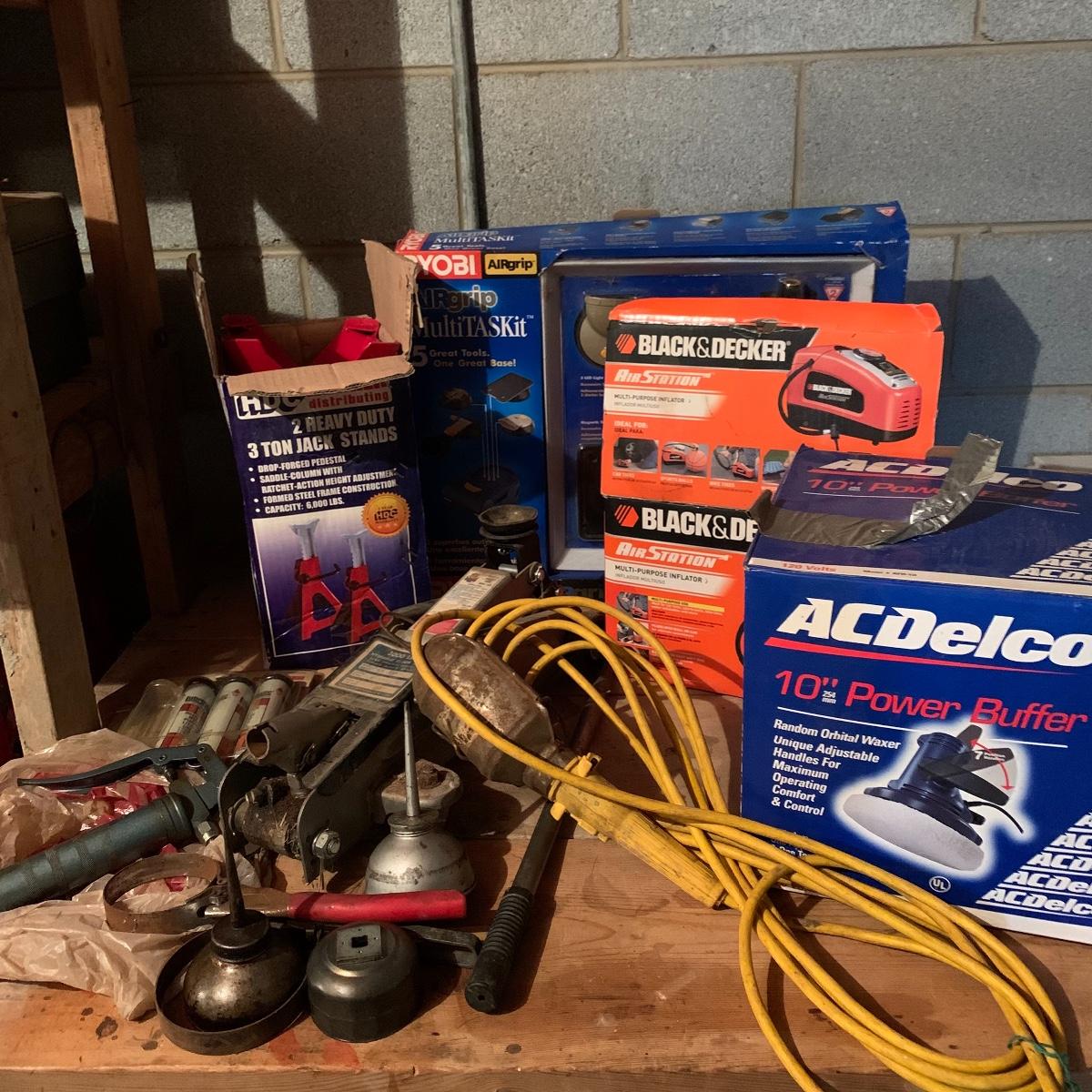This lot includes: a Ryobi Airgrip MultiTASKit set of five tools with one base, a Black & Decker Air Station Multi-Purpose Inflator, two heavy duty three ton Jack stands, a 3000 lb. hydraulic floor jack, an ACDelco 10” Power Buffer, a light, three tubes of Lubrimatic Heavy Duty Multi-Purpose Lithium Grease, and a few other metal tools (see pictures). All electrical items powered on when plugged in. Everything appears to be in used, but good working condition. Local pickup only.