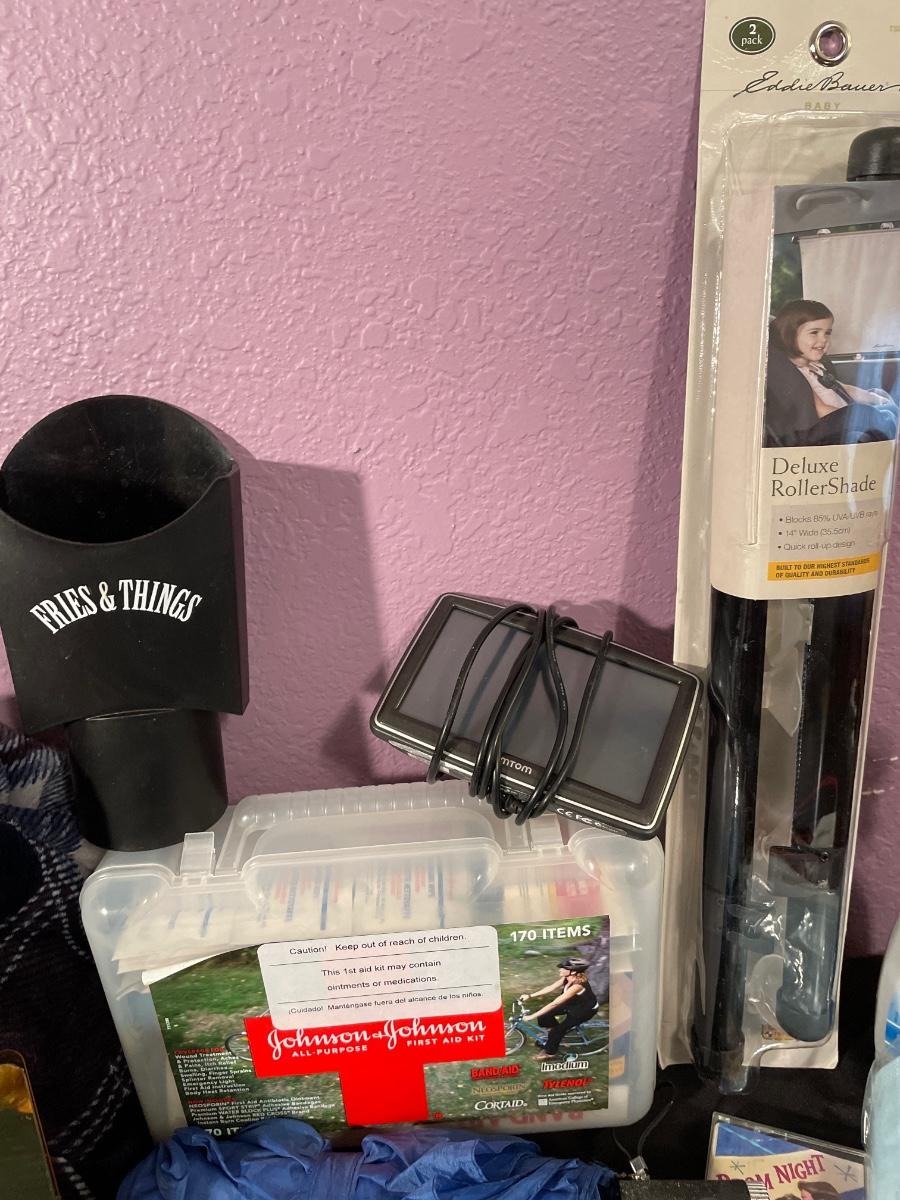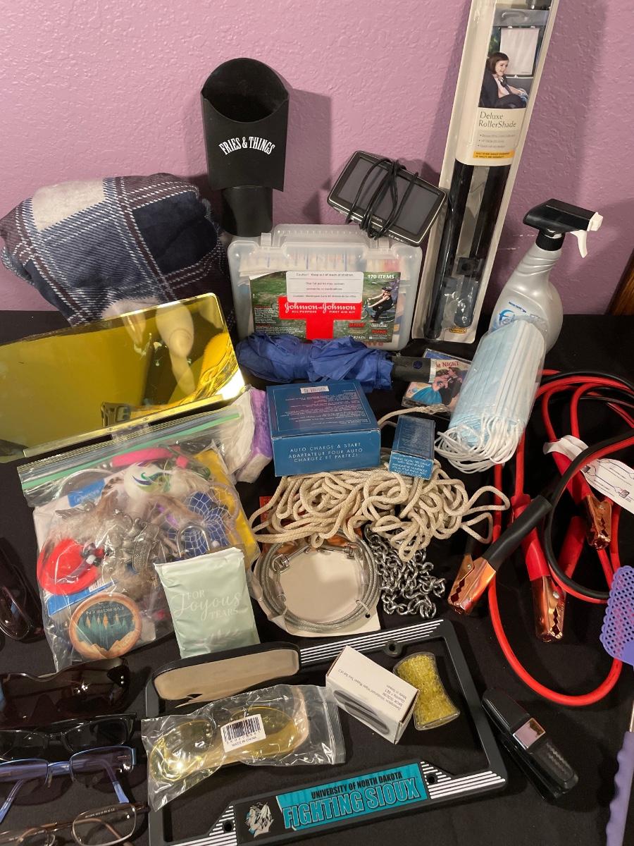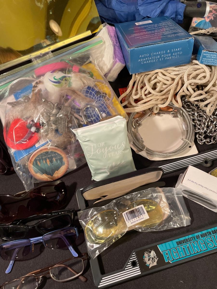 First aid kit, jumper cables, UND plate holder, visor blocker, etc