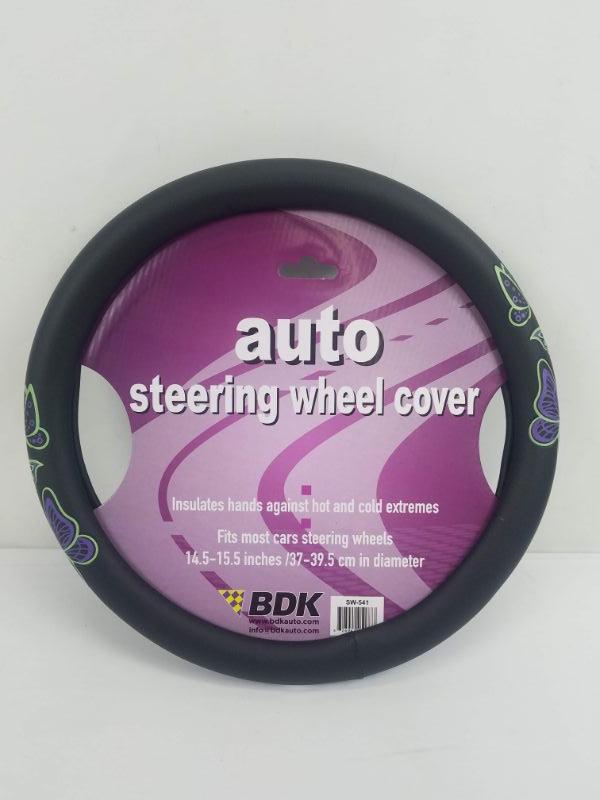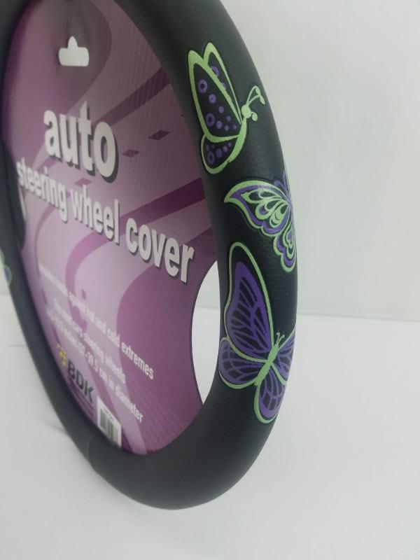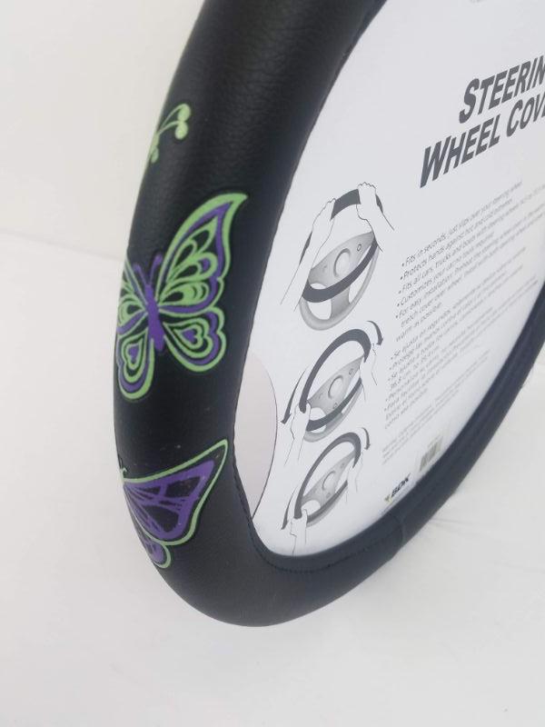 Auto Steering Wheel Cover, Black with Purple & Green Butterflies - New