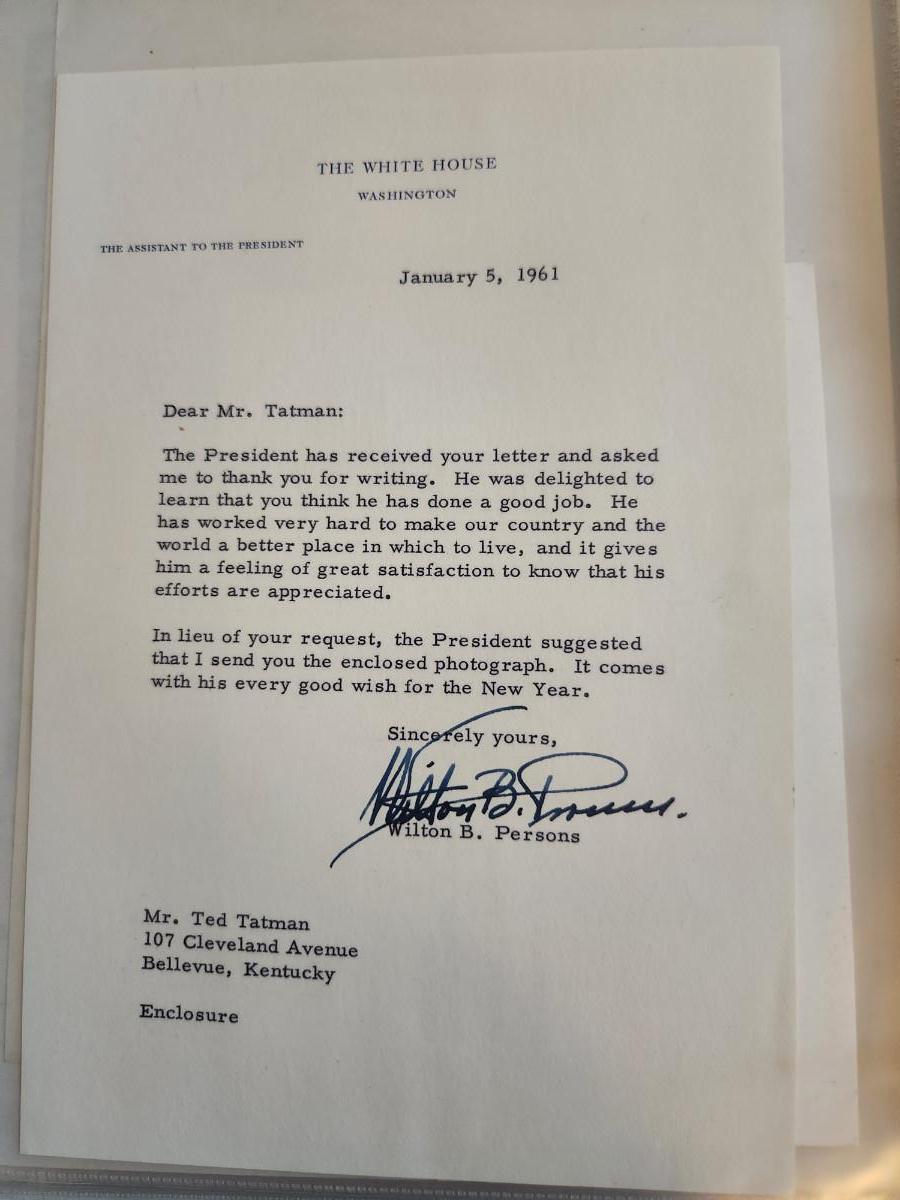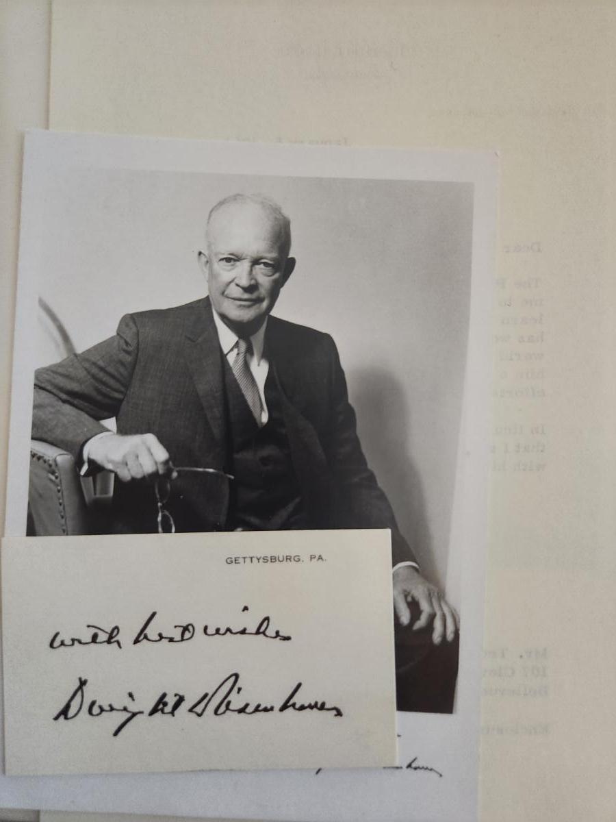 This auction lot is for an Autograph and Photograph of President Eisenhower and a letter from one of the President's assistants. The signed card states Gettysburg, PA - was it signed before his term ended on stock that would be used later? The photograph was mailed just prior to his departure from the Oval Office 15 days from the date of the letter which accompanied.