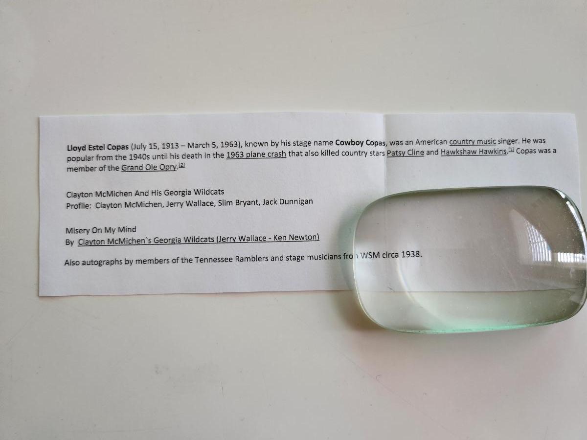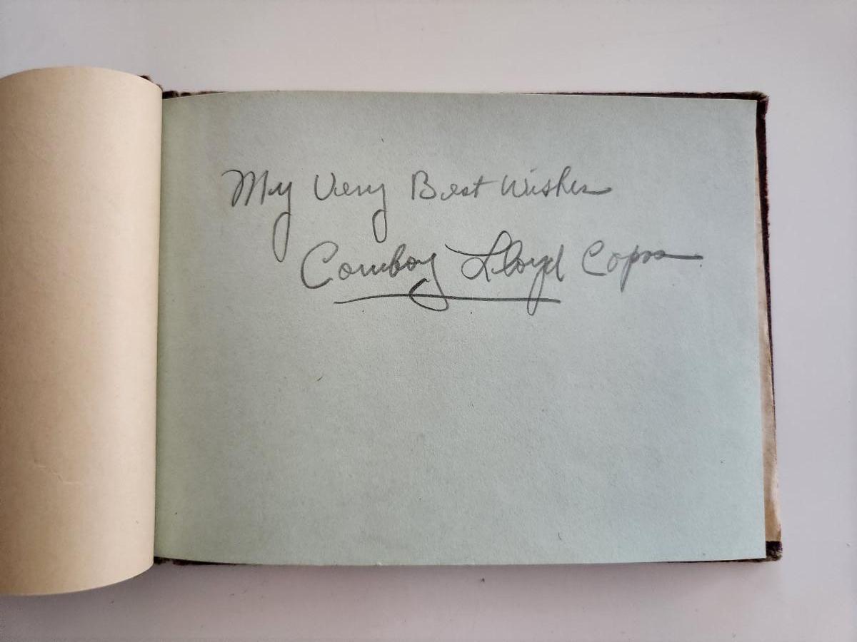 This auction lot is for an Autograph Book of 1930s Cowboy Music Stars. In the time before TV, these Radio Country Music Stars where "the" big thing. This book contains signatures from the "Georgia Wildcats", "Tennessee Ramblers" and others. The biggest name within is Lloyd Estel Copas who died in the same plane crash as Patsy Cline in 1963.