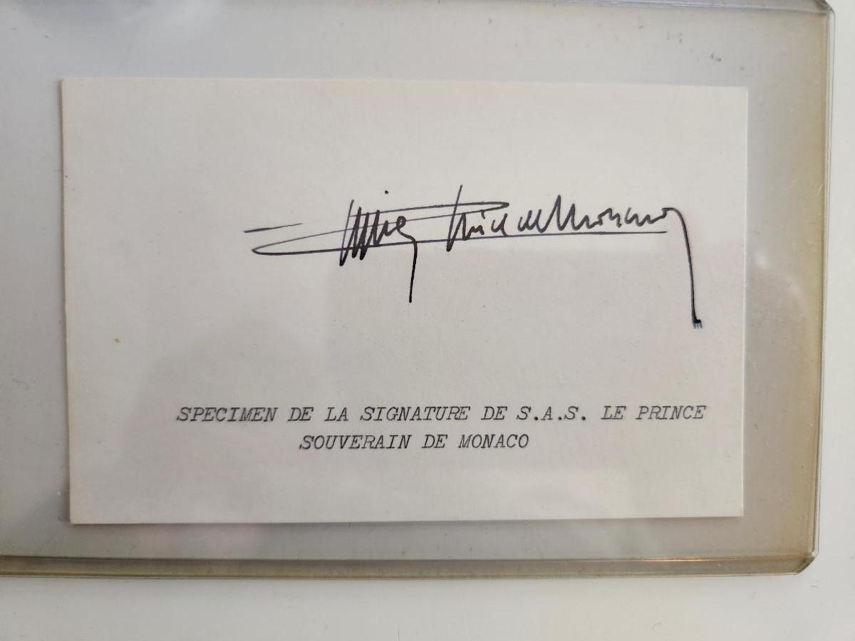 This auction lot is for an Autograph of Prince Ranier III of Monaco. This "specimen" card appears to be holding an authentic signature of the now deceased Royal. Rainier III (Rainier Louis Henri Maxence Bertrand Grimaldi. (31 May 1923 ““ 6 April 2005) was Prince of Monaco from 1949 to his death in 2005. Rainier ruled the Principality of Monaco for almost 56 years and married the American Movie Starlet Grace Kelly.