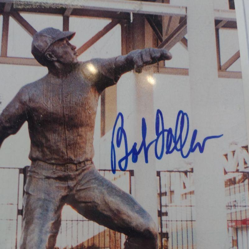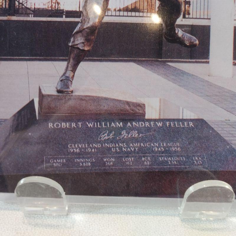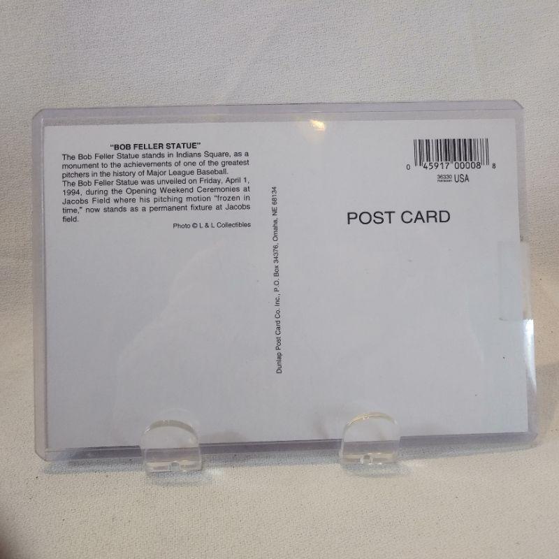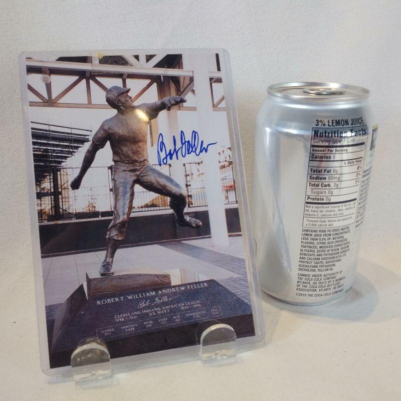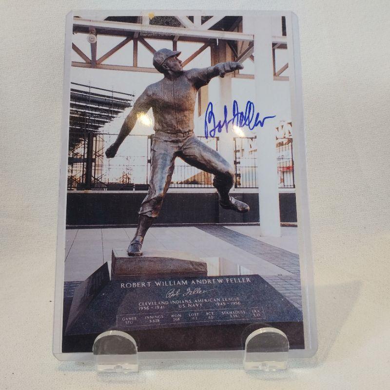 A nice photo post card authentically signed by Bob Feller. Photo is of his statue at Progressive Field in Cleveland, OH. Post card has been in a protected heavy plastic sleeve and is in very good condition. Overall size is 4 1/2-inches wide X 6 1/2-inches tall.