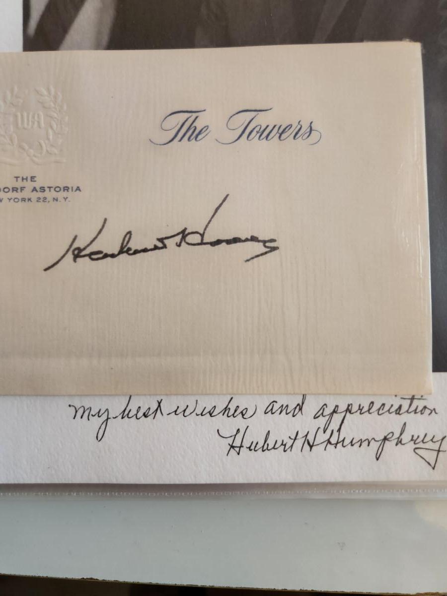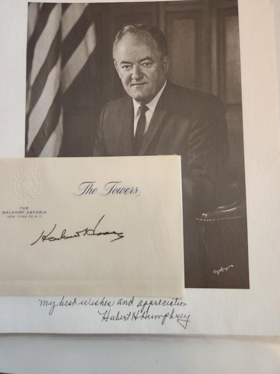 This auction lot is for a Autograph, Photograph and Note From Vice-President Hubert Humphry. The photograph has a printed signature as does the note from the Vice-President. The signature card from the Towers at the Waldorf-Astoria appears quite authentic.